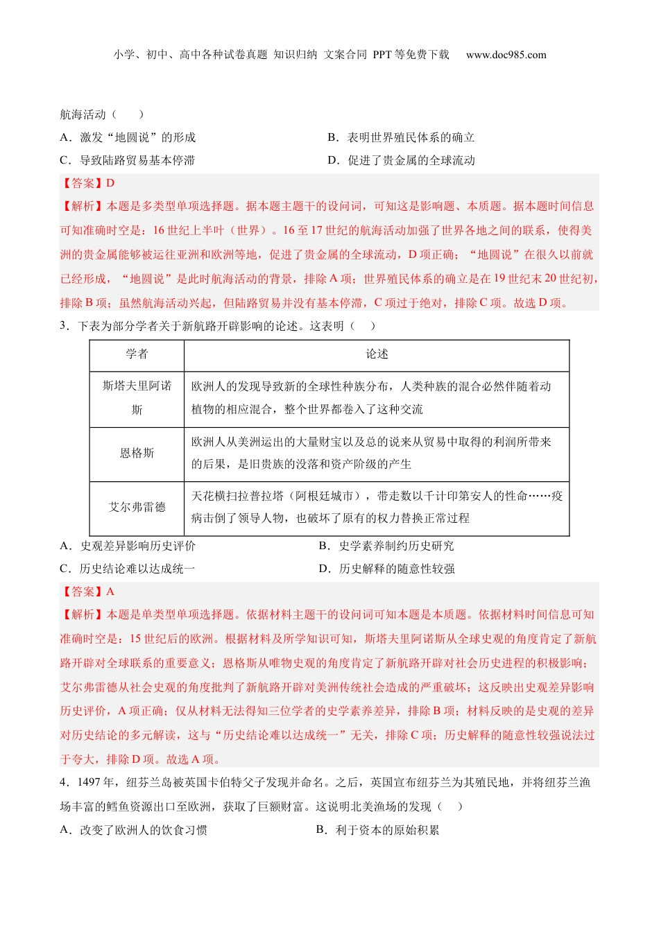 小学、初中、高中各种试卷真题知识归纳文案合同PPT等免费下载www.doc985.com单元14走向整体的世界考点巩固卷考点01全球航路的开辟(T1-4限时:4分钟)考点02全球联系的初步建立与世界格局的演变(T5-22限时:23分钟)考点03考点综合(T23-25限时:30分钟)全球航路的开辟1.有学者认为15~16世纪,“全球仍是一个碎片化的世界,欧亚大陆、非洲、美洲和尚未为人所知的大洋洲,在整体上延续着此前漫长时期的状态。即便西欧,也是更多地保留着‘中世纪’的状态。”因此将该时期视为是一个更接近“古代”而不是“现代”的过渡阶段。该学者强调()A.需重新审视地理大发现的作用B.历史时期的划分难以形成定论C.中世纪对世界历史的影响深远D.需转换视角再认识该时期历史【答案】D【解析】本题是单类型单项选择题。依据材料主题干的设问词可知本题是推断题。依据材料时间信息可知准确时空是:15-16世纪的世界。依据材料概括可知:该学者认为15-16世纪的世界更多的延续着封建时期的状态,即使是欧洲也更多的保留着封建因素,所以更倾向于古代而非近代,与传统认为此时以走入近代有所不同,说明作者强调需转换视角再认识该时期历史,D项正确;材料意图在说明15-16世纪封建因素占主体,而非否定地理大发现的作用,排除A项;历史时期的划分难以形成定论,叙述错误,不符合史实,排除B项;材料未强调中世纪的历史影响,而是说此时还处于中世纪向现代的过渡阶段,排除C项。故选D项。2.(2024·新课标卷)16世纪上半叶,航海家在太平洋开发了连接美洲和亚洲的东风带海上走廊,中后期利用日本洋流从菲律宾群岛航行至美洲西海岸;17世纪初,荷兰人利用西风带环球航行。16至17世纪的小学、初中、高中各种试卷真题知识归纳文案合同PPT等免费下载www.doc985.com航海活动()A.激发“地圆说”的形成B.表明世界殖民体系的确立C.导致陆路贸易基本停滞D.促进了贵金属的全球流动【答案】D【解析】本题是多类型单项选择题。据本题主题干的设问词,可知这是影响题、本质题。据本题时间信息可知准确时空是:16世纪上半叶(世界)。16至17世纪的航海活动加强了世界各地之间的联系,使得美洲的贵金属能够被运往亚洲和欧洲等地,促进了贵金属的全球流动,D项正确;“地圆说”在很久以前就已经形成,“地圆说”是此时航海活动的背景,排除A项;世界殖民体系的确立是在19世纪末20世纪初,排除B项;虽然航海活动兴起,但陆路贸易并没有基本停滞,C项过于绝对,排除C项。故选D项。3.下表为部分学者关于新航路开辟影响的论述。这表明()学者论述斯塔夫里阿诺斯欧洲人的发现导致新的全球性种族分布,人类种族的混合必然伴随着动植物的相应混合,整个世界都卷入了这种交流恩格斯欧洲人从美洲运出的大量财宝以及总的说来从贸易中取得的利润所带来的后果,是旧贵族的没落和资产阶级的产生艾尔弗雷德天花横扫拉普拉塔(阿根廷城市),带走数以千计印第安人的性命……疫病击倒了领导人物,也破坏了原有的权力替换正常过程A.史观差异影响历史评价B.史学素养制约历史研究C.历史结论难以达成统一D.历史解释的随意性较强【答案】A【解析】本题是单类型单项选择题。依据材料主题干的设问词可知本题是本质题。依据材料时间信息可知准确时空是:15世纪后的欧洲。根据材料及所学知识可知,斯塔夫里阿诺斯从全球史观的角度肯定了新航路开辟对全球联系的重要意义;恩格斯从唯物史观的角度肯定了新航路开辟对社会历史进程的积极影响;艾尔弗雷德从社会史观的角度批判了新航路开辟对美洲传统社会造成的严重破坏;这反映出史观差异影响历史评价,A项正确;仅从材料无法得知三位学者的史学素养差异,排除B项;材料反映的是史观的差异对历史结论的多元解读,这与“历史结论难以达成统一”无关,排除C项;历史解释的随意性较强说法过于夸大,排除D项。故选A项。4.1497年,纽芬兰岛被英国卡伯特父子发现并命名。之后,英国宣布纽芬兰为其殖民地,并将纽芬兰渔场丰富的鳕鱼资源出口至欧洲,获取了巨额财富。这说明北美渔场的发现()A.改变了欧洲人的饮食习惯B.利于资本的原始积累小学、初中、高中各种试卷真题知识归纳文案合...