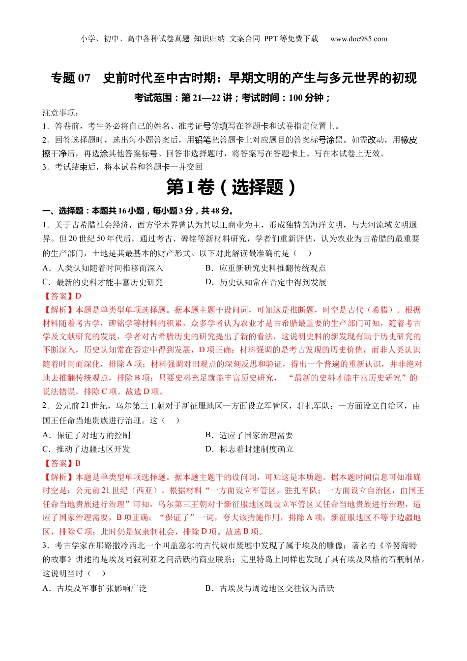 小学、初中、高中各种试卷真题知识归纳文案合同PPT等免费下载www.doc985.com专题07史前时代至中古时期:早期文明的产生与多元世界的初现考试范围:第21—22讲;考试时间:100分钟;注意事项:1.答卷前,考生务必将自己的姓名、准考证等写在答题和试卷指定位置上。号填卡2.回答选择题时,选出每小题答案后,用把答题上对应题目的答案标黑。如需动,用铅笔卡号涂改橡皮干后,再选其他答案标。回答非选择题时,将答案写在答题上。写在本试卷上无效。擦净涂号卡3.考试结后,将本试卷和答题一并交回束卡第I卷(选择题)一、选择题:本题共16小题,每小题3分,共48分。1.关于古希腊社会经济,西方学术界曾认为其以工商业为主,形成独特的海洋文明,与大河流域文明迥异。但20世纪50年代后,通过考古、碑铭等新材料研究,学者们重新评估,认为农业为古希腊的最重要的生产部门,土地是其最基本的财产形式。以下对此解读最准确的是()A.人类认知随着时间推移而深入B.应重新研究史料推翻传统观点C.最新的史料才能丰富历史研究D.历史认知常在否定中得到发展【答案】D【解析】本题是单类型单项选择题。据本题主题干设问词,可知这是推断题,时空是古代(希腊)。根据材料随着考古学,碑铭学等材料的积累,众多学者认为农业才是古希腊最重要的生产部门可知,随着考古学及文献研究的发展,学者对古希腊历史的研究提出了新的看法,这说明史料的新发现有助于历史研究的不断深入,历史认知常在否定中得到发展,D项正确;材料强调的是考古发现的历史价值,而非人类认识随着时间而深化,排除A项;材料强调对旧观点的深刻反思和验证,得出一个普遍的重新认识,并非绝对地去推翻传统观点,排除B项;只要史料充足就能丰富历史研究,“最新的史料才能丰富历史研究”的说法错误,排除C项。故选D项。2.公元前21世纪,乌尔第三王朝对于新征服地区一方面设立军管区,驻扎军队;一方面设立自治区,由国王任命当地贵族进行治理。这()A.保证了对地方的控制B.适应了国家治理需要C.推动了边疆地区开发D.标志着封建制度确立【答案】B【解析】本题是单类型单项选择题。据本题主题干的设问词,可知这是本质题。据本题时间信息可知准确时空是:公元前21世纪(西亚)。根据材料“一方面设立军管区,驻扎军队;一方面设立自治区,由国王任命当地贵族进行治理”可知,乌尔第三王朝对于新征服地区既设立军管区又任命当地贵族进行治理,适应了国家治理需要,B项正确;“保证了”一词,夸大该措施作用,排除A项;新征服地区不等于边疆地区,排除C项;此时仍是奴隶制社会,排除D项。故选B项。3.考古学家在耶路撒冷西北一个叫盖塞尔的古代城市废墟中发现了属于埃及的雕像;著名的《辛努海特的故事》讲述的是埃及同叙利亚之间活跃的商业联系;克里特岛上同样也发现了具有埃及风格的石瓶制品。这说明当时()A.古埃及军事扩张影响广泛B.古埃及与周边地区交往较为活跃小学、初中、高中各种试卷真题知识归纳文案合同PPT等免费下载www.doc985.comC.对外战争传播了古埃及文明D.古埃及文明在交流中融合创新【答案】B【解析】本题是单类型单选题,据题干设问词可知是本质题,据材料时间信息得出准确时空是古埃及。根据材料,古埃及与当时的叙利亚有商业联系,克里特岛上也出现了具有埃及风格的东西,说明当时埃及与周边地区的交往比较活跃,B项正确;材料没涉及埃及军事扩张,排除A项;古埃及与周边地区的联系不一定是通过战争,排除C项;材料中只是文化的交流,看不出融合创新,排除D项。故选B项。4.笈多帝国统治时期国王多次颁布赐地文书,政府放弃所赠土地的行政司法主权,以及土地上一切森林、牧场、矿藏、人口。东晋法显的《佛国记》中也提到颁赐土地上的民户皆随土地转移,并且另有自由农民,他们耕种王地,缴纳租税,欲去便去,欲往便往。这反映出笈多帝国()A.专制王权强化B.商品经济繁荣C.等级制度强化D.生产关系变革【答案】D【解析】本题是单类型单项选择题。据本题主题干的设问词,可知这是本质题。据本题时间信息可知准确时空是:古代(世界)。材料提到了自由农民的存在,他们耕种王地,缴纳租...