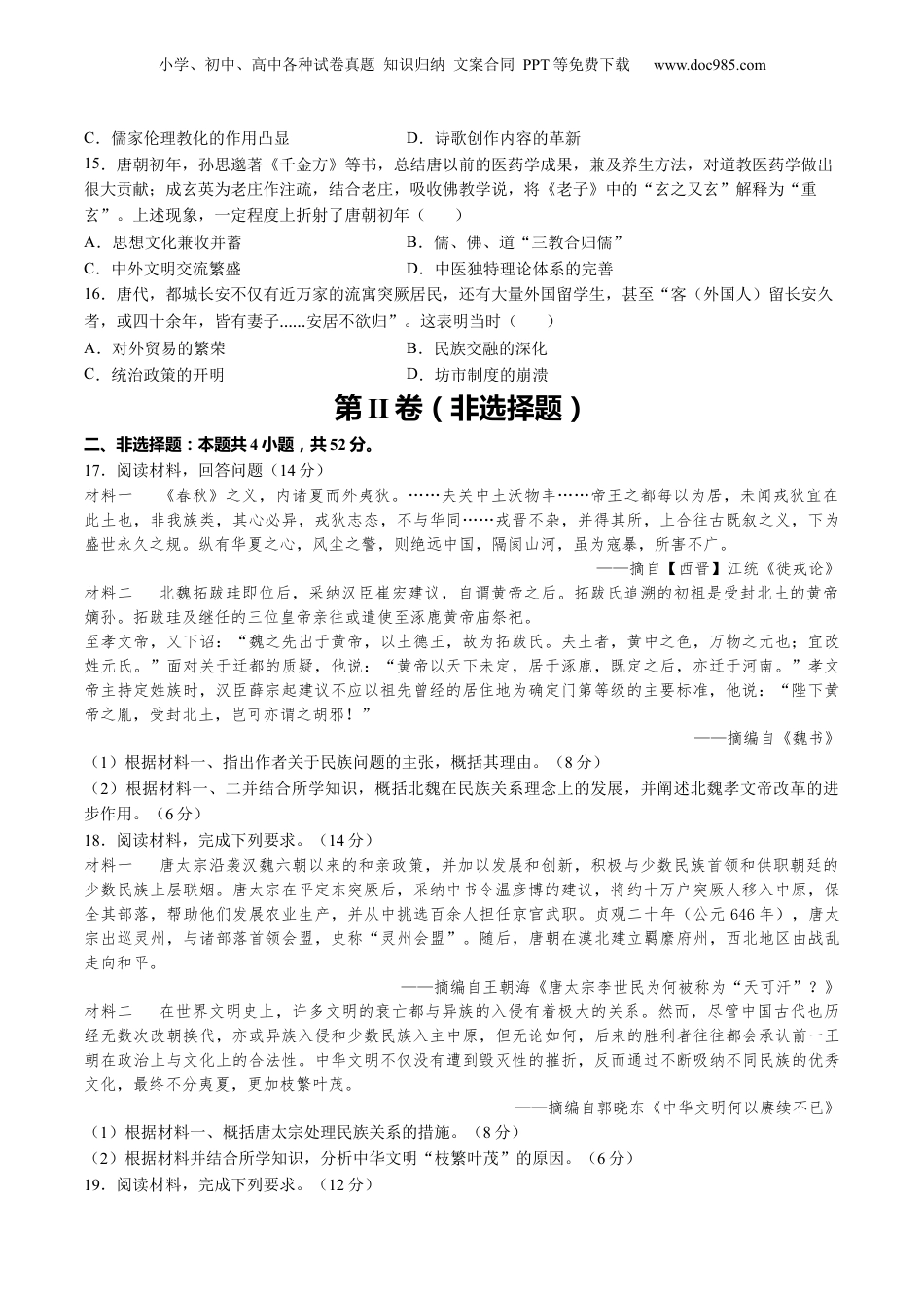 小学、初中、高中各种试卷真题知识归纳文案合同PPT等免费下载www.doc985.com专题02魏晋至隋唐:民族交融与统一多民族封建国家的发展考试范围:第4—5讲;考试时间:100分钟;注意事:项1.答卷前,生务将自己的名、准号等在答题和试卷指定位置上。考必姓考证填写卡2.回答选题时,选出小题答案后,用笔答题上对应题目的答案标号。如改动,用择每铅把卡涂黑需橡皮干后,再选其他答案标号。回答非选题时,将答案在答题上。在本试卷上无效。擦净涂择写卡写3.试结束后,将本试卷和答题一并交回考卡第I卷(选择题)一、选择题:本题共16小题,每小题3分,共48分。1.关于政权更迭,西晋刘颂认为是“天地之位始定,四海洗心整纲之会”。他还指出,魏晋更迭用“禅让”,未能“洗心整纲”,晋廷所依靠的仍是“先代功臣之胤,非其子孙,则其曾玄。”据此可知,刘颂意在强调魏晋“禅让”()A.助长了士族政治发展B.遏制了官僚集团腐败C.实现了政权和平转移D.延续了前代治国经验2.图1、图2分别是汉武帝时期和南北朝时期农牧分界线。两个时期农牧分界线的变化说明()A.政局变化影响经济格局B.民族迁徙促进江南开发C.传统农耕经济渐趋衰退D.气候变迁导致牧强农弱3.西晋建立国子学,专门吸收五品以上子弟入学,导致“举贤不出世族,用法不及权贵,是以才不济务,奸无所惩”的局面出现;南朝梁武帝时,“诏开五馆,建立国学”“五馆生皆引寒门俊才,不限人数”。据此可推断出()A.江南经济的发展B.门阀士族的衰落趋势C.社会阶层的固化D.魏晋选官制度的变化4.《晋书·慕容廆载记》:“廆以大棘城(注:前燕早期都城)即帝颛顼之墟也,元康四年乃移居之,教以农桑,法制同于上国流亡士庶多襁负归之。廆乃立郡以统流人。”该史料可用作研究(……)A.少数民族对中原政权的向往B.民族交融与江南经济的开发C.人口迁徙与边疆地区封建化D.少数民族政权因俗而治政策5.据《隋书》记述:文帝时左藏(国库之一)所贮为钱帛、什彩,大抵是从天下赋调中取得;而右藏(亦国库之一)所贮的金玉、珠宝等物,有的是在市场交易中取得,更多的则是来自地方官员从民间征收的贡纳。这种做法到炀帝时变本加厉。由此可知,隋朝()A.租调制度遭到严重破坏B.重农抑商的政策已经松弛小学、初中、高中各种试卷真题知识归纳文案合同PPT等免费下载www.doc985.comC.基层治理取得明显成效D.民众承担的法外赋税沉重6.唐朝初年大力奖赏军功,军功入仕成为这一时期的升迁捷径。当时的一些功臣武将还能够进入决策阶层,充任宰相,如李靖、李勤、侯君集等。这一现象的出现()A.是统治秩序不稳定的体现B.解决了武将专权的隐患C.与唐初政治军事环境相关D.干扰了科举制度的推行7.唐宋时期,为了鼓励他人合法耕种大量存在的私有逃田,政府制定了专门的《盗耕种法》和《逃田法》。这两部经济法规从保护公私土地产权的角度,以是否交纳赋税作为判决是否盗耕逃田的关键依据。这体现了()A.两税法在推行过程中的灵活B.政府重视对私有田产的保护C.国家财政利益处于优先地位D.抑制兼并与发展生产的并重8.后梁太祖朱温早年参加黄巢起义,投降唐朝后以汴州为据点逐渐扩大势力,后废唐自立建后梁;因镇压黄巢起义有功而获封陇西郡王的李克用长期割据河东,后其子灭后梁建后唐;地方上抵抗起义军的地主土豪武装,后建立南方十国。上述材料主要说明()A.农民起义深刻影响唐末五代政局B.藩镇割据导致了唐朝的土崩瓦解C.唐末战乱推动藩镇割据局面形成D.宋朝的首要任务是消灭农民起义9.隋唐以后,社会精英们大多脱离土地,搬入城市居住,在故乡以外的地方购置房产,死后也不再归葬故乡。造成这一变化的主要原因是()A.安土重迁观念减弱B.商品经济发展繁荣C.选官任官制度变革D.农业赋税负担沉重10.西晋后期,高门士族“贱经尚道”,推崇“放荡越礼”,这种价值观成为中正论人的标准。东晋至南朝,士风转向崇尚文学。陈朝吏部尚书姚察说:“近世取人,多由文史。”该变化说明()A.社会阶层流动加快B.九品中正制度已经瓦解C.士林舆论影响选官D.儒学正统地位得以重建11.唐中宗不经中书、门下而自...