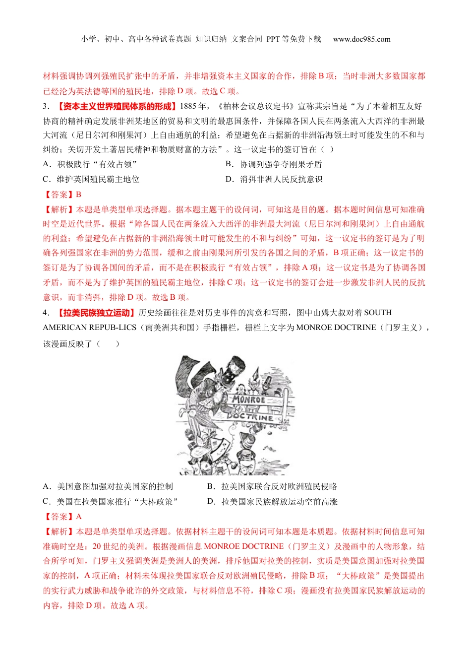 小学、初中、高中各种试卷真题知识归纳文案合同PPT等免费下载www.doc985.com第33讲亚非拉民族独立运动与世界殖民体系的瓦解目录模拟·基础演练...............................................................................................................1重难·创新演练...............................................................................................................1真题·实战演练...............................................................................................................81.【资本主义世界殖民体系的形成】1861年英国人在印度设立“印度星章”,星章拥有者位居英国骑士之列,截至1877年已达数百人。该头衔连同之后设立的“印度帝国勋章”,成为大多数印度人可以期待获得的仅有的欧式荣誉。这些举措()A.激发印度人民掀起反英高潮B.加速印度沦为英国殖民地C.促使了印度种姓制度的瓦解D.强化英印帝国的统治秩序【答案】D【解析】本题是多类型单项选择题。据本题次题干的提示词,可知这是本质题、推断题、影响题。据本题时间信息可知准确时空是19世纪六七十年代的英国和印度。据材料“大多数印度人可以‘期待’获得的仅有的欧式荣誉”并结合所学,这属于思想文化侵略政策,也属于分化瓦解政策,有利于消弭印度人民反侵略的意识和斗争并造成印度人的不团结,强化英印帝国的统治秩序,D项正确;这些举措会起到消弭印度人民斗争意识的作用,排除A项;印度在1858年已沦为英国殖民地,排除B项;印度种姓制度是在1947年被废除的,排除C项。故选D项。2.【资本主义世界殖民体系的形成】1884年,欧美列强在某次会议上规定:“占领非洲沿海新地区的国家必须通知《柏林会议关于非洲的总议定书》的签署各国,同时建立足以有效保护该地区现有各项权利(如确保航运和贸易自由等)的机构”。这一规定旨在()A.镇压亚非拉民族解放运动B.增强资本主义国家的合作C.协调列强殖民扩张的矛盾D.维护非洲各国独立和完整【答案】C【解析】本题是单类型单项选择题。据本题主题干的设问词,可知这是目的题。据本题时间信息可知准确时空是:1884年(欧美)。根据材料“占领非洲沿海新地区的国家必须通知《柏林会议关于非洲的总议定书》的签署各国,同时建立足以有效保护该地区现有各项权利(如确保航运和贸易自由等)的机构”并结合所学可知,该会议是列强在德国柏林召开的瓜分非洲的国际会议,规定任何国家在非洲占领新的土地,必须通知其它国家,占领方为有效,同时要建立相关机构确保该地区现有权利的实现。这一会议和规定的实质是协调列强在殖民扩张中的矛盾,C项正确;材料是针对非洲,没有涉及亚洲、拉丁美洲,排除A项;小学、初中、高中各种试卷真题知识归纳文案合同PPT等免费下载www.doc985.com材料强调协调列强殖民扩张中的矛盾,并非增强资本主义国家的合作,排除B项;当时非洲大多数国家都已经沦为英法德等国的殖民地,排除D项。故选C项。3.【资本主义世界殖民体系的形成】1885年,《柏林会议总议定书》宣称其宗旨是“为了本着相互友好协商的精神确定发展非洲某地区的贸易和文明的最惠国条件,并保障各国人民在两条流入大西洋的非洲最大河流(尼日尔河和刚果河)上自由通航的利益;希望避免在占据新的非洲沿海领土时可能发生的不和与纠纷;关切开发土著居民精神和物质财富的方法”。这一议定书的签订旨在()A.积极践行“有效占领”B.协调列强争夺刚果矛盾C.维护英国殖民霸主地位D.消弭非洲人民反抗意识【答案】B【解析】本题是单类型单项选择题。据本题主题干的设问词,可知这是目的题。据本题时间信息可知准确时空是近代世界。根据“障各国人民在两条流入大西洋的非洲最大河流(尼日尔河和刚果河)上自由通航的利益;希望避免在占据新的非洲沿海领土时可能发生的不和与纠纷”可知,这一议定书的签订是为了明确各列强国家在非洲的势力范围,缓和之前由刚果河所引发的各国之间的矛盾,B项正确;这一议定书的签订是为了协调各国间的矛盾,而不是在积极践行“有效占领”,排除A项;这一议定书是为了协调各国矛盾,而不是为...