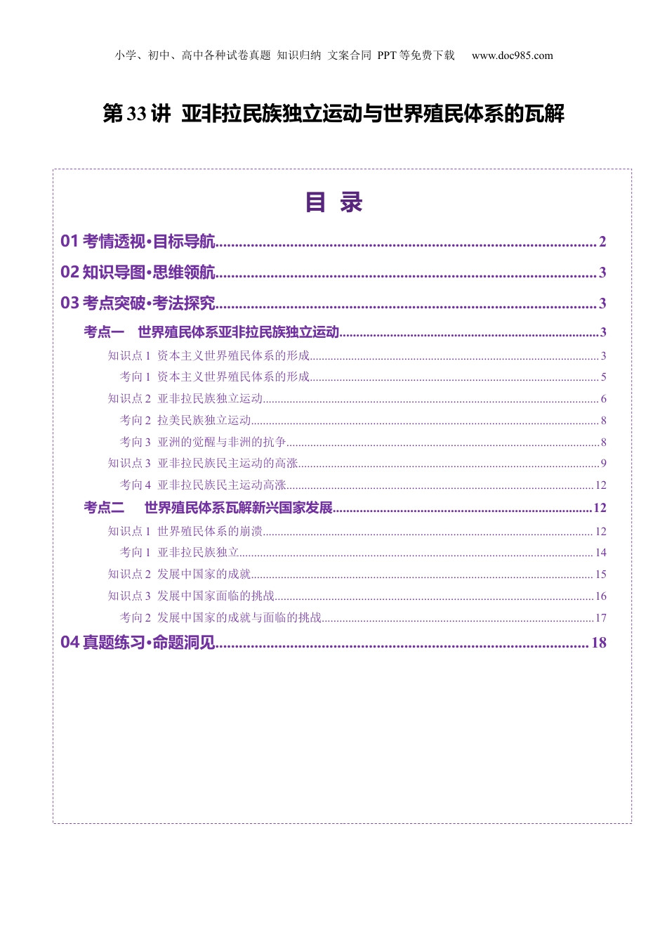 小学、初中、高中各种试卷真题知识归纳文案合同PPT等免费下载www.doc985.com第33讲亚非拉民族独立运动与世界殖民体系的瓦解目录01考情透视·目标导航.................................................................................................202知识导图·思维领航.................................................................................................303考点突破·考法探究.................................................................................................3考点一世界殖民体系亚非拉民族独立运动.............................................................................3知识点1资本主义世界殖民体系的形成..................................................................................................3考向1资本主义世界殖民体系的形成..................................................................................................5知识点2亚非拉民族独立运动.................................................................................................................6考向2拉美民族独立运动.....................................................................................................................8考向3亚洲的觉醒与非洲的抗争.........................................................................................................8知识点3亚非拉民族民主运动的高涨.....................................................................................................9考向4亚非拉民族民主运动高涨.......................................................................................................12考点二世界殖民体系瓦解新兴国家发展.............................................................................12知识点1世界殖民体系的崩溃...............................................................................................................12考向1亚非拉民族独立.......................................................................................................................14知识点2发展中国家的成就...................................................................................................................15知识点3发展中国家面临的挑战...........................................................................................................16考向2发展中国家的成就与面临的挑战............................................................................................1704真题练习·命题洞见...............................................................................................18小学、初中、高中各种试卷真题知识归纳文案合同PPT等免费下载www.doc985.com考点要求考题统计考建议备世界殖民体系与亚非拉民族独立运动(3年13考)2024选择题:重庆卷、广东卷、全国新课标卷非选择题:北京卷本讲为高考命题热点,题型以选择题为主,复习时关注一些命题关键词:民族自决原则、非暴力不合作运动、独立意识觉醒、埃及华夫脱党、埃塞俄比亚抗意斗争、卡德纳斯改革、世界殖民体系、自治领、印巴分治、古巴革命、第三世界、”石油繁荣、亚洲金融危机、国际经济旧秩序、新加坡文化。2023选择题:辽宁月、山东卷、北京卷非选择题:广东卷2022选择题:福建卷、海南卷非选择题:北京卷、浙江卷6月亚非拉民族民主运动高涨(3年3考)2024选择题:广东卷、浙江卷1月2023无2022选择题:山东卷世界殖民体系瓦解与新兴国家发展(3年15考)2024选择题:江苏卷、湖南卷、辽宁卷非选择题:重庆卷、湖南卷、全国甲卷、山东卷、湖北卷2023选择题:重庆卷、福建卷、海南卷、山东卷非选择题:广东卷2022选择题:辽宁卷、山东卷标复目:1、了解拉美殖民地的空间分布,认...