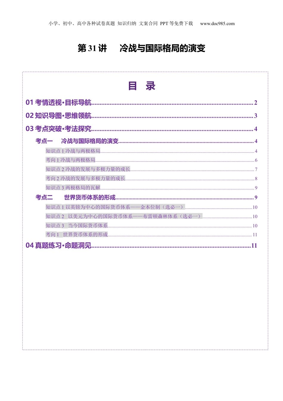 小学、初中、高中各种试卷真题知识归纳文案合同PPT等免费下载www.doc985.com第31讲冷战与国际格局的演变目录01考情透视·目标导航.................................................................................................202知识导图·思维领航.................................................................................................303考点突破·考法探究.................................................................................................4考点一冷战与国际格局的演变...............................................................................................4知识点1冷战与两极格局..........................................................................................................................4考向1冷战与两极格局..............................................................................................................................6知识点2冷战的发展与多极力量的成长...................................................................................................7考向2冷战的发展与多极力量的成长......................................................................................................8知识点3两极格局的瓦解..........................................................................................................................9考点二世界货币体系的形成.................................................................................................9知识点1以英镑为中心的国际货币体系——金本位制(选必一).....................................................10知识点2以美元为中心的国际货币体系——布雷顿森林体系(选必一).......................................10知识点3当今国际货币体系..................................................................................................................10考向1世界货币体系的形成...................................................................................................................1104真题练习·命题洞见................................................................................................11小学、初中、高中各种试卷真题知识归纳文案合同PPT等免费下载www.doc985.com考点要求考题统计考建备议冷战与国际格局的演变(3年15考)2024选择题:全国甲卷非选择题:甘肃卷、湖北卷本讲为高考命题热点,题型以选择题为主,复习时关注一些命题关键词:冷战、国家利益、意识形态、两极格局、“杜鲁门主义”、马歇尔计划、北约、柏林危机、古巴导弹危机、欧共体、不结盟运动、多极化、“和平演变”、东欧剧变、苏联解体。2023选择题:天津卷、河北卷、江苏卷、湖北卷、全国甲卷非选择题:天津卷2022选择题:河北卷、江苏卷、海南卷、广东卷、山东卷、湖南卷世界货币体系的形成(3年3考)2024选择题:全国新课标卷非选择题:安徽卷2023非选择题:湖北卷2022无标复目:1、了解战后美苏冷战格局形成的原因、表现,认识两极格局对世界局势的影响。2、了解20世纪50年代中期以后美苏关系的特点,知道多极化趋势的主要表现。小学、初中、高中各种试卷真题知识归纳文案合同PPT等免费下载www.doc985.com小学、初中、高中各种试卷真题知识归纳文案合同PPT等免费下载www.doc985.com考点一冷战与国际格局的演变知识点1冷战与两极格局1.冷战(1)含义:冷战指20世纪40年代中后期至80年代末90年代初,以美苏为首的两大集团之间既非战争又非和平的长期对峙与竞争状态。(2)原因①美国和苏联这两个社会制度完全不同的超级大国,在消灭了法西斯这个共同敌人之后,战时同盟的基础不复存在。②美苏两国的国家利益存在严重冲突,意识形态也尖锐对立。小学、初中、高中各种试卷真题知识归纳文案合同PPT等免费下载www.doc985.com③美国在全球进...