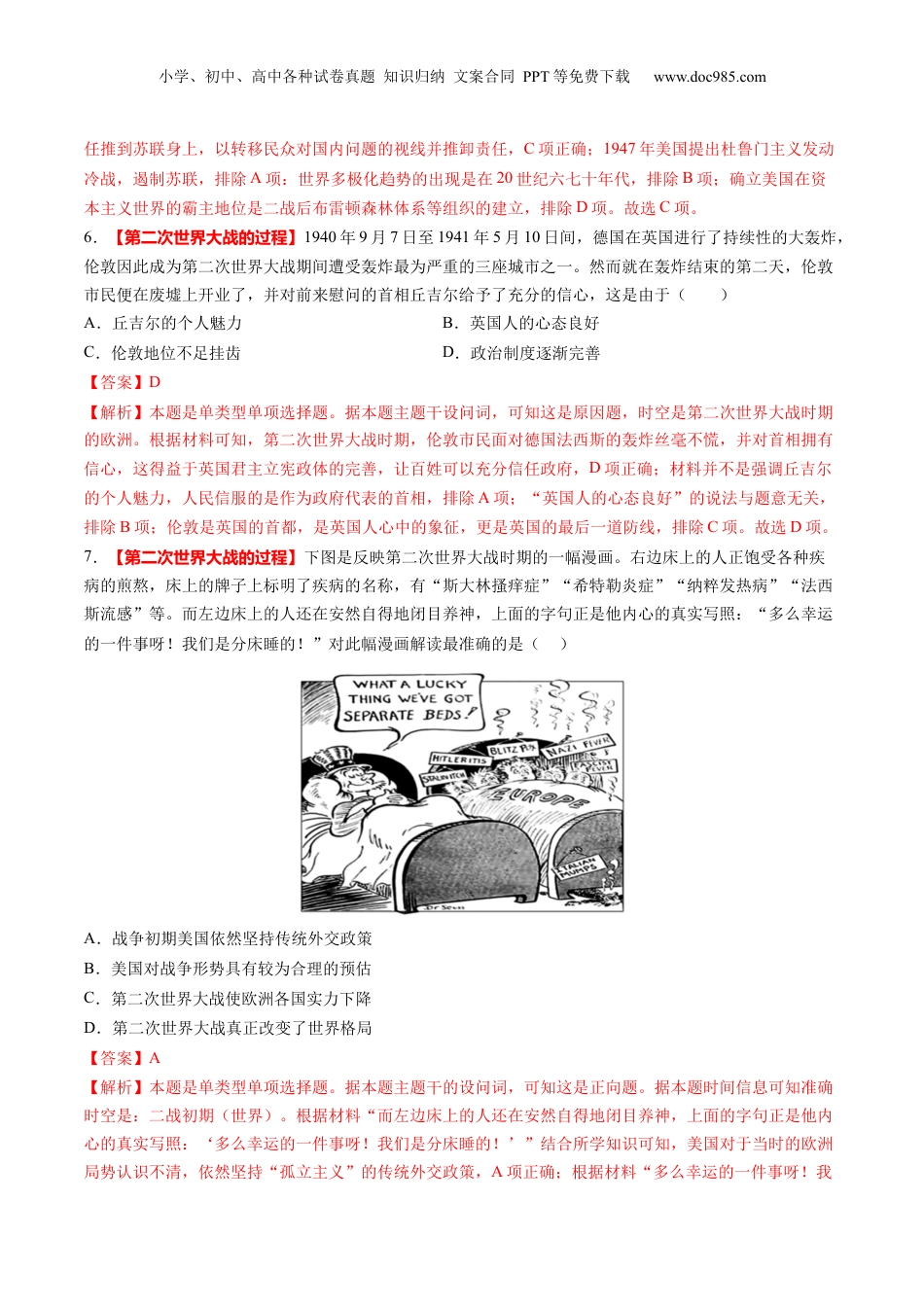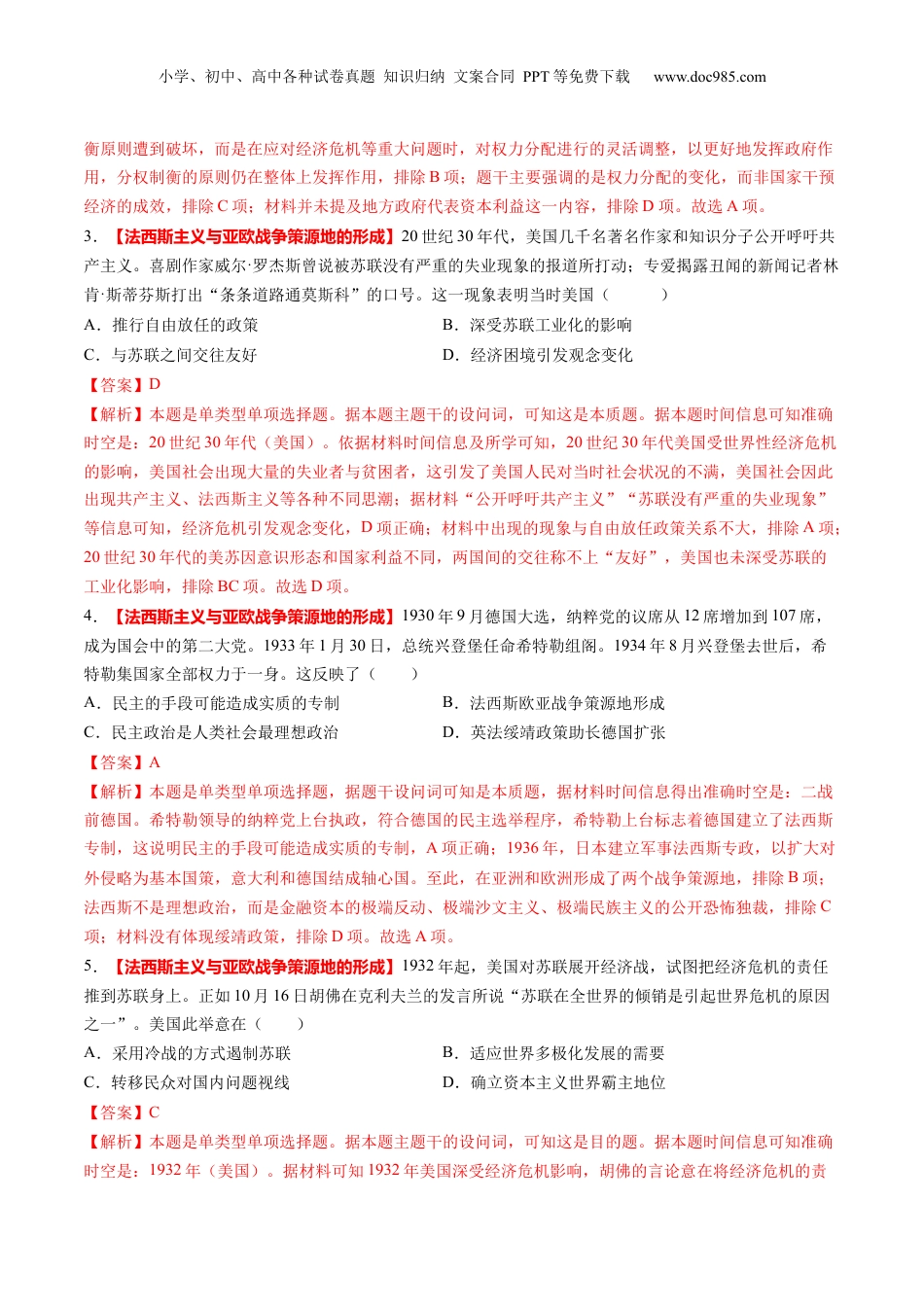 小学、初中、高中各种试卷真题知识归纳文案合同PPT等免费下载www.doc985.com第30讲第二次世界大战与战后国际秩序的形成目录模拟·基础演练...............................................................................................................1重难·创新演练...............................................................................................................1真题·实战演练...............................................................................................................91.【法西斯主义与亚欧战争策源地的形成】20世纪30年代早期,美国商家挖空心思打广告。比如,李斯特林牙膏:如果你愿意花25美分买一支李斯特林牙膏,而不买50美分一支的其他品牌的牙膏,那么一年能省下3美元;这3美元可以用来购买一双厚底靴、内衣、牛奶或者其他生活必需品。有些商家还到处举办抽奖、竞猜、送赠品等活动进行促销。上述现象的出现反映了()A.美国商人推动社会变革B.经济形势影响营销策略C.广告传媒形式发生改变D.美国政府着力改善民生【答案】B【解析】本题是单类型单项选择题。根据主题干的设问词,可知是本质题。时空是:20世纪30年代早期美国。根据所学知识可知,1929年,资本主义世界爆发了规模空前的经济大危机,20世纪30年代早期的美国受到经济危机的影响,大批工人失业,普通家庭收入减少。美国商家采取宣传低价格、举办抽奖、送赠品等促销方式,是为了适应经济危机影响下百姓生活困难、消费低迷的情况,体现经济形势影响营销策略,B项正确;材料所述为美国商人的营销策略,主要作用是影响消费和市场,“推动社会变革”说法夸大,排除A项;广告传媒形式主要包括利用报纸等刊登广告,利用广播、电视等播映广告,利用建筑物或空间设置标牌、电子显示牌、海报等,与材料所述不符,排除C项;材料体现美国商家的行为,看不出是政府主导,排除D项。故选B项。2.【法西斯主义与亚欧战争策源地的形成】罗斯福新政时期,从前属于州权范围的教育、卫生、社会福利、工业管制、劳资关系等,均受到总统和联邦政府的干预,拨款和政策制定之权均归属联邦,州和地方政府只有执行和管理之权。对上述现象解释正确的是()A.联邦体制进行内部调整B.分权制衡原则遭到破坏C.国家干预经济成效显著D.地方政府代表资本利益【答案】A【解析】本题是单类型单项选择题。据本题主题干的设问词,可知这是正向题。据本题时间信息可知准确时空是:罗斯福新政时期的美国。据本题材料可知,罗斯福新政时期,州权范围内的一些事务受到总统和联邦政府更多的干预,这是联邦体制在特殊时期进行的内部调整,A项正确;这种调整并非意味着分权制小学、初中、高中各种试卷真题知识归纳文案合同PPT等免费下载www.doc985.com衡原则遭到破坏,而是在应对经济危机等重大问题时,对权力分配进行的灵活调整,以更好地发挥政府作用,分权制衡的原则仍在整体上发挥作用,排除B项;题干主要强调的是权力分配的变化,而非国家干预经济的成效,排除C项;材料并未提及地方政府代表资本利益这一内容,排除D项。故选A项。3.【法西斯主义与亚欧战争策源地的形成】20世纪30年代,美国几千名著名作家和知识分子公开呼吁共产主义。喜剧作家威尔·罗杰斯曾说被苏联没有严重的失业现象的报道所打动;专爱揭露丑闻的新闻记者林肯·斯蒂芬斯打出“条条道路通莫斯科”的口号。这一现象表明当时美国()A.推行自由放任的政策B.深受苏联工业化的影响C.与苏联之间交往友好D.经济困境引发观念变化【答案】D【解析】本题是单类型单项选择题。据本题主题干的设问词,可知这是本质题。据本题时间信息可知准确时空是:20世纪30年代(美国)。依据材料时间信息及所学可知,20世纪30年代美国受世界性经济危机的影响,美国社会出现大量的失业者与贫困者,这引发了美国人民对当时社会状况的不满,美国社会因此出现共产主义、法西斯主义等各种不同思潮;据材料“公开呼吁共产主义”“苏联没有严重的失业现象”等信息可知,经济危机引发观念变化,D项正确;材料中出现的现象与自由放任政策关系不...