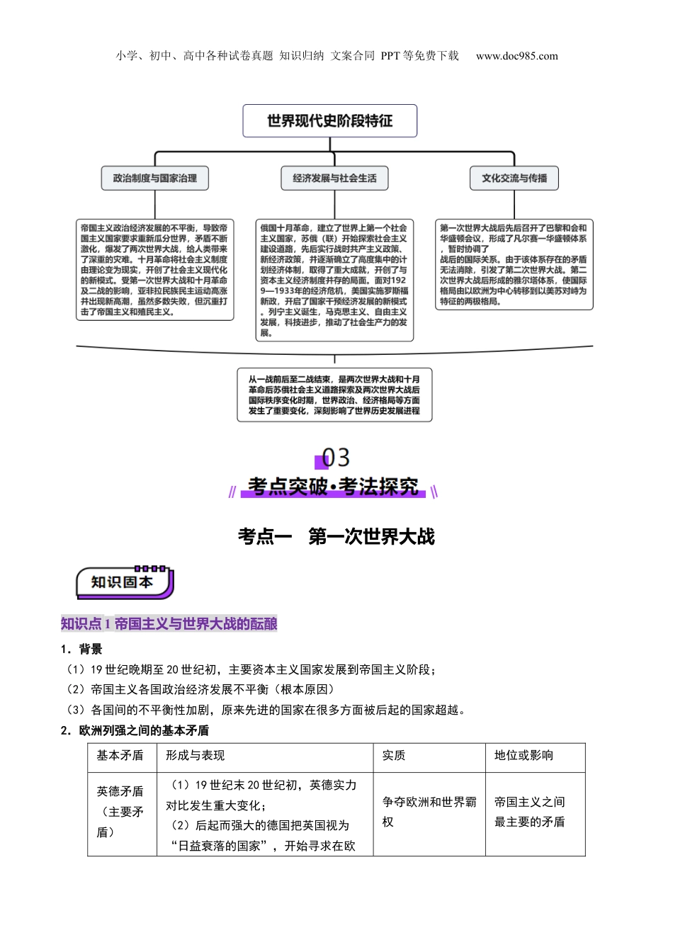 小学、初中、高中各种试卷真题知识归纳文案合同PPT等免费下载www.doc985.com第28讲第一次世界大战与战后国际秩序目录01考情透视·目标导航.................................................................................................202知识导图·思维领航.................................................................................................203考点突破·考法探究.................................................................................................3考点一第一次世界大战...........................................................................................................3知识点1帝国主义与世界大战的酝酿.....................................................................................................3考向1帝国主义与世界大战的酝酿.....................................................................................................4知识点2第一次世界大战.........................................................................................................................7考向2第一次世界大战的过程.............................................................................................................9考点二一战后国际秩序.......................................................................................................10知识点1凡尔赛——华盛顿体系的建立................................................................................................10知识点2国际联盟的成立.......................................................................................................................10考向1一战后的国际秩序...................................................................................................................1204真题练习·命题洞见...............................................................................................13小学、初中、高中各种试卷真题知识归纳文案合同PPT等免费下载www.doc985.com考点要求考计题统考建备议第一次世界大战(3年11考)2024选择题:山东卷、湖北卷非选择题:全国甲卷本讲为高考命题热点,复习时关注一些命题关键词:世界大战、三国同盟、三国协约、速决战、美国参战、国际秩序、凡凡凡凡凡凡凡凡凡、巴黎和会、华盛顿会议、分赃体系。2023非选择题:全国乙卷、浙江卷1月、海南卷2022选择题:浙江卷1月、浙江卷6月、山东卷非选择题:北京卷一战后的国际秩序(3年3考)2024非选择题:浙江卷1月2023选择题:福建卷非选择题:山东卷2022无标复目:1、通过学习使学生认识第一次世界大战爆发的原因以及影响,认识第一次世界大战带来的影响,培养学生用历史唯物主义和辩证唯物主义分析问题的能力。2、通过复习再一次让学生感受战争带来的灾难和破坏,让学生深刻认识到和平的重要性,坚决地捍卫国家的和平与安宁。小学、初中、高中各种试卷真题知识归纳文案合同PPT等免费下载www.doc985.com考点一第一次世界大战知识点1帝国主义与世界大战的酝酿1.背景(1)19世纪晚期至20世纪初,主要资本主义国家发展到帝国主义阶段;(2)帝国主义各国政治经济发展不平衡(根本原因)(3)各国间的不平衡性加剧,原来先进的国家在很多方面被后起的国家超越。2.欧洲列强之间的基本矛盾基本矛盾形成与表现实质地位或影响英德矛盾(主要矛盾)(1)19世纪末20世纪初,英德实力对比发生重大变化;(2)后起而强大的德国把英国视为“日益衰落的国家”,开始寻求在欧争夺欧洲和世界霸权帝国主义之间最主要的矛盾小学、初中、高中各种试卷真题知识归纳文案合同PPT等免费下载www.doc985.com洲乃至在世界的领导地位法德矛盾(1)普法战争后,因阿尔萨斯—洛林等领土争端积怨已久;(2)对北非殖民地的争夺剑拔弩张争夺欧洲大陆霸权和北非殖民地欧洲大陆的主要矛盾德俄矛盾因不断的...