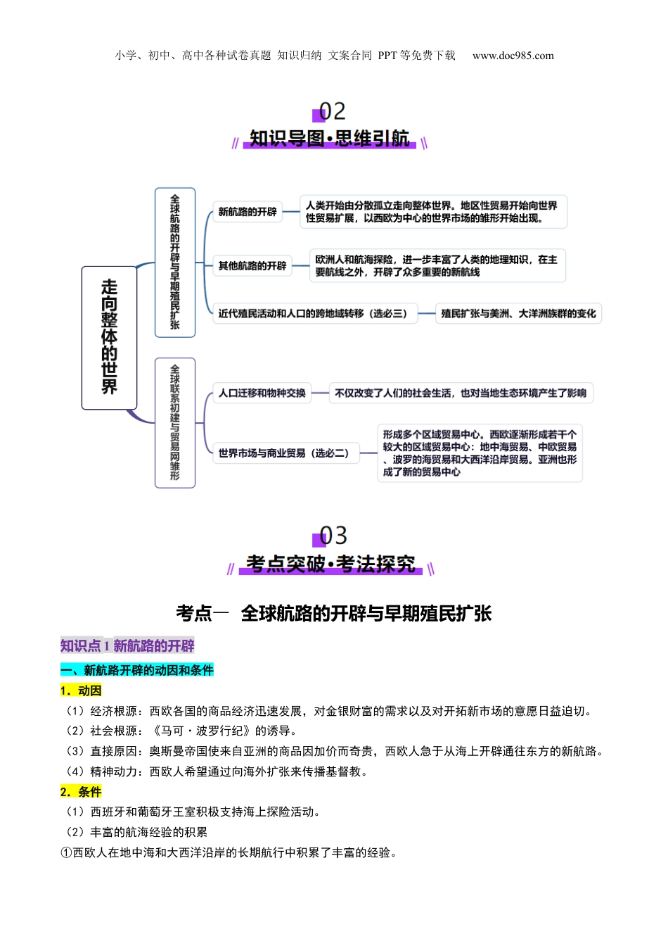 小学、初中、高中各种试卷真题知识归纳文案合同PPT等免费下载www.doc985.com第23讲走向整体的世界目录01考情透视·目标导航...................................................................................................202知识导图·思维领航...................................................................................................303考点突破·考法探究...................................................................................................3考点一全球航路的开辟与早期殖民扩张.................................................................................3知识点1新航路的开辟.............................................................................................................................3考向1新航路的开辟.............................................................................................................................5知识点2其他航路的开辟.........................................................................................................................6知识点3近代殖民活动和人口的跨地域转移(选必三)......................................................................6考向2早期殖民扩张、商业革命与价格革命.....................................................................................8考点二全球联系初建与贸易网雏形.....................................................................................10知识点1人口迁移和物种交换...............................................................................................................10考向1新航路推动“人口迁移与物种交换”........................................................................................13知识点2世界市场与商业贸易(选必二)...........................................................................................14考向2商品的世界性流动...................................................................................................................1704真题练习·命题洞见.................................................................................................19小学、初中、高中各种试卷真题知识归纳文案合同PPT等免费下载www.doc985.com考点要求考题统计备考建议全球航路的开辟(3年7考)2024选择题:浙江卷6月非选择题:甘肃卷本讲为高考命题热点,复习时关注一些命题关键词:航路开辟、地圆学说、全球联系初建、世界格局、商业革命、价格革命、资本原始积累、早期殖民扩张、人口迁移、物种交换、疾病传播、三角贸易、丝银贸易、马尼拉大帆船、美洲族群变化、贸易中心、创立银行、证券交易所、世界贸易格局,复习时多关注。2023选择题:广东卷非选择题:河北卷、北京卷2022选择题:山东卷非选择题:海南卷商品的世界性流动(3年4考)2024选择题:全国新课标卷2023选择题:河北卷、海南卷非选择题:辽宁卷2022无早期殖民扩张、商业革命和价格革命(3年9考)2024选择题:湖北卷、重庆卷、安徽卷、甘肃卷2023选择题:江苏卷非选择题:海南卷、全国甲卷2022非选择题:福建卷、全国甲卷习目标复:1、通过了解新航路开辟所引发的全球流动、人类认识世界的视野和能力的改变,以及对世界各区域文明的不同影响,理解新航路开辟是人类历史从分散走向整体过程中的重要节点。2、理解新航路的开辟引发的人口物种商品等的全球流动带来的影响。小学、初中、高中各种试卷真题知识归纳文案合同PPT等免费下载www.doc985.com考点一全球航路的开辟与早期殖民扩张知识点1新航路的开辟一、新航路开辟的动因和条件1.动因(1)经济根源:西欧各国的商品经济迅速发展,对金银财富的需求以及对开拓新市场的意愿日益迫切。(2)社会根源:《马可·波罗行纪》的诱导。(3)直接原因:奥斯曼帝国使来自亚洲的...