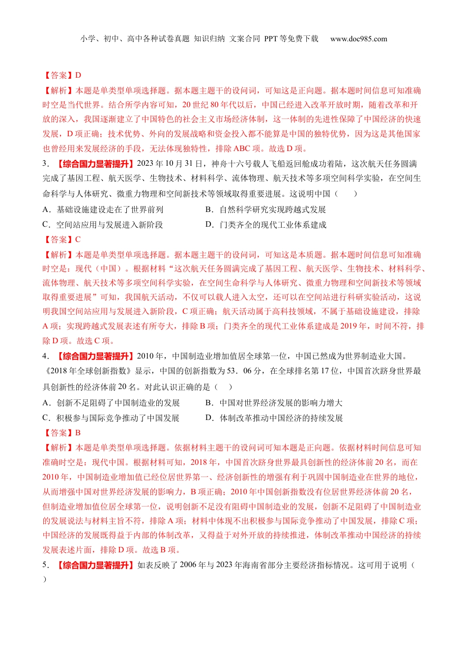 小学、初中、高中各种试卷真题知识归纳文案合同PPT等免费下载www.doc985.com第20讲中国特色社会主义新时代目录模拟·基础演练...............................................................................................................1重难·创新演练.............................................................................................................13真题·实战演练.............................................................................................................191.【综合国力显著提升】下图所示为1995年和2014年亚太区主要国家的贸易依存网络,箭头“甲乙”→表示乙国为甲国最大的贸易伙伴。这种变化说明()1995年亚太区贸易依存网络2014年亚太区贸易依存网络A.全球化与资本主义依存关系趋弱B.区域贸易成为世界贸易主要形式C.中国经济的国际影响力得到提升D.全球价值链发展呈现一体化特征【答案】C【解析】本题是单类型单项选择题。据本题主题干的设问词,可知这是本质题。据本题时间信息可知准确时空是:1995年和2014年(世界)。根据材料可知,在1995年亚太地区主要国家贸易网络中,美国是多数国家的最大贸易伙伴;而2014年,中国则成为亚太地区多数国家的最大贸易伙伴,这说明中国正逐步成为亚太地区的贸易中心;2014年亚太地区贸易依存网络中,多数国家的最大贸易伙伴由美国向中国转变,同时中国也变成澳大利亚的最大贸易伙伴国,表明中国经济的国际影响力得到提升,C项正确;除了中国是社会主义国家外,其他国家都资本主义国家,排除A项;材料没有区域贸易和其他贸易形式的对比,无法得出区域贸易成为世界贸易主要形式,排除B项;材料未涉及全球价值链发展呈现一体化特征,排除D项。故选C项。2.【综合国力显著提升】有学者认为,20世纪八十年代以来中国的发展路径与二战后日本、韩国的经济发展路径有很大相似之处,但也有其他学者指出这一时期中国拥有独特的优势,这里的优势是指()A.后发的技术优势B.外向的发展战略C.充足的资金投入D.先进的制度保障小学、初中、高中各种试卷真题知识归纳文案合同PPT等免费下载www.doc985.com【答案】D【解析】本题是单类型单项选择题。据本题主题干的设问词,可知这是正向题。据本题时间信息可知准确时空是当代世界。结合所学内容可知,20世纪80年代以后,中国已经进入改革开放时期,随着改革和开放的深入,我国逐渐建立了中国特色的社会主义市场经济体制,这一体制的先进性保障了中国经济的快速发展,D项正确;技术优势、外向的发展战略和资金投入都不能算是中国的独特优势,因为这是其他国家也曾经用来发展经济的手段,无法体现独特性,排除ABC项。故选D项。3.【综合国力显著提升】2023年10月31日,神舟十六号载人飞船返回舱成功着陆,这次航天任务圆满完成了基因工程、航天医学、生物技术、材料科学、流体物理、航天技术等多项空间科学实验,在空间生命科学与人体研究、微重力物理和空间新技术等领域取得重要进展。这说明中国()A.基础设施建设走在了世界前列B.自然科学研究实现跨越式发展C.空间站应用与发展进入新阶段D.门类齐全的现代工业体系建成【答案】C【解析】本题是单类型单项选择题。据本题主题干的设问词,可知这是本质题。据本题时间信息可知准确时空是:现代(中国)。根据材料“这次航天任务圆满完成了基因工程、航天医学、生物技术、材料科学、流体物理、航天技术等多项空间科学实验,在空间生命科学与人体研究、微重力物理和空间新技术等领域取得重要进展”可知,我国航天活动,不仅可以载人进入太空,还可以在空间站进行科研实验活动,这说明我国空间站应用与发展进入新阶段,C项正确;航天活动属于高科技领域,不属于基础设施建设,排除A项;实现跨越式发展表述有所夸大,排除B项;门类齐全的现代工业体系建成是2019年,时间不符,排除D项。故选C项。4.【综合国力显著提升】2010年,中国制造业增加值居全球第一位,中国已然成为世界制造业大国。《2018年全球创新指数》显示,中国的创新指数为53.06分,在全球排名第17位,中国首次跻身世界最具...