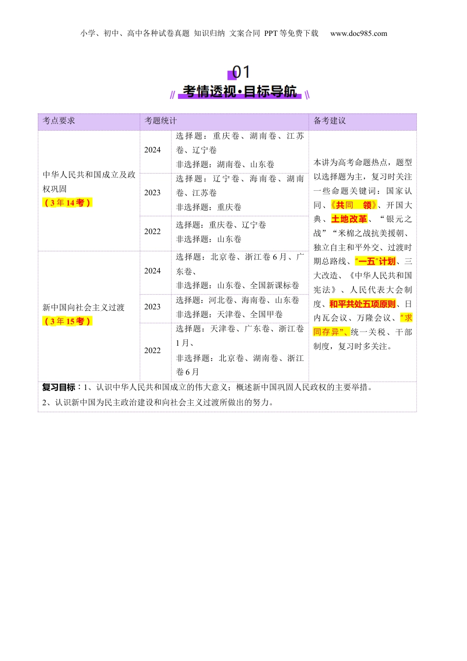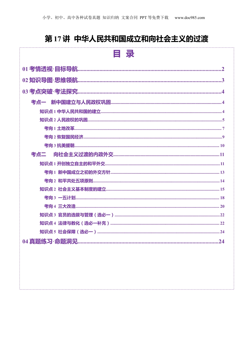 小学、初中、高中各种试卷真题知识归纳文案合同PPT等免费下载www.doc985.com第17讲中华人民共和国成立和向社会主义的过渡目录01考情透视·目标导航...................................................................................................202知识导图·思维领航...................................................................................................303考点突破·考法探究...................................................................................................4考点一新中国建立与人民政权巩固.........................................................................................4知识点1中华人民共和国的建立..............................................................................................................4知识点2人民政权的巩固..........................................................................................................................5考向1土地改革......................................................................................................................................7考向2恢复国民经济..............................................................................................................................9考向3抗美援朝....................................................................................................................................10考点二向社会主义过渡的内政外交.....................................................................................11知识点1开创独立自主的和平外交........................................................................................................11考向1新中国成立之初的外交方针...................................................................................................13考向2和平共处五项原则...................................................................................................................14知识点2社会主义基本制度的建立.......................................................................................................15考向3一五计划...................................................................................................................................18考向4三大改造...................................................................................................................................20知识点3官员的选拔与管理(选必一)...............................................................................................22知识点4法律与教化(选必一补充)...................................................................................................22知识点5社会保障(选必一)...............................................................................................................2404真题练习·命题洞见.................................................................................................24小学、初中、高中各种试卷真题知识归纳文案合同PPT等免费下载www.doc985.com考点要求考题统计备考建议中华人民共和国成立及政权巩固(3年14考)2024选择题:重庆卷、湖南卷、江苏卷、辽宁卷非选择题:湖南卷、山东卷本讲为高考命题热点,题型以选择题为主,复习时关注一些命题关键词:国家认同、共纲领《同》、开国大典、土地改革、“银元之战”“米棉之战抗美援朝、独立自主和平外交、过渡时期总路线、一五计划“”、三大改造、《中华人民共和国宪法》、人民代表大会制度、和平共处五项原则、日内瓦会议、万隆会议、“求”同存异、统一关税、干部制度,复习时多关注。2023选择题:辽宁卷...