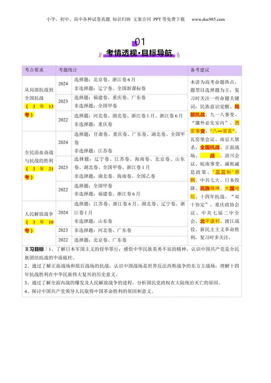 小学、初中、高中各种试卷真题知识归纳文案合同PPT等免费下载www.doc985.com第16讲中华民族的抗日战争与解放战争目录01考情透视·目标导航...................................................................................................702知识导图·思维领航...................................................................................................903考点突破·考法探究.................................................................................................10考点一从局部抗战到全面抗战.............................................................................................10知识点1局部抗战..............................................................................................................................10考向1局部抗战..................................................................................................................................12知识点2全面抗战的开始..................................................................................................................15考向2全国抗战的开始......................................................................................................................17知识点3日军的侵华暴行..................................................................................................................18考向3日本侵华暴行..........................................................................................................................19考点二全民族浴血奋战与抗战的胜利...............................................................................20知识点1正面战场的抗战....................................................................................................................20考向1正面战场的抗战......................................................................................................................21知识点2敌后战场的抗战..................................................................................................................22考向2敌后战场抗战..........................................................................................................................24知识点3东方主战场..........................................................................................................................25知识点4抗日战争的胜利..................................................................................................................26考向3抗日战争的胜利......................................................................................................................28考点三人民解放战争...........................................................................................................29知识点1争取和平民主的斗争..........................................................................................................29考向1争取和平民主的斗争..............................................................................................................30知识点2全面内战的爆发..................................................................................................................31考向2全面内战的爆发......................................................................................................................32知识点3新民主主义革命的胜利......................................................................................................33考向3新民主...