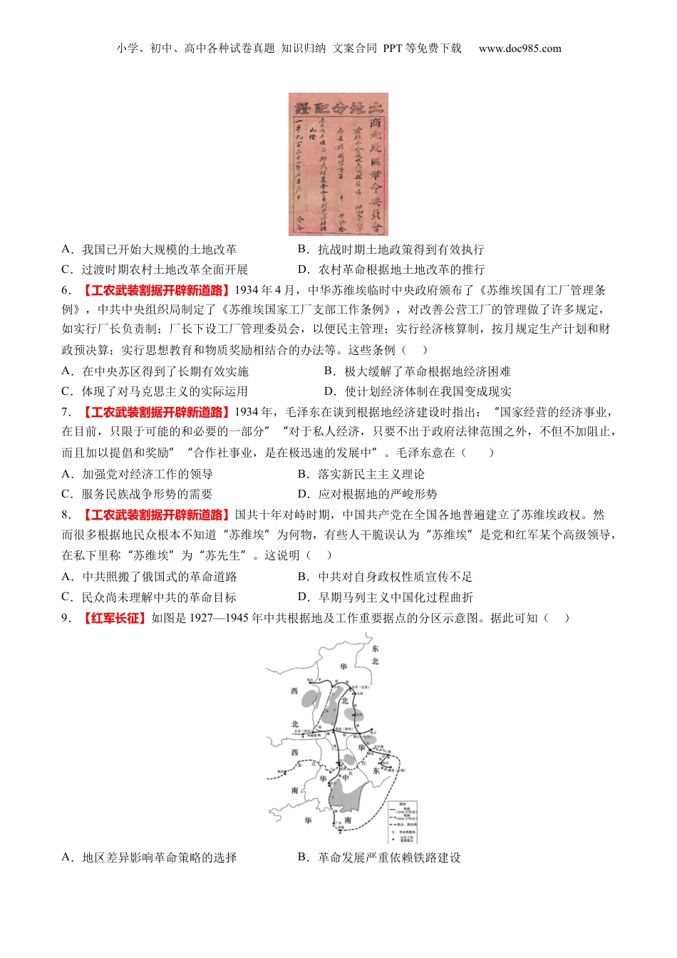 小学、初中、高中各种试卷真题知识归纳文案合同PPT等免费下载www.doc985.com第15讲南京国民政府的统治和中国共产党开辟革命新道路目录模拟·基础演练...............................................................................................................1重难·创新演练...............................................................................................................4真题·实战演练...............................................................................................................71.【南京国民政府的统治】我国机器进口的全国总额在1920年前平均不足1000万关两,到20世纪30年代迅速增加至4500万关两左右,增长了约3.5倍。机器进口在1913年占全国进口商品总值的1.4%,名列进口商品分类第10位,1936年占全国进口商品总值的6.4%,名列进口商品分类的第3位。机器进口的增长()A.开启了工业近代化的进程B.有利于缩小中外生产力的差距C.促进了民族工业初步发展D.归因于民国时政府的政策支持2.【南京国民政府的统治】1926—1927年,毛泽东多次发文指出:没有贫农阶级,决不能造成现时乡“村的革命状态一切帝国主义、军阀、贪官污吏、土豪劣绅,都将被他们(农民)葬人坟墓。一切革命”“的党派、革命的同志,都将在他们面前受他们的检验而决定弃取。毛泽东的这些言论(”)A.指出了中国革命的正确道路B.推动了革命统一战线不断扩大C.立足于中国近代特殊的国情D.强调了农民阶级的革命领导权3.【南京国民政府的统治】1928年,南京国民政府通过《训政纲领》,依照孙中山建国大纲所定,承认人民享有选举、罢免、创制、复决四种权力,但由于人民缺乏政治意识与经验,应由国民党对他们进“”行训练而逐渐推行,以为宪政奠定基础。这表明国民党意在(“”)A.实践资产阶级政权理念B.循序渐进实行三民主义C.扩大人民行使政权权力D.营造一党专政的合法性4.【南京国民政府的统治】1928年,国民政府通过《海关进口税则》,把进口货物分为七类,其税率为7.5%—27.5%不等;1931年1月,又把进口货物分为十二类,最高税率提高到50%;1933年更是把最高税率提高到80%。关税也由1913年占财政总收入的21%,上升到1931年的51%。这表明当时()A.列强扩大商品输出以抢占国内市场B.抗日战争推动中国和世界经济发展C.民族工业的发展环境得到一定改善D.关税自主推动了国民经济健康发展5.【工农武装割据开辟新道路】下图为我国某时期的一张土地分配证,根据图片信息,可知()小学、初中、高中各种试卷真题知识归纳文案合同PPT等免费下载www.doc985.comA.我国已开始大规模的土地改革B.抗战时期土地政策得到有效执行C.过渡时期农村土地改革全面开展D.农村革命根据地土地改革的推行6.【工农武装割据开辟新道路】1934年4月,中华苏维埃临时中央政府颁布了《苏维埃国有工厂管理条例》,中共中央组织局制定了《苏维埃国家工厂支部工作条例》,对改善公营工厂的管理做了许多规定,如实行厂长负责制;厂长下设工厂管理委员会,以便民主管理;实行经济核算制,按月规定生产计划和财政预决算;实行思想教育和物质奖励相结合的办法等。这些条例()A.在中央苏区得到了长期有效实施B.极大缓解了革命根据地经济困难C.体现了对马克思主义的实际运用D.使计划经济体制在我国变成现实7.【工农武装割据开辟新道路】1934年,毛泽东在谈到根据地经济建设时指出:国家经营的经济事业“,在目前,只限于可能的和必要的一部分对于私人经济,只要不出于政府法律范围之外,不但不加阻止”“,而且加以提倡和奖励合作社事业,是在极迅速的发展中。毛泽东意在(”“”)A.加强党对经济工作的领导B.落实新民主主义理论C.服务民族战争形势的需要D.应对根据地的严峻形势8.【工农武装割据开辟新道路】国共十年对峙时期,中国共产党在全国各地普遍建立了苏维埃政权。然而很多根据地民众根本不知道苏维埃为何物,有些人干脆误认为苏维埃是党和红军某个高级领导“”“”,在私下里称苏维埃为苏先生。这说明(“”“”)A.中共照搬了俄国式的革命...