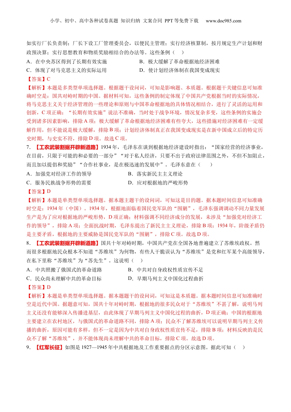 小学、初中、高中各种试卷真题知识归纳文案合同PPT等免费下载www.doc985.com第15讲南京国民政府的统治和中国共产党开辟革命新道路目录模拟·基础演练...............................................................................................................1重难·创新演练...............................................................................................................9真题·实战演练.............................................................................................................141.【南京国民政府的统治】我国机器进口的全国总额在1920年前平均不足1000万关两,到20世纪30年代迅速增加至4500万关两左右,增长了约3.5倍。机器进口在1913年占全国进口商品总值的1.4%,名列进口商品分类第10位,1936年占全国进口商品总值的6.4%,名列进口商品分类的第3位。机器进口的增长()A.开启了工业近代化的进程B.有利于缩小中外生产力的差距C.促进了民族工业初步发展D.归因于民国时政府的政策支持【答案】B【解析】本题是多类型单项选择题。根据主题干的设问词,可知是影响题、原因题。时空是:20世纪上半叶(中国)。根据材料并结合所学可知,20世纪上半叶中国机器进口的总额和占全国进口商品总值的比重增长明显,这有利于促进民族资本主义经济的发展,缩小中外生产力的差距,B项正确;开启工业近代化进程的是洋务运动,与史实不符,排除A项;民族工业初步发展是在甲午战争后,排除C项;机器进口的增长由多因素促成,且材料中没有民国政府政策支持的内容,排除D项。故选B项。2.【南京国民政府的统治】1926—1927年,毛泽东多次发文指出:“没有贫农阶级,决不能造成现时乡村的革命状态”“一切帝国主义、军阀、贪官污吏、土豪劣绅,都将被他们(农民)葬人坟墓。一切革命的党派、革命的同志,都将在他们面前受他们的检验而决定弃取”。毛泽东的这些言论()A.指出了中国革命的正确道路B.推动了革命统一战线不断扩大C.立足于中国近代特殊的国情D.强调了农民阶级的革命领导权【答案】C【解析】本题是单类型单项选择题。根据本题次题干的设问词,可知这是影响题。根据材料时间信息可知准确时空是:1926-1927年(中国)。根据材料可知,毛泽东在国民革命时期已经指出,中国革命要依靠农民阶级,这表明毛泽东已认识到我国国情为落后的农业国,农民阶级庞大,工人阶级力量弱小,中国革命需要组织和发动农民阶级的力量,C项正确。井冈山革命根据地建立后,中共找到了中国革命的正确道路,排除A项;材料未涉及毛泽东这一革命思想对国民革命的作用,排除B项;毛泽东强调了农民阶级的主力军地位,新民主主义革命的领导权是无产阶级,排除D项。故选C项。3.【南京国民政府的统治】1928年,南京国民政府通过《训政纲领》,依照孙中山建国大纲所定,承认人民享有选举、罢免、创制、复决四种权力,但由于人民“缺乏政治意识与经验”,应由国民党对他们进小学、初中、高中各种试卷真题知识归纳文案合同PPT等免费下载www.doc985.com行“训练”而逐渐推行,以为宪政奠定基础。这表明国民党意在()A.实践资产阶级政权理念B.循序渐进实行三民主义C.扩大人民行使政权权力D.营造一党专政的合法性【答案】D【解析】本题是单类型单项选择题。据本题主题干的设问词,可知这是目的题。据本题时间信息可知准确时空是:1928年(中国)。南京国民政府训政纲领无视民众权力,以“训政”而延缓民主建设,其实质是建立国民党的一党专政,D项正确;资产阶级政权理念是代议制、三权分立等,排除A项;此举是对民众权利的损害,并非真正实行三民主义,排除B项;这并没有扩大民众的权力,排除C项。故选D项。4.【南京国民政府的统治】1928年,国民政府通过《海关进口税则》,把进口货物分为七类,其税率为7.5%—27.5%不等;1931年1月,又把进口货物分为十二类,最高税率提高到50%;1933年更是把最高税率提高到80%。关税也由1913年占财政总收入的21%,上升到1931年的51%。这表明当时()A.列强扩大商品输出以抢占国内市场B.抗日战争推动中国和世界...