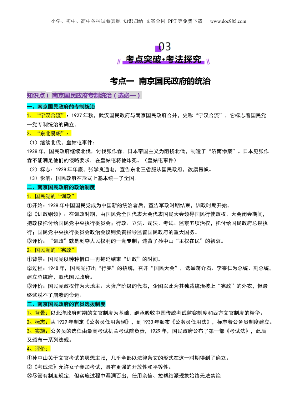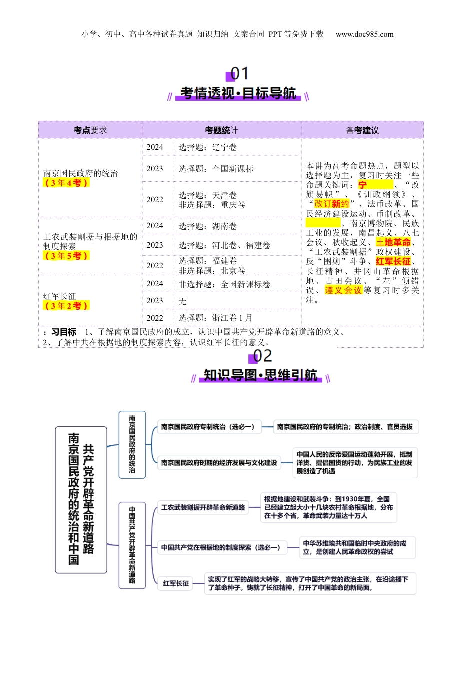 小学、初中、高中各种试卷真题知识归纳文案合同PPT等免费下载www.doc985.com第15讲南京国民政府的统治和中国共产党开辟革命新道路目录01考情透视·目标导航...................................................................................................202知识导图·思维领航...................................................................................................203考点突破·考法探究...................................................................................................3考点一南京国民政府的统治.....................................................................................................3知识点1南京国民政府专制统治(选必一)........................................................................................3知识点2南京国民政府时期的经济发展与文化建设.............................................................................4考向1南京国民政府的统治................................................................................................................6考点二中国共产党开辟革命新道路.......................................................................................7知识点1工农武装割据开辟革命新道路................................................................................................7考向1工农武装割据开辟新道路........................................................................................................9知识点2中国共产党在根据地的制度探索(选必一).......................................................................10知识点3红军长征..................................................................................................................................11考向2红军长征..................................................................................................................................1204真题练习·命题洞见.................................................................................................13小学、初中、高中各种试卷真题知识归纳文案合同PPT等免费下载www.doc985.com考点要求考题统计考建议备南京国民政府的统治(3年4考)2024选择题:辽宁卷本讲为高考命题热点,题型以选择题为主,复习时关注一些命题关键词:宁汉汉汉、“改旗易帜”、《训政纲领》、“新改订约”、法币改革、国民经济建设运动、币制改革、汉汉汉汉、南京博物院、民族工业的发展,南昌起义、八七会议、秋收起义、地革命土、“工农武装割据”政权建设、反“围剿”斗争、红军长征、长征精神、井冈山革命根据地、古田会议、“左”倾错误、遵会义议等复习时多关注。2023选择题:全国新课标2022选择题:天津卷非选择题:重庆卷工农武装割据与根据地的制度探索(3年5考)2024选择题:湖南卷2023选择题:河北卷、福建卷2022选择题:福建卷非选择题:北京卷红军长征(3年2考)2024非选择题:全国新课标卷2023无2022选择题:浙江卷1月习目标汉:1、了解南京国民政府的成立,认识中国共产党开辟革命新道路的意义。2、了解中共在根据地的制度探索内容,认识红军长征的意义。小学、初中、高中各种试卷真题知识归纳文案合同PPT等免费下载www.doc985.com考点一南京国民政府的统治知识点1南京国民政府专制统治(选必一)一、南京国民政府的专制统治1、“宁汉合流”:1927年秋,武汉国民政府与南京国民政府合并,史称“宁汉合流”。它标志着国民党一党专制统治的确立。2、“东北易帜”:(1)继续北伐、皇姑屯事件:1928年,国民政府继续北伐,讨伐张作霖。日本帝国主义为阻挠北伐,制造了“济南惨案”。日本见张作霖不能满足他们的侵略要求,在皇姑屯将他炸死。(皇姑屯事件)(2)标志:1928年年底,张学良通电,宣告东北三省服从国民政府,改旗易帜。(3)影响:国民政府...