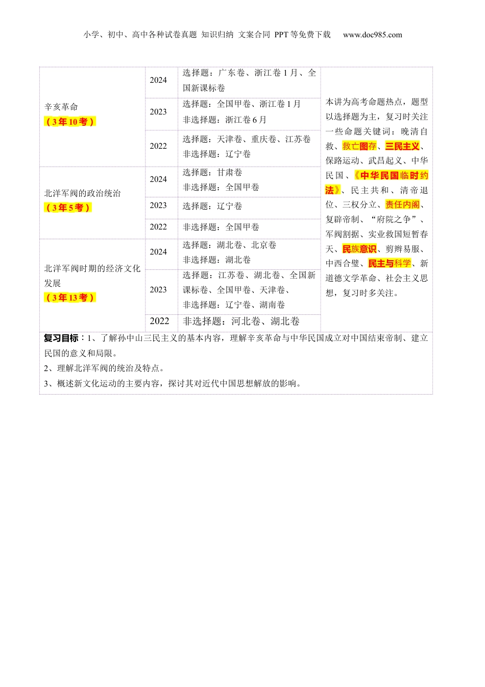 小学、初中、高中各种试卷真题知识归纳文案合同PPT等免费下载www.doc985.com第13讲辛亥革命与北洋军阀的统治目录01考情透视·目标导航...................................................................................................202知识导图·思维领航...................................................................................................303考点突破·考法探究...................................................................................................4考点一辛亥革命.........................................................................................................................4知识点1资产阶级民主革命的兴起.........................................................................................................4考向1资产阶级民主革命的兴起.........................................................................................................6知识点2武昌起义与中华民国成立(过程).........................................................................................7考向2武昌起义与中华民国建立.........................................................................................................8知识点3辛亥革命的历史意义.................................................................................................................9考向3辛亥革命的历史意义...............................................................................................................10考点二北洋军阀统治时期的政治.........................................................................................12知识点1袁世凯复辟帝制与护国战争....................................................................................................12考向1袁世凯复辟帝制和护国战争...................................................................................................13知识点2北洋时期的军阀割据...............................................................................................................14考向2北洋时期的军阀割据...............................................................................................................15知识点3官员的选拔与管理(选必一)...............................................................................................18考点三北洋军阀统治时期经济与文化.................................................................................19知识点1北洋军阀统治时期的经济.......................................................................................................19考向1民国初年经济、社会生活新气象...........................................................................................21知识点2新文化运动的开展...................................................................................................................23考向2新文化运动的开展...................................................................................................................24知识点3华工与美洲、大洋洲的开发(选必三)................................................................................2704真题练习·命题洞见.................................................................................................28考点要求考题统计备考建议小学、初中、高中各种试卷真题知识归纳文案合同PPT等免费下载www.doc985.com辛亥革命(3年10考)2024选择题:广东卷、浙江卷1月、全国新课标卷本讲为高考命题热点,题型以选择题为主,复习时关注一些命题关键词:晚清自救、图救亡存、三民...