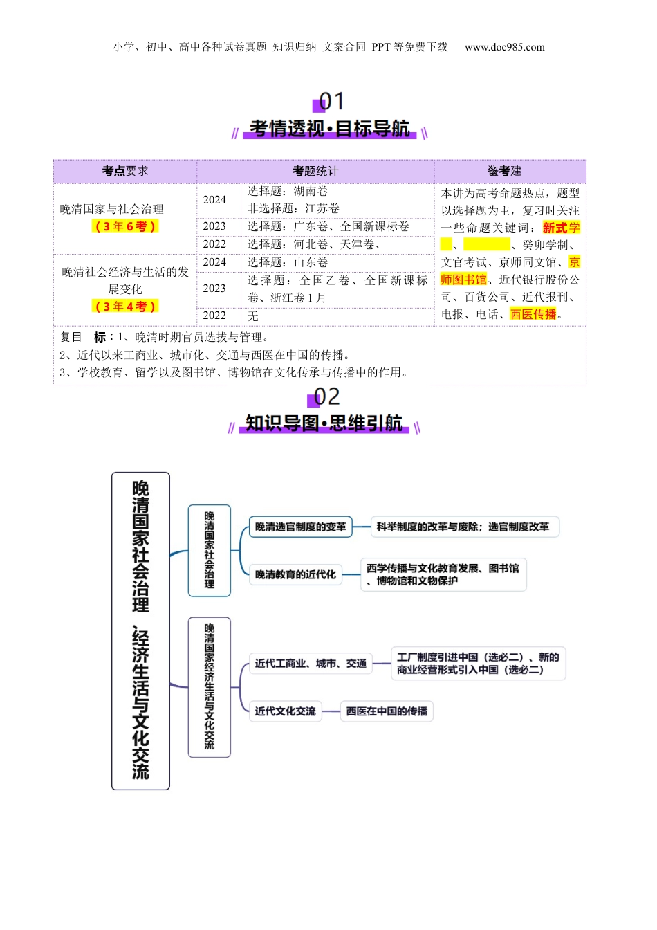 小学、初中、高中各种试卷真题知识归纳文案合同PPT等免费下载www.doc985.com第12讲晚清国家社会治理、经济生活与文化交流目录01考情透视·目标导航.................................................................................................202知识导图·思维领航.................................................................................................203考点突破·考法探究.................................................................................................3考点一晚清国家社会治理.......................................................................................................3知识点1晚清选官制度的变革..................................................................................................................3知识点2晚清教育的近代化......................................................................................................................3考向1晚清国家社会治理..........................................................................................................................4考点二晚清国家经济生活与文化交流.................................................................................5知识点1近代工商业、城市、交通..........................................................................................................5知识点2近代文化交流............................................................................................................................5考向1晚清社会经济的发展变化............................................................................................................604真题练习·命题洞见.................................................................................................7小学、初中、高中各种试卷真题知识归纳文案合同PPT等免费下载www.doc985.com考点要求考题统计考建备议晚清国家与社会治理(3年6考)2024选择题:湖南卷非选择题:江苏卷本讲为高考命题热点,题型以选择题为主,复习时关注一些命题关键词:新式学堂、堂堂堂堂、癸卯学制、文官考试、京师同文馆、京师图书馆、近代银行股份公司、百货公司、近代报刊、电报、电话、西医传播。2023选择题:广东卷、全国新课标卷2022选择题:河北卷、天津卷、晚清社会经济与生活的发展变化(3年4考)2024选择题:山东卷2023选择题:全国乙卷、全国新课标卷、浙江卷1月2022无标复目:1、晚清时期官员选拔与管理。2、近代以来工商业、城市化、交通与西医在中国的传播。3、学校教育、留学以及图书馆、博物馆在文化传承与传播中的作用。小学、初中、高中各种试卷真题知识归纳文案合同PPT等免费下载www.doc985.com考点一晚清国家社会治理知识点1晚清选官制度的变革1、科举制度的改革与废除①1898年,清政府加设经济特科;废八股,改试策论,以时务策命题。②1901年,各省书院、府州县学改为大中小学堂,设蒙养学堂。③1905年,诏准立停科举之奏,1906年起,停止科举。2、选官制度改革①机构改革:改总理衙门为外务部,设农工商部、巡警部、学部等。②选官制度:1904年,颁布《奏定学堂章程》,统一全国学制;学堂选官制度正式设立。不久,确立了留学毕业生选官制度,考试合格者给予相应科举出身。知识点2晚清教育的近代化一、西学传播与文化教育发展1、1862年,旨在培养外交和翻译人才的京师同文馆在北京设立(选必一)2、清政府创办新式学堂,派遣留学生。严复、詹天佑等是中国较早接受西方教育的近代知识分子。(选必三)3、1868年,专门引进、翻译西方书籍的江南机器制造总局翻译馆创办,大量军事、工程方面的书籍得到翻译。(选必三)4、北京大学:其前身京师大学堂,是中国教育近代化的标志。1912年,改名为“北京大学”,成为新文化运动的中心和学术研究的重镇。(选必三)5、清华大学:1911年,清华学堂创...