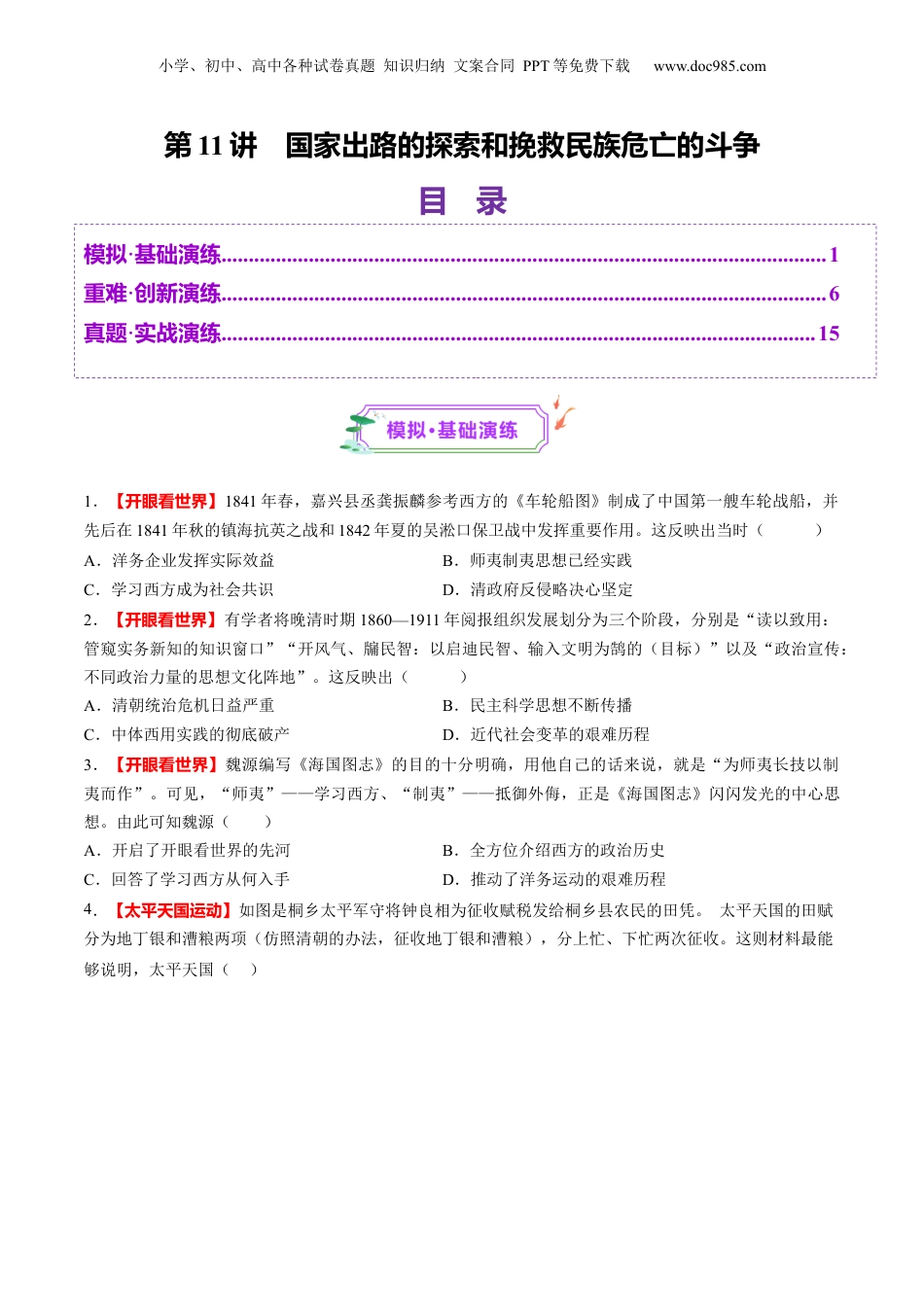 小学、初中、高中各种试卷真题知识归纳文案合同PPT等免费下载www.doc985.com第11讲国家出路的探索和挽救民族危亡的斗争目录模拟·基础演练...............................................................................................................1重难·创新演练...............................................................................................................6真题·实战演练.............................................................................................................151.【开眼看世界】1841年春,嘉兴县丞龚振麟参考西方的《车轮船图》制成了中国第一艘车轮战船,并先后在1841年秋的镇海抗英之战和1842年夏的吴淞口保卫战中发挥重要作用。这反映出当时()A.洋务企业发挥实际效益B.师夷制夷思想已经实践C.学习西方成为社会共识D.清政府反侵略决心坚定2.【开眼看世界】有学者将晚清时期1860—1911年阅报组织发展划分为三个阶段,分别是“读以致用:管窥实务新知的知识窗口”“开风气、牖民智:以启迪民智、输入文明为鹄的(目标)”以及“政治宣传:不同政治力量的思想文化阵地”。这反映出()A.清朝统治危机日益严重B.民主科学思想不断传播C.中体西用实践的彻底破产D.近代社会变革的艰难历程3.【开眼看世界】魏源编写《海国图志》的目的十分明确,用他自己的话来说,就是“为师夷长技以制夷而作”。可见,“师夷”——学习西方、“制夷”——抵御外侮,正是《海国图志》闪闪发光的中心思想。由此可知魏源()A.开启了开眼看世界的先河B.全方位介绍西方的政治历史C.回答了学习西方从何入手D.推动了洋务运动的艰难历程4.【太平天国运动】如图是桐乡太平军守将钟良相为征收赋税发给桐乡县农民的田凭。太平天国的田赋分为地丁银和漕粮两项(仿照清朝的办法,征收地丁银和漕粮),分上忙、下忙两次征收。这则材料最能够说明,太平天国()小学、初中、高中各种试卷真题知识归纳文案合同PPT等免费下载www.doc985.comA.凸显了小农的阶级局限B.具有反封建的斗争精神C.背离了早期的土地纲领D.体现出社会转型的趋势5.【太平天国运动】太平军西征的时候,东王杨秀清、北王韦昌辉和翼王石达开鉴于天京粮食供应紧张,上奏天王洪秀全:“建都天京,兵士日众,宜广积米粮,以充军储而裕国课。弟等细思,安徽、江西米粮广有,宜令镇守佐将在彼晓谕良民,照旧缴粮纳税。”这一上奏意味着太平天国()A.依托地主阶级剥削农民B.积极顺应世界发展潮流C.注重基层经济制度建设D.难以解决农民土地问题6.【太平天国运动】下表为长江流域三省历年灾荒统计表,对表中信息解读正确的是()年代江苏安徽江西灾区州县数灾别灾区州县数灾别灾区州县数灾别185453水、旱17水、旱20水、旱185666旱、兵23水、旱、虫7水、旱185959水、旱、虫26水、旱、风13水186477水、旱68水20水、旱A.清政府的财政收入锐减B.太平天国政权可能出现粮食危机C.江南地区经济濒临崩溃D.长江沿岸封建自然经济逐步瓦解7.【洋务运动】蒋廷黻在《中国近代史》中说:“中国地主阶级自强运动的领袖们……他们起初只知道国防近代化的必要,但是他们在这条路上前进一步后,就发现必须再进一步。”他们“再进一步”的举动是()A.以救国为宗旨创办民族工业B.向西方学习创办军事工业C.求富为口号创办民用工业D.主张兴民权倡导君主立宪8.【洋务运动】1875—1877年清政府为塞防共投入4200万两,年均1400万两,1885—1894年10年间北洋水师的经费约2300万两,年均229万两,仅为塞防年度投入的六分之一。出现这种现象的原因是(小学、初中、高中各种试卷真题知识归纳文案合同PPT等免费下载www.doc985.com)A.沿海的重要性不如西北地区B.政治腐败状态日渐加剧C.洋务运动实现了海防现代化D.清政府对海防认识不足9.【洋务运动】19世纪60年代以来,李鸿章先后兴办了苏州洋炮局、金陵机器制造局、江南制造局;又陆续筹款添购德国克虏伯后门四磅钢炮一百十四尊;仿照德国制度,成立炮队19营,聘请德国教习训练。这些举措体现了()A.军事体制实现现代化B...