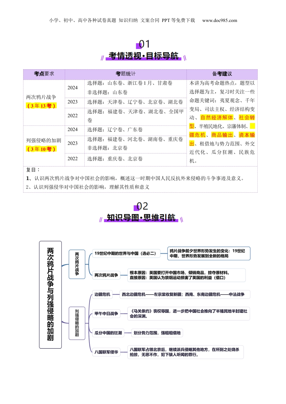 小学、初中、高中各种试卷真题知识归纳文案合同PPT等免费下载www.doc985.com第10讲两次鸦片战争与列强侵略的加剧目录01考情透视·目标导航.................................................................................................202知识导图·思维领航.................................................................................................203考点突破·考法探究.................................................................................................3考点一两次鸦片战争...............................................................................................................3知识点119世纪中期的世界与中国(选必二).....................................................................................3知识点2两次鸦片战争.............................................................................................................................4考向1两次鸦片战争.............................................................................................................................7考点二列强侵略的加剧.........................................................................................................8知识点1边疆危机.....................................................................................................................................8知识点2甲午中日战争.............................................................................................................................9考向1边疆危机与甲午中日战争........................................................................................................11知识点3瓜分中国的狂潮.......................................................................................................................12考向2瓜分中国的狂潮.......................................................................................................................13知识点4八国联军侵华...........................................................................................................................14考向3八国联军侵华与民族危机的加深............................................................................................1604真题练习·命题洞见...............................................................................................17小学、初中、高中各种试卷真题知识归纳文案合同PPT等免费下载www.doc985.com考点要求考统题计考建备议两次鸦片战争(3年13考)2024选择题:山东卷、浙江卷1月、甘肃卷非选择题:山东卷本讲为高考命题热点,题型以选择题为主,复习时关注一些命题关键词:夷夏观念、千年变局、司法主权、经济结构变动、自然解体经济、社会转型、半殖民地化、宗藩体制、边疆危机、商品出输、资本输出、租借地与势力范围、外交近代化、瓜分狂潮、民族危机。2023选择题:天津卷、辽宁卷、北京卷、湖北卷2022选择题:福建卷、天津卷、湖北卷、全国甲卷列强侵略的加剧(3年10考)2024选择题:辽宁卷、广东卷2023选择题:福建卷、河北卷、湖南卷、重庆卷非选择题:北京卷2022选择题:重庆卷、北京卷复目:1、认识两次鸦片战争对中国社会的影响,概述这一时期中国人民反抗外来侵略的斗争事迹及意义。2、认识列强侵华对中国社会的影响,理解其性质和意义小学、初中、高中各种试卷真题知识归纳文案合同PPT等免费下载www.doc985.com考点一两次鸦片战争知识点119世纪中期的世界与中国(选必二)一、鸦片战争前夕世界形势发生的变化:19世纪中期,世界形势发展到全新的格局。1、政治:资产阶级代议制在欧洲大陆逐步确立。2、经济:工业革命后半个多世纪,资本主义生产方式在英、法、美等国逐渐占据主导地位;3、外交...