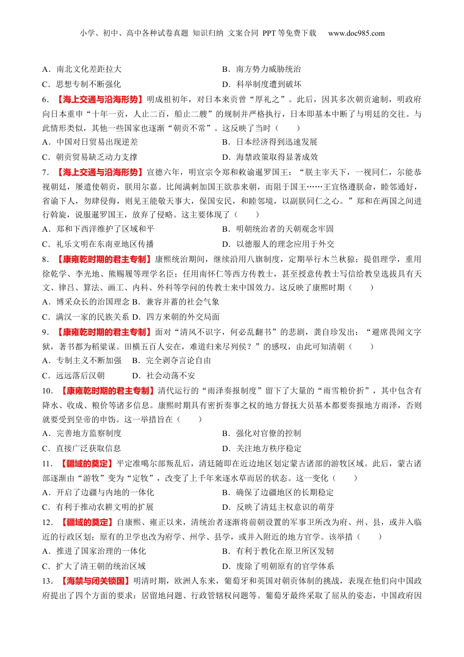小学、初中、高中各种试卷真题知识归纳文案合同PPT等免费下载www.doc985.com第08讲从明朝建立到清军入关和清朝前中期的鼎盛与危机目录模拟·基础演练...............................................................................................................1重难·创新演练...............................................................................................................4真题·实战演练...............................................................................................................51.【明朝政治体制的变化】据统计,明朝洪武四年(1371年),全国府、州县级行政单位共有1346个,明末则为1564个。与明初相比,明末各地方行政单位的编制变化不大,但明朝的人口数量从明初到明末翻了一倍还多。据此可以推断,明朝()A.地方政府行政职能逐渐萎缩B.高产作物传人导致人口增长C.基层治理模式更加科学高效D.地方政府规模与人口增长相适应2.【明朝政治体制的变化】明初统治者大力倡导臣民阅读《汉书》,将《汉书》从史学意义上的典籍上升到政治意义的经典;与此同时,将《汉书》中最重要的主角汉高祖刘邦神圣化,使刘邦的地位仅居于三皇五帝和三王之后。这些做法旨在()A.规范史学编纂活动B.构建政府统治权威C.重振理学正统地位D.提升臣民文化素质3.【明朝政治体制的变化】明朝,巡按御史选派,由“御前点差”,回京述职,不须经都察院,“径赴御前复奏”;监察御史奏事“若系机密重事,实封御前开拆”。这些规定旨在()A.加强监察队伍自身作风建设B.确保监察工作独立以加强君主专制C.强调对监察过程的全面监督D.防止监察过度而产生行政负面效应4.【明朝官员选拔与管理】明朝吏部司官的铨选实行分省配额制,除两广共1员、大省间通融互补2员外,其余省各1员。嘉靖年间,吏部文选郎中高简引荐浙江人茅坤入吏部,挤占北直隶员缺,引发北直隶官员强烈不满,最终高简因破坏“省必一人”原则,被劾“引用私人、布植党与”,受杖充军。明朝吏部司官的铨选()A.埋下了官员结党营私的隐患B.推动了区域经济均衡发展C.促进了科举制的发展和完善D.削弱了国家对地方的控制5.【明朝官员选拔与管理】洪武三十年会试,考官刘三吾、白信蹈所取进士均为南人。朱元璋让张信等12人重新阅卷,所取进士乃以南人为主,朱元璋下旨将白信蹈、张信等人诛死,刘三吾遣戍。这一事件折射出当时()小学、初中、高中各种试卷真题知识归纳文案合同PPT等免费下载www.doc985.comA.南北文化差距拉大B.南方势力威胁统治C.思想专制不断强化D.科举制度遭到破坏6.【海上交通与沿海形势】明成祖初年,对日本来贡曾“厚礼之”。此后,因其多次朝贡逾制,明政府向日本重申“十年一贡,人止二百,船止二艘”的规制并严格执行,日本即基本中断了与明廷的交往。与此情形类似,其他一些国家也逐渐“朝贡不常”。这反映了当时()A.中国对日贸易出现逆差B.日本经济得到迅速发展C.朝贡贸易缺乏动力支撑D.海禁政策取得显著成效7.【海上交通与沿海形势】宣德六年,明宣宗令郑和敕谕暹罗国王:“朕主宰天下,一视同仁,尔能恭视朝廷,屡遣使朝贡,朕用尔嘉。比闻满剌加国王欲恭来朝,而阻于国王……王宜恪遵朕命,睦邻通好,省谕下人,勿肆侵侮,则见王能敬天事大,保国安民,和睦邻境,以副朕同仁之心。”郑和在两国之间进行斡旋,说服暹罗国王,放弃了侵略。这主要体现了()A.郑和下西洋维护了区域和平B.明朝统治者的天朝观念牢固C.礼乐文明在东南亚地区传播D.以德服人的理念应用于外交8.【康雍乾时期的君主专制】康熙统治期间,继续沿用八旗制度,定期举行木兰秋猄;提倡理学,重用徐乾学、李光地、熊赐履等理学名臣;任用南怀仁等西方传教士,甚至授意传教士写信给教皇选拔具有天文、律吕、算法、画工、内科、外科等学问的传教士来中国效力。这反映了康熙时期()A.博采众长的治国理念B.兼容并蓄的社会气象C.满汉一家的民族关系D.四方来朝的外交局面9.【康雍乾时期的君主专制】面对“清风不识字,何必乱翻书”的悲剧,龚自珍发出:...
