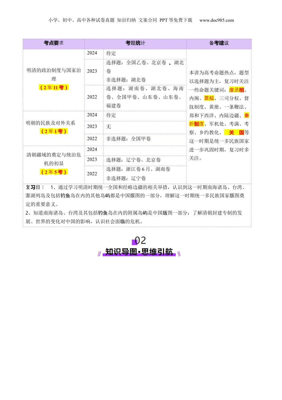 小学、初中、高中各种试卷真题知识归纳文案合同PPT等免费下载www.doc985.com第08讲从明朝建立到清军入关和清朝前中期的鼎盛与危机目录01考情透视·目标导航.................................................................................................202知识导图·思维领航.................................................................................................303考点突破·考法探究.................................................................................................4考点一明朝时期的内政外交与明清易代...............................................................................4知识点1明朝施政措施与明清易代..........................................................................................................4考向1明朝政治体制的变化............................................................................................................8知识点2官员的选拔与管理(选必一)...................................................................................................9考向2明朝官员选拔与管理..........................................................................................................10知识点3法律与教化(选必一).............................................................................................................11知识点4民族关系与对外交往(选必一).............................................................................................12考向3海上交通与沿海形势..........................................................................................................14知识点5户籍制度与基层治理(选必一).............................................................................................18考点二清朝时期的内政外交与统治危机...........................................................................19知识点1清朝施政措施与统治危机........................................................................................................19考向1康雍乾时期的君主专制......................................................................................................23知识点2官员的选拔与管理(选必一)...............................................................................................24知识点3法律与教化(选必一)..........................................................................................................24知识点4民族关系与对外交往(选必一)...........................................................................................25考向2疆域的奠定..........................................................................................................................28考向3海禁与闭关锁国..................................................................................................................29知识点5户籍与基层管理(选必一)...................................................................................................3004真题练习·命题洞见...............................................................................................30小学、初中、高中各种试卷真题知识归纳文案合同PPT等免费下载www.doc985.com考点要求考统题计考建备议明清的政治制度与国家治理(2年11考)2024待定本讲为高考命题热点,题型以选择题为主,复习时关注一些命题关键词:相废丞、内阁、票拟、三司分权、督抚制度、黄册、一条鞭法、郑和下西洋、内陆边疆、奏制折度、军机处、考满、考察、乡约教化、闭关闭国等这一时期是统一多民族国家进一步巩固时期,复习时多关注。2...