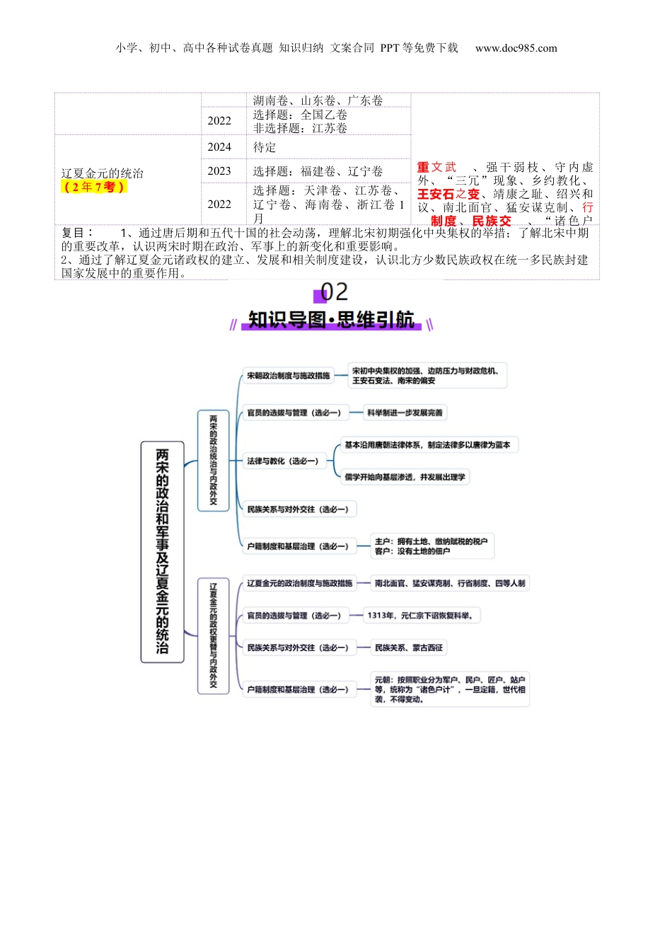 小学、初中、高中各种试卷真题知识归纳文案合同PPT等免费下载www.doc985.com第06讲两宋的政治和军事及辽夏金元的统治目录01考情透视·目标导航.................................................................................................202知识导图·思维领航.................................................................................................203考点突破·考法探究.................................................................................................3考点一两宋的政治统治与内政外交.......................................................................................3知识点1宋朝政治制度与施政措施..........................................................................................................3考向1宋初专制集权的加强..............................................................................................................8考向2王安石变法..............................................................................................................................9知识点2官员的选拔与管理(选必一).................................................................................................12知识点3法律与教化(选必一)............................................................................................................14知识点4民族关系与对外交往(选必一).............................................................................................14知识点5户籍制度和基层治理(选必一).............................................................................................15考点二辽夏金元的政权更替与内政外交...........................................................................17知识点1辽夏金元的政治制度与施政措施.............................................................................................17考向1辽与西夏..............................................................................................................................21考向2金朝入主中原........................................................................................................................22考向3元朝的地方管理....................................................................................................................23知识点2官员的选拔与管理(选必一)...............................................................................................24知识点3民族关系与对外交往(选必一)...........................................................................................25考向4元朝的民族关系....................................................................................................................26知识点4户籍制度和基层治理(选必一)...........................................................................................2804真题练习·命题洞见...............................................................................................28考点要求考统题计考建议备两宋的政治与国家治理(2年7考)2024待定本讲为高考命题热点,题型以选择题为主,复习时关注一些命题关键词:制度创新、文官政治、2023选择题:重庆卷、海南卷、小学、初中、高中各种试卷真题知识归纳文案合同PPT等免费下载www.doc985.com湖南卷、山东卷、广东卷重轻轻文武、强干弱枝、守内虚外、“三冗”现象、乡约教化、王安石变之、靖康之耻、绍兴和议、南北面官、猛安谋克制、行轻制度、民族交轻、“诸色户2022选择题:全国乙卷非选择题:江苏卷辽夏金元的统治(2年7考)2024待定2023选择题:福建卷、辽宁卷2022选...