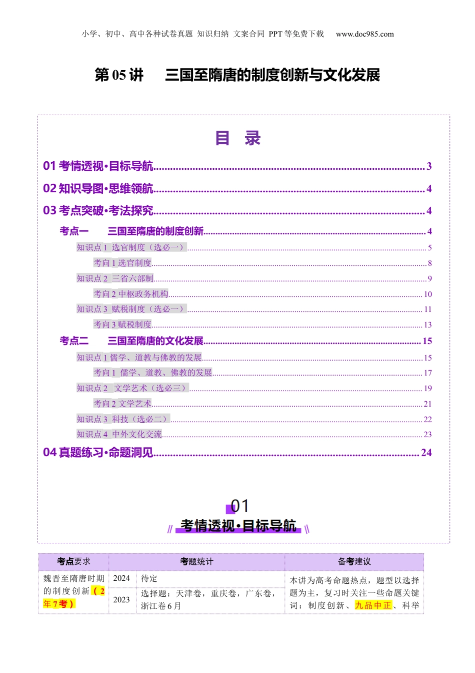 小学、初中、高中各种试卷真题知识归纳文案合同PPT等免费下载www.doc985.com第05讲三国至隋唐的制度创新与文化发展目录01考情透视·目标导航.................................................................................................302知识导图·思维领航.................................................................................................403考点突破·考法探究.................................................................................................4考点一三国至隋唐的制度创新.............................................................................................4知识点1选官制度(选必一).................................................................................................................5考向1选官制度..................................................................................................................................8知识点2三省六部制.................................................................................................................................9考向2中枢政务机构........................................................................................................................10知识点3赋税制度(选必一)................................................................................................................11考向3赋税制度................................................................................................................................13考点二三国至隋唐的文化发展...........................................................................................15知识点1儒学、道教与佛教的发展........................................................................................................15考向1儒学、道教、佛教的发展....................................................................................................17知识点2文学艺术(选必三)..............................................................................................................19考向2文学艺术................................................................................................................................21知识点3科技(选必二).......................................................................................................................22知识点4中外文化交流...........................................................................................................................2304真题练习·命题洞见...............................................................................................24考点要求考题统计考建备议魏晋至隋唐时期的制度创新(2年7考)2024待定本讲为高考命题热点,题型以选择题为主,复习时关注一些命题关键词:制度创新、九品中正、科举2023选择题:天津卷,重庆卷,广东卷,浙江卷6月小学、初中、高中各种试卷真题知识归纳文案合同PPT等免费下载www.doc985.com制、均田制、两税法、佛教、三教一合、魏晋玄学、建安文学、唐诗、书法艺术、唐盛气象等,这一时期是中华文明曲折发展时期过渡2022选择题:湖南卷,重庆卷,浙江卷1月三国至隋唐文化(2年5考)2024待定2023选择题:辽宁卷,全国乙卷非选择题:北京卷2022选择题:江苏卷,全国乙卷复目:1、通过把握三国两晋南北朝时期政权更迭的历史脉络,认识这一时期的重要改革和制度变化、区域开发、民族交融的特点和历史意义。2、通过把握三国至隋唐五代分合更迭的历史脉络,认识这一时期思想文化与社会领域中的新成就、新变化。小学、初中、高中各种试卷真题知识归纳文案合同PPT等免费下载www.doc985.com考点一三...