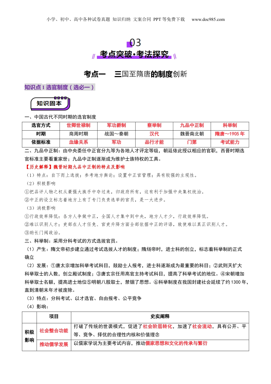 小学、初中、高中各种试卷真题知识归纳文案合同PPT等免费下载www.doc985.com第05讲三国至隋唐的制度创新与文化发展目录01考情透视·目标导航.................................................................................................202知识导图·思维领航.................................................................................................203考点突破·考法探究.................................................................................................3考点一三国至隋唐的制度创新.............................................................................................3知识点1选官制度(选必一).................................................................................................................3考向1选官制度..................................................................................................................................5知识点2三省六部制.................................................................................................................................6考向2中枢政务机构..........................................................................................................................7知识点3赋税制度(选必一).................................................................................................................7考向3赋税制度................................................................................................................................10考点二三国至隋唐的文化发展...........................................................................................10知识点1儒学、道教与佛教的发展........................................................................................................10考向1儒学、道教、佛教的发展....................................................................................................12知识点2文学艺术(选必三)..............................................................................................................13考向2文学艺术................................................................................................................................15知识点3科技(选必二).......................................................................................................................16知识点4中外文化交流...........................................................................................................................1604真题练习·命题洞见...............................................................................................17考点要求考题统计考建备议魏晋至隋唐时期的制度创新(2年7考)2024待定本讲为高考命题热点,题型以选择题为主,复习时关注一些命题关键词:制度创新、九品中正、科举2023选择题:天津卷,重庆卷,广东卷,浙江卷6月小学、初中、高中各种试卷真题知识归纳文案合同PPT等免费下载www.doc985.com制、均田制、两税法、佛教、三教一合、魏晋玄学、建安文学、唐诗、书法艺术、唐盛气象等,这一时期是中华文明曲折发展时期过渡2022选择题:湖南卷,重庆卷,浙江卷1月三国至隋唐文化(2年5考)2024待定2023选择题:辽宁卷,全国乙卷非选择题:北京卷2022选择题:江苏卷,全国乙卷复目:1、通过把握三国两晋南北朝时期政权更迭的历史脉络,认识这一时期的重要改革和制度变化、区域开发、民族交融的特点和历史意义。2、通过把握三国至隋唐五代分合更迭的历史脉络,认识这一时期思想文化与社会领域中的新成就、新变化。小学、初中、高中各种试卷真题知识归纳文案合同PPT等免费下载www.doc985.com考点一...