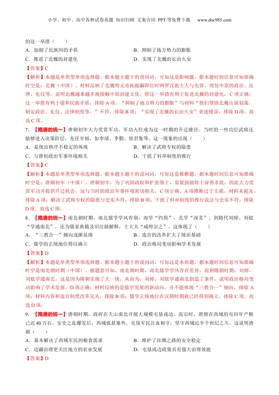 小学、初中、高中各种试卷真题知识归纳文案合同PPT等免费下载www.doc985.com第04讲三国至五代十国的政权更迭、民族交融、经济发展与社会治理目录模拟·基础演练...............................................................................................................1重难·创新演练...............................................................................................................6真题·实战演练...............................................................................................................91.【三国与两晋】西晋初年,晋武帝惩曹魏孤立之弊,大封同姓王,多达27人。这些王多担任都督诸军事和地方刺史,掌握军政大权。这一做法()A.壮大了门阀士族的力量B.实现了巩固统一的目的C.改变了刺史的原有职能D.埋下了宗室动乱的隐患【答案】D【解析】本题是单类型单项选择题。据本题次题干的设问词,可知这是影响题。据本题时间信息可知准确时空是:西晋初年(中国)。根据材料“大封同姓王,多达27人。这些王多担任一方面的都督诸军事和地方刺史,掌握军政大权”可知,西晋初期,同姓王权力较大,这为“八王之乱”埋下了隐患,D项正确;大封同姓王与门阀势力无关,排除A项;结合所学知识可知,这一做法并未达到巩固统一的目的,并且加剧了统治集团内部的矛盾,酿成“八王之乱”,排除B项;刺史职能在东汉就已经改变,排除C项。故选D项。2.【三国与两晋】在三国至隋朝的几百年的时间里,黄河保持着长期安流的局面,其中见于记载的河溢现象只有几次,如果要考察这一时期长期安流局面出现的原因,我们更应该关注的因素是()A.魏晋南北朝时期的动荡时局B.古代治理水患技术的进步C.政府对治理黄河水患的重视D.国家经济实力的提高【答案】A【解析】本题是单类型单项选择题。据本题主题干设问词,可知这是正向题。据本题时间信息可以得出准确时空是三国至隋朝时期中国。据材料可知,三国至隋朝时期,黄河长期安流,河溢现象较少。造成这种情况的原因主要是此时北方政局动荡严重,影响了北方农耕经济的发展。而这一时期北方农耕经济的衰退使得黄河流域的生态环境有了一定程度的改善,水土流失情况减轻,河溢现象减少,A项正确;据所学可小学、初中、高中各种试卷真题知识归纳文案合同PPT等免费下载www.doc985.com知,古代治理水患技术在不断进步,排除B项;历代政府对黄河水患的治理都较为重视,并非仅仅三国至隋朝这个历史周期,排除C项;据所学可知唐朝、宋朝的国家经济实力较三国至隋朝时期高,但黄河河溢现象却比三国至隋朝时期多,排除D项。故选A项。3.【三国与两晋】魏文帝时,设置“散骑常侍”一职,以备皇帝顾问。并下诏“今便以参散骑之选,方使少在吾门下知指归,便大用之矣。天下之士,欲使皆先历散骑,然后出据州郡,是吾本意也。”又据史籍记载,“是时,散骑皆以高才英儒充其选”。这些措施旨在()A.完善选官制度B.强化君主权威C.加强地方控制D.提升军队实力【答案】B【解析】本题是单类型单项选择题。据本题主题干的设问词,可知这是目的题。据本题时间信息可知准确时空是:曹魏(中国)。据本题材料信息得出主要结论:魏文帝设置“散骑常侍”以备皇帝顾问,并选拔高才英儒充其选,服务于皇帝,这有利于强化君主权威,B项正确;设置“散骑常侍”以备皇帝顾问,目的是强化君主权威,不是完善选官制度,排除A项;据材料“设置‘散骑常侍’一职,以备皇帝顾问”可知,加强的是君权,不是加强对地方控制,排除C项;散骑常侍是文官,与军队无关,排除D项。故选B项。4.【十六国与北朝】北魏太武帝田猎,大获麋鹿数千头,“诏尚书发车牛五百乘运之”,尚书古弼不从,上表曰:“今秋谷悬黄,麻菽布野,……乞赐矜缓,使得收载。”这反映了北魏()A.重农意识的增强B.三省制度的萌芽C.文化冲突的加剧D.社会动荡的现实【答案】A【解析】本题是单类型单项选择题。据本题主题干的设问词,可知这是本质题。据本题时间信息可知准确时空是:北魏时期(中国)。根据材料信息北魏太武帝狩猎千头,欲用牛车运送,...