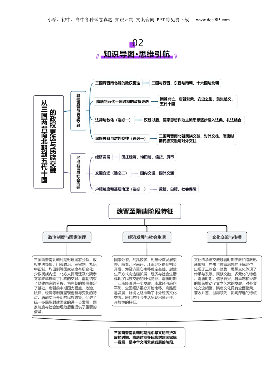 小学、初中、高中各种试卷真题知识归纳文案合同PPT等免费下载www.doc985.com第04讲三国至五代十国的政权更迭、民族交融、经济发展与社会治理目录01考情透视·目标导航.................................................................................................202知识导图·思维领航.................................................................................................303考点突破·考法探究.................................................................................................4考点一政权更替与民族交融.....................................................................................................4知知点1三国知知南北知的政权更迭......................................................................................................4考向1三国与两晋.............................................................................................................................7考向2十六国与北朝.........................................................................................................................8知知点2知知知五代十国知知的政权更迭...............................................................................................8考向3隋唐的统一...........................................................................................................................10考向4安史之乱与藩镇割据............................................................................................................11知知点3知知与知知(知知一).............................................................................................................11知知点4民族知知与知知交知(知知一).............................................................................................13考向5唐代的民族交融...................................................................................................................16考点二经济发展与社会治理.................................................................................................17知知点1经济发展....................................................................................................................................17考向1隋唐社会经济的发展...........................................................................................................21知知点2交知变知(知知二)...............................................................................................................21知知点3知知知知知知知治理(知知一)............................................................................................22考向2魏晋至隋唐社会治理...........................................................................................................2204真题练习·命题洞见...............................................................................................23考点要求考题统计考建备议小学、初中、高中各种试卷真题知识归纳文案合同PPT等免费下载www.doc985.com魏晋至隋唐时期的政权更迭与民族交融(2年10考)2024待定本讲为高考命题热点,题型以选择题为主,复习时关注一些命题关键词:三国鼎立、西晋统一、士族专权、民族交融、孝文帝改革、大运河、安史之乱、宦官专权、朋党之争、“黄籍”、“白籍”、知知知知、庄园经济、社会济救、隋唐运河、对外贸易、租庸制调、两税法等,这一时期是中华文明曲折发展时期,也是中华文明繁荣发展阶段,因此要引起重视,复习时重点把握。2023选择题:江苏卷、湖南卷、广东卷、湖北卷、山东卷、北京卷,2022选择题:北京卷、全国甲卷非...