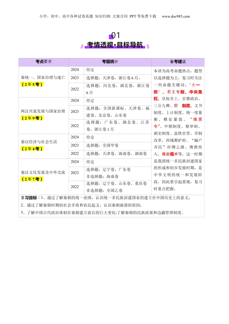 小学、初中、高中各种试卷真题知识归纳文案合同PPT等免费下载www.doc985.com第03讲秦汉统一多民族封建国家的建立与巩固目录01考情透视·目标导航...................................................................................................202知识导图·思维领航...................................................................................................303考点突破·考法探究...................................................................................................4考点一秦汉的政权更替和内政外交.........................................................................................4知识点1秦朝政治制度与施政措施..........................................................................................................4考向1秦朝的政治制度......................................................................................................................8知识点2汉朝政治制度与施政措施........................................................................................................12考向2西汉的建立与“文景之治“................................................................................................12考向3汉武帝加强中央集权的政治措施........................................................................................12考向4东汉的兴衰............................................................................................................................13知识点3官员的选拔与管理(选必一)................................................................................................13知识点4法律与教化(选必一)............................................................................................................14知识点5民族关系与对外交往(选必三)............................................................................................14知识点6户籍制度、基层治理和社会保障(选必一).........................................................................15考点二秦汉的经济与交通.....................................................................................................16知识点1经济发展...................................................................................................................................16考向1汉武帝加强中央集权经济措施...........................................................................................17知识点2交通建设(选必二)...............................................................................................................18考向2北击匈奴、丝绸之路...........................................................................................................19知识点3赋税制度(选必二)...............................................................................................................20考点三秦汉的文化和科技.....................................................................................................21知识点1秦汉中华文化的发展................................................................................................................21考向1儒学成为正统.......................................................................................................................22考向2两汉的文化...........................................................................................................................22知识点2秦汉科技的发展(包含其它领域).....................................