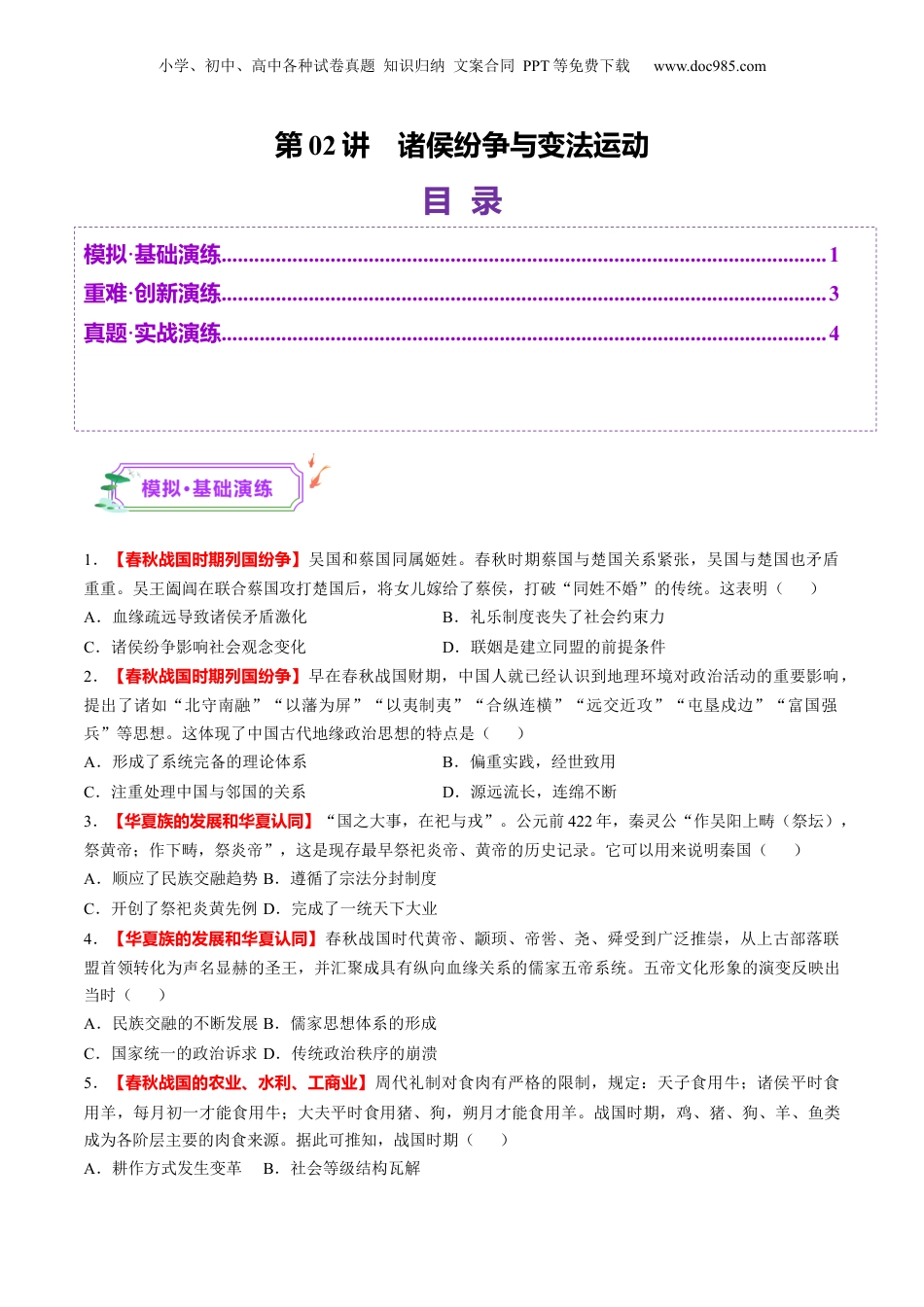 小学、初中、高中各种试卷真题知识归纳文案合同PPT等免费下载www.doc985.com第02讲诸侯纷争与变法运动目录模拟·基础演练...............................................................................................................1重难·创新演练...............................................................................................................3真题·实战演练...............................................................................................................41.【春秋战国时期列国纷争】吴国和蔡国同属姬姓。春秋时期蔡国与楚国关系紧张,吴国与楚国也矛盾重重。吴王阖阊在联合蔡国攻打楚国后,将女儿嫁给了蔡侯,打破“同姓不婚”的传统。这表明()A.血缘疏远导致诸侯矛盾激化B.礼乐制度丧失了社会约束力C.诸侯纷争影响社会观念变化D.联姻是建立同盟的前提条件2.【春秋战国时期列国纷争】早在春秋战国财期,中国人就已经认识到地理环境对政治活动的重要影响,提出了诸如“北守南融”“以藩为屏”“以夷制夷”“合纵连横”“远交近攻”“屯垦戍边”“富国强兵”等思想。这体现了中国古代地缘政治思想的特点是()A.形成了系统完备的理论体系B.偏重实践,经世致用C.注重处理中国与邻国的关系D.源远流长,连绵不断3.【华夏族的发展和华夏认同】“国之大事,在祀与戎”。公元前422年,秦灵公“作吴阳上畴(祭坛),祭黄帝;作下畴,祭炎帝”,这是现存最早祭祀炎帝、黄帝的历史记录。它可以用来说明秦国()A.顺应了民族交融趋势B.遵循了宗法分封制度C.开创了祭祀炎黄先例D.完成了一统天下大业4.【华夏族的发展和华夏认同】春秋战国时代黄帝、颛顼、帝喾、尧、舜受到广泛推崇,从上古部落联盟首领转化为声名显赫的圣王,并汇聚成具有纵向血缘关系的儒家五帝系统。五帝文化形象的演变反映出当时()A.民族交融的不断发展B.儒家思想体系的形成C.国家统一的政治诉求D.传统政治秩序的崩溃5.【春秋战国的农业、水利、工商业】周代礼制对食肉有严格的限制,规定:天子食用牛;诸侯平时食用羊,每月初一才能食用牛;大夫平时食用猪、狗,朔月才能食用羊。战国时期,鸡、猪、狗、羊、鱼类成为各阶层主要的肉食来源。据此可推知,战国时期()A.耕作方式发生变革B.社会等级结构瓦解小学、初中、高中各种试卷真题知识归纳文案合同PPT等免费下载www.doc985.comC.贵族阶层已经消失D.商品经济趋于繁荣6.【春秋战国的农业、水利、工商业】东周时期,各类民间音乐百花齐放,出现了具有商业性质的专业乐人和进行音乐消费的娱乐场所。据《苏秦列传》记载,“其民无不吹竽鼓瑟,弹琴击筑”。这一现象出现的主要原因是()A.生产工具的改进B.宗法分封体制遭到破坏C.礼乐制度的传承D.思想争鸣促进艺术创新7.【春秋战国的农业、水利、工商业】大约春秋初期,我国发明了冶铁技术,制造出最早的铁器;到春秋后期,发明展性铸铁技术,铁的硬度提高,适用于制造各种农具与手工用具;到战国后期,基本上完成了铁器的普及过程。据此可知,春秋战国时期()A.铁犁牛耕普及推广B.土地私有制确立C.大一统的格局初现D.社会生产力提高8.【春秋战国的改革与变法运动】鲁国在“初税亩”之后,还先后推出过“作丘甲”(把原来按照一甸田64井出车马兵甲,改为一丘田16井出车马兵甲,负担增加了4倍)和“用田赋”(按田亩征收兵甲、车马等军赋)。这些举措()A.得到了孔子的大力支持B.标志着战国时期开始形成C.顺应了时代发展的潮流D.使鲁国成为当时军事强国9.【春秋战国的改革与变法运动】钱穆在《中国经济史纲》中指出:“从春秋到战国是中国史上变动最激烈之时期,经济方面主要是从贵族御用工商及贵族私有的井田制而转变为后代的农工商兵的自由业,遂使战国时代有了一个前所未有的崭新的面貌。”下面对战国“崭新的面貌”解读正确的是()A.贵族政治已转化为官僚政治B.民营工商业完全取代“工商食官”C.华夏族与戎蛮夷狄完成民族交融形成汉族D.土地私有制逐步取代土地国有制10.【春秋战国的改革与变法运动】战国时...