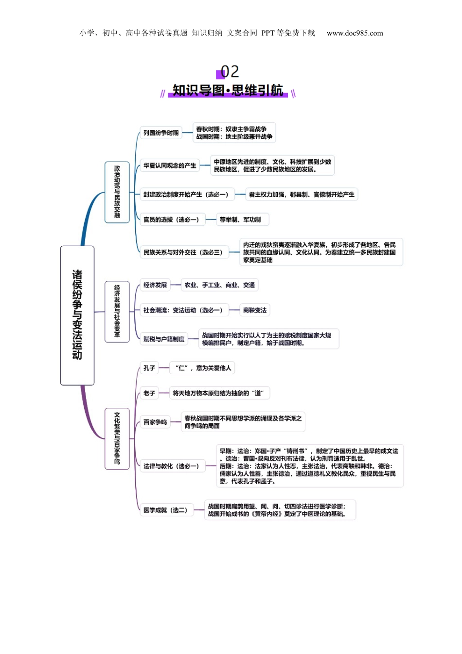 小学、初中、高中各种试卷真题知识归纳文案合同PPT等免费下载www.doc985.com第02讲诸侯纷争与变法运动目录01考情透视·目标导航.........................................................................................202知识导图·思维领航.........................................................................................403考点突破·考法探究.........................................................................................5考点一政治动荡与民族交融..............................................................................................5知识点1列国纷争时期.................................................................................................................................................5知识点2华夏认同观念的产生...................................................................................................................................6知识点3封建政治制度开始产生(选必一).......................................................................................................6知识点4官员的选拔(选必一)..............................................................................................................................7知识点5民族关系与对外交往(选必三)............................................................................................................7考向1春秋战国时期列国纷争...................................................................................................................................7考向2华夏族的发展和华夏认同..............................................................................................................................8考点二经济发展与社会变革.............................................................................................9知识点1经济发展........................................................................................................................................................9知识点2社会潮流:变法运动(选必一)........................................................................................................12知识点3赋税与户籍制度........................................................................................................................................13考向1春秋战国的农业、水利、工商业.............................................................................................................13考向2春秋战国的改革与变法运动......................................................................................................................14考点三文化繁荣与百家争鸣...........................................................................................15知识点1孔子................................................................................................................................................................15知识点2老子................................................................................................................................................................16知识点3百家争鸣.......................................................................................................................................................16知识点4法律与教化(选必一)............................................................................................................................17知识点5医学成就(选二)...........................