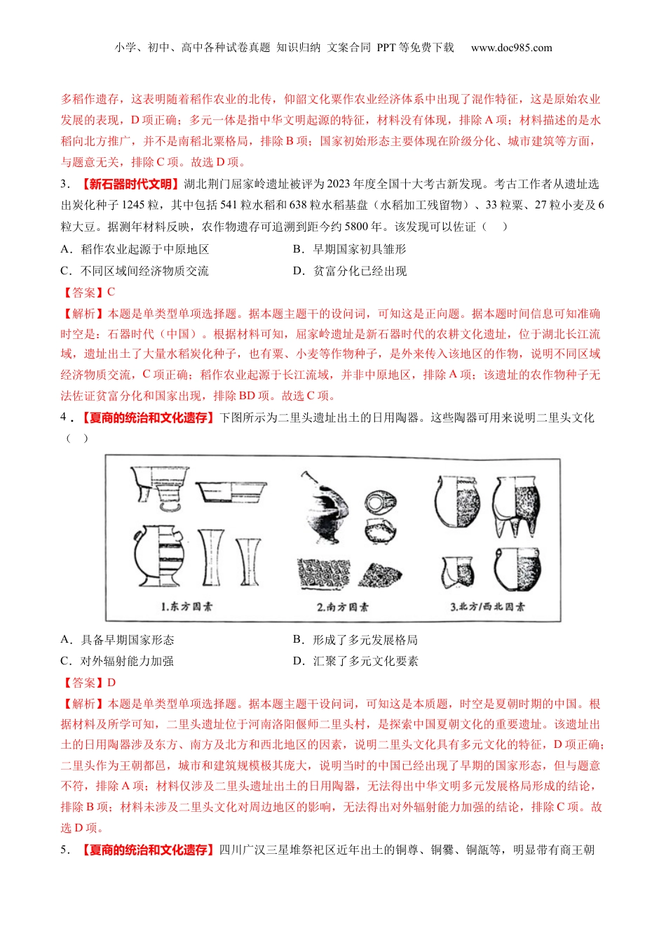 小学、初中、高中各种试卷真题知识归纳文案合同PPT等免费下载www.doc985.com第01讲中华文明的起源与早期国家目录模拟·基础演练...............................................................................................................1重难·创新演练...............................................................................................................8真题·实战演练.............................................................................................................121.【新石器时代文明】陶寺遗址为龙山时代的大型聚落遗址,考古发掘出1309座墓葬,其中大型墓仅有6座,不到墓总数的0.5%。大型墓内有木棺,棺底有朱砂,随葬品多达上百件,最多的达200余件。大型墓的左右两侧,往往对称地分布着两座中型墓,埋葬着装饰华贵的女性死者。据此推知,陶寺文化时期()A.氏族公共墓地出现B.母系氏族社会形成C.社会贫富分化悬殊D.国家初始形态明显【答案】C【解析】本题是单类型单项选择题。据本题主题干的设问词,可知这是推断题。据本题时间信息可知准确时空是:新石器时代(中国)。材料“大型墓仅有6座,不到墓葬总数的0.5%。大型墓内有木棺,棺底有朱砂,随葬品多达上百件,最多的达200余件”“大型墓的左右两侧,往往对称地分布着两座中型墓,埋葬着装饰华贵的女性死者”,表明陶寺文化时期社会贫富分化悬殊,少数贵族大量聚敛财富,形成了特权阶层,C项正确;根据“陶寺遗址为龙山时代的大型聚落遗址”,结合所学龙山时代处于新石器时代晚期,公共墓地出现于旧石器时代,排除A项;根据“陶寺遗址为龙山时代的大型聚落遗址”,结合所学龙山时代处于新石器时代晚期,属于父系氏族社会,排除B项;国家初始形态出现的依据包括遗址中有宫殿建筑及各种礼器,阶级分化也比较明显等,D项材料依据不足,排除D项。故选C项。2.【新石器时代文明】仰韶文化早期,中原地区多数村落的农作物种类为粟和黍,只有淮河流域的贾湖遗址发现有水稻。仰韶文化中晚期,中原的不少遗址如泉护村、大河村、西高崖、下王岗、下集等都发现了稻作遗存,当时中原地区呈现粟、稻兼种局面。这一变化()A.体现了多元一体的特点B.奠定了南稻北粟格局C.催生了国家的初始形态D.反映了原始农业发展【答案】D【解析】本题是单类型单项选择题。据本题主题干的设问词,可知这是影响题,时空是新石器时代中国。根据材料可知,仰韶文化早期中原地区水稻遗址较少,到了仰韶文化中晚期,水稻种植扩大,并发现了许小学、初中、高中各种试卷真题知识归纳文案合同PPT等免费下载www.doc985.com多稻作遗存,这表明随着稻作农业的北传,仰韶文化粟作农业经济体系中出现了混作特征,这是原始农业发展的表现,D项正确;多元一体是指中华文明起源的特征,材料没有体现,排除A项;材料描述的是水稻向北方推广,并不是南稻北粟格局,排除B项;国家初始形态主要体现在阶级分化、城市建筑等方面,与题意无关,排除C项。故选D项。3.【新石器时代文明】湖北荆门屈家岭遗址被评为2023年度全国十大考古新发现。考古工作者从遗址选出炭化种子1245粒,其中包括541粒水稻和638粒水稻基盘(水稻加工残留物)、33粒粟、27粒小麦及6粒大豆。据测年材料反映,农作物遗存可追溯到距今约5800年。该发现可以佐证()A.稻作农业起源于中原地区B.早期国家初具雏形C.不同区域间经济物质交流D.贫富分化已经出现【答案】C【解析】本题是单类型单项选择题。据本题主题干的设问词,可知这是正向题。据本题时间信息可知准确时空是:石器时代(中国)。根据材料可知,屈家岭遗址是新石器时代的农耕文化遗址,位于湖北长江流域,遗址出土了大量水稻炭化种子,也有粟、小麦等作物种子,是外来传入该地区的作物,说明不同区域经济物质交流,C项正确;稻作农业起源于长江流域,并非中原地区,排除A项;该遗址的农作物种子无法佐证贫富分化和国家出现,排除BD项。故选C项。4.【夏商的统治和文化遗存】下图所示为二里头遗址出土的日用陶器。这些陶器可用来说明二里头文化()A.具备早期国家形态B.形...
