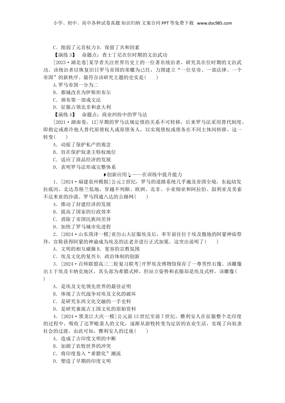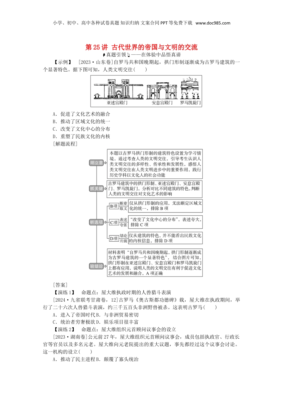 小学、初中、高中各种试卷真题知识归纳文案合同PPT等免费下载www.doc985.com第25讲古代世界的帝国与文明的交流真题引领——在体验中品悟真谛【示例】[2023·山东卷]自罗马共和国晚期起,拱门形制逐渐成为古罗马建筑的一个显著特色。据下图可知,人类文明交往()A.促进了文化艺术的融合B.推动了区域文化的统一C.改变了文化中心的分布D.重塑了民族文化的内核[解题流程][答案]【演练1】命题点:屋大维执政时期的人兽猎斗表演[2024·九省联考甘肃卷,12]古罗马《奥古斯都功德碑》载,屋大维在执政期间,举行了二十六次人兽猎斗表演,约三千五百头非洲野兽被杀。这表明古罗马()A.进入了帝国时代B.与非洲贸易密切C.统治者穷奢极欲D.娱乐项目很丰富【演练2】命题点:屋大维组织元首顾问议事会的设立[2023·湖南卷]公元前27年,屋大维组织元首顾问议事会,成员包括执政官、行政长官等官员以及多名元老。屋大维向元老院提出的重大议题,事先都经过这个议事会讨论。这一机构的设立()A.推动了民主进程B.颠覆了寡头统治小学、初中、高中各种试卷真题知识归纳文案合同PPT等免费下载www.doc985.comC.削弱了元首权力D.保留了共和因素【演练3】命题点:查士丁尼在位时期的文治武功[2023·湖北卷]某学者关注世界历史上的一位著名统治者,研究其在位时期的文治武功。该统治者以恢复旧日罗马帝国的荣耀为己任,力图建立“一位皇帝、一部法律、一个帝国”的新秩序。最符合该研究主题的史实是()A.罗马帝国一分为二B.都城改名为伊斯坦布尔C.颁布第一部成文法D.征服占领北非和意大利【演练4】命题点:商业纠纷中的罗马法[2021·湖南卷,12]早期的罗马法规定债的关系不可转移,后来罗马法采用替代制度,即指定或准许他人替代原债权人或原债务人,以实现债权或债务在不同主体间转移。这一转变()A.动摇了保护私产的观念B.旨在保护奴隶主特权地位C.适应了商品经济的发展D.表明罗马法形成完整体系创新应用——在训练中提升能力1.[2024·福建泉州模拟]公元2世纪,罗马的道路系统几乎遍及帝国全境,东起幼发拉底河,北达苏格兰低地,穿越不列颠、欧洲、北非、小亚细亚和阿拉伯、叙利亚及美索不达米亚的沙漠。罗马四通八达的公路网()A.推动了封建经济的发展B.提高了国家的行政效率C.消除了帝国民族间差异D.加快了罗马城市化进程2.[2024·山东菏泽一模]亚历山大征服埃及后,率军前往位于埃及腹地的阿蒙神庙祭拜,宣称获得阿蒙的神谕成为埃及的法老并进行正式加冕。这突出说明了()A.文明的相互碰撞B.宽容的宗教氛围C.埃及文化的复兴D.政治体制的创新3.[2024·百师联盟高三二轮复习联考]开罗埃及博物馆保存了一尊男性石像。该雕像出土于埃及卡纳克地区,其头部为希腊式样,但站立姿势和衣服却是埃及式样。该雕像()A.是埃及文化领先世界的最佳证明B.体现了古代战争对埃及文化的破坏C.是研究东西文化交融的一手史料D.是研究塞琉古王国文化的原始资料4.[2024·黑龙江大庆一模]公元前13世纪至前7世纪,雅利安人在征服整个北印度的过程中,吸收了达罗毗荼人的文化,逐渐从游牧转变为定居的农业生活,实现了向奴隶社会的过渡。由此可知,雅利安人的迁徙()A.造成了古印度文明的中断B.加剧了农牧世界的冲突C.将印度卷入“希腊化”潮流D.塑造了早期的印度文明小学、初中、高中各种试卷真题知识归纳文案合同PPT等免费下载www.doc985.com真题引领——在体验中品悟真谛【示例】答案:A【演练1】解析:据题意可知,屋大维在执政期间,举行了二十六次人兽猎斗表演,约三千五百头非洲野兽被杀,说明当时罗马贵族统治比较奢侈,穷奢极欲,C项正确;公元前27年,屋大维被元老院授予“奥古斯都”称号,罗马历史也就以此为标志进入了帝国时代,材料内容与罗马进入帝国时代无关,排除A项;材料强调罗马的人兽猎斗表演多,并未涉及商品交换,无法说明与非洲贸易密切,排除B项;材料强调“举行了二十六次人兽猎斗表演”,说明娱乐项目并不丰富,排除D项。故选C项。答案:C【演练2】解析:据题干可知主要结论:屋大维执政时期,屋大维组建元首顾问议事会,参与国家大事的讨论,然后在元老...