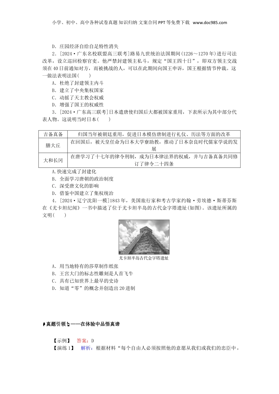 小学、初中、高中各种试卷真题知识归纳文案合同PPT等免费下载www.doc985.com第26讲中古时期的世界真题引领——在体验中品悟真谛【示例】[2023·新课标全国卷,32]有学者认为,直到13世纪,拜占庭人才被迫接受如下现实:他们的皇帝已经不具备所称的“统治全人类”的能力,皇帝的许可与授权已失去意义。这可以用来说明()A.限制君主权力的思想广泛传播B.地跨亚非欧三洲的奥斯曼帝国形成C.地中海地区出现资本主义萌芽D.东罗马帝国疆域的缩减及国力损耗[解题流程][答案]【演练1】命题点:法兰克王国颁布的《麦尔森法令》[2024·九省联考河南卷,32]847年,西法兰克王国颁布《麦尔森法令》:“每个自由人必须按照他的意愿从我们或我们的忠臣中,选择一个领主……如无正当理由任何人都不得离开他的领主……我们要把权利赐给我们的忠臣们,而且我们决不愿对他们做任何违反理性的事。”这表明该王国()A.封建化程度加深B.试图抑制市民流动C.王权进一步强化D.巩固了国家的统一【演练2】命题点:13世纪英格兰的庄园经济[2023·湖北卷,12]13世纪时,英格兰的一则小品剧中,庄园领主在法庭上公开讨论小麦、奶酪、鸡蛋和小乳猪的价格。无独有偶,《田庄总管职责》也提醒领主和总管,羊毛应该论包或以一只羊一次所剪的毛为单位出售,怎样卖收益最大、好处最多,就怎样卖小学、初中、高中各种试卷真题知识归纳文案合同PPT等免费下载www.doc985.com上述材料反映英格兰()A.封建庄园制度已濒临崩溃B.庄园农产品获利丰厚C.农业的经济转型趋势初显D.圈地运动正迅速开展【演练3】命题点:8世纪日本农业政策的变化[2023·湖南卷,12]公元723年,日本太政官奏:“百姓渐多,田地窄狭。望请劝课天下,开辟田畴。其有新造沟池营开垦者,不限多少,给传三世。若逐旧沟池,给其一身。”天皇准奏。这()A.反映了灌溉技术进步B.动摇了土地公有原则C.体现了天皇地位提高D.推动了庄园制度发展【演练4】命题点:墨西哥的古代文明[2023·浙江6月卷]1519年,一群西班牙殖民者闯入墨西哥中部的高原,进攻阿兹特克人国家,抵达其岛上都城特诺奇蒂特兰之际,所发现的文明令他们大受震撼。下列项中“令他们大受震撼”的最有可能是()【演练5】命题点:中古时期的法兰西王国[2022·山东卷]下图所列为12世纪前期法兰西卡佩王朝路易六世在位期间的若干举措。这些举措旨在()○面对当时方兴未艾的城市自治运动,支持城市公社。○改组御前会议,吸收若干忠于国王的市民、教士和中小封建主参加。○当阿基坦公爵去世时,让儿子娶公爵的女继承人为妻,借此控制阿基坦的领土。A.推动城市崛起B.加强国王权力C.建立民族国家D.发展庄园经济创新应用——在训练中提升能力1.[2024·高三模拟]中世纪早期,欧洲庄园生产的产品主要用于满足庄园主的奢侈享受,并保障农民的基本生活。然而到了10~11世纪,众多城市开始兴起,生活在城市中的消费群体日益庞大,庄园生产逐渐转型,开始专注生产城市消费所需要的东西。这一变化反映出()A.城市已成为国家的政治中心B.庄园生产的商品化趋势加强C.庄园主成为了新兴资产阶级小学、初中、高中各种试卷真题知识归纳文案合同PPT等免费下载www.doc985.comD.庄园经济自给自足特性消失2.[2024·广东名校联盟高三联考]路易九世统治法国期间(1226~1270年)进行司法改革,设立巡回检察官吏。他严禁封建领主私斗,规定“国王四十日”,即双方领主交战须在40日前通知对方,而被挑战的人,可以在此期间向国王申诉,国王根据情节仲裁。这一做法表明法国()A.杜绝了封建领主内斗B.建立了中央集权国家C.动摇了天主教会权威D.增强了国王的权威性3.[2024·广东高三联考]日本遣唐使归国后大都被国家重用,下表所示为其中部分代表人物。这说明当时日本()吉备真备归国当年被朝廷重用,促进日本模仿唐制进行礼仪、历法等方面的改革膳大丘在回国后,被天皇任命为日本大学寮助教,推动了日本奈良时代儒家学说的发展大和长冈在唐学习了十七年的律令刑制,成为日本律法界的权威,并与吉备真备共同修订了律令二十四条A.快速完成了封建化B.全面学习唐朝的政治制度C.深受唐文化的影响D.借鉴...