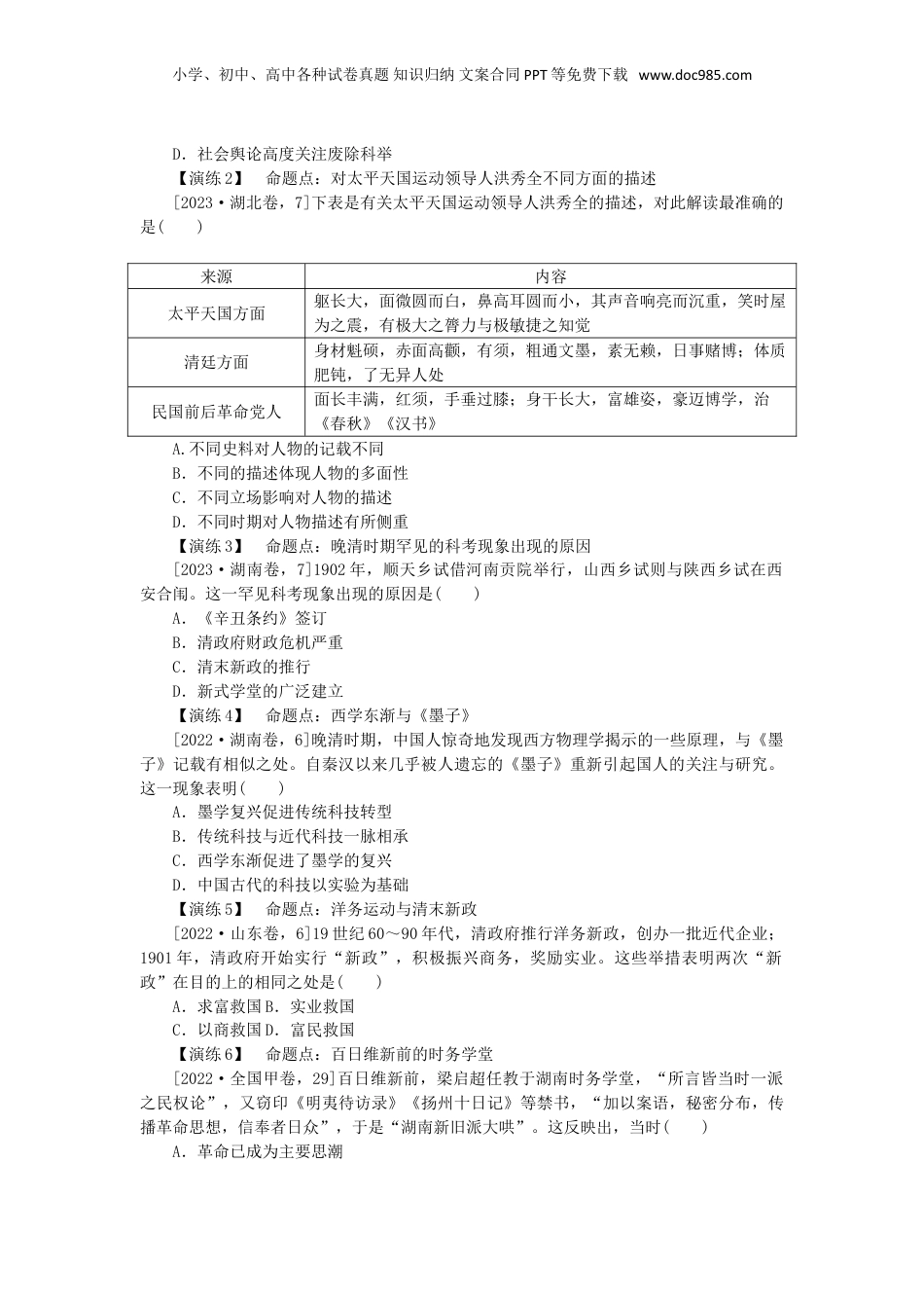 小学、初中、高中各种试卷真题知识归纳文案合同PPT等免费下载www.doc985.com第14讲国家出路的探索与挽救民族危亡的斗争真题引领——在体验中品悟真谛【示例】[2022·广东卷,6]下表为1889年张之洞与李鸿章的争论人物主张张之洞储铁宜急,勘路宜缓……前六七年积款积铁,后三四年兴工修造(铁路)……岂有地球之上独中华之铁皆是弃物?李鸿章筹划开矿,炼成铁条(钢轨),器款甚巨,岂能各省同开?……日本铁路日增,至今工料皆用土产,惟钢轨等项仍购西洋。二人争论的问题是()A.洋务运动要不要借鉴明治维新B.兴办炼铁业可否举借外债C.军事工业和民用工业孰重孰轻D.修筑铁路与炼铁孰先孰后[解题流程][答案]【演练1】命题点:戊戌维新主要内容及影响[2024·九省联考甘肃卷,7]戊戌维新之际,光绪帝欲行科举改制,如武科改试枪炮、八股改为策论等。《申报》于1898年先后发表时评,提出武科未有改制细则,“不宜全废弓矢”;八股不宜全废,应与策论等并行。由此可推知()A.维新变法拥有广泛社会基础B.报刊对维新变法持反对态度C.科举改制尚未达成社会共识小学、初中、高中各种试卷真题知识归纳文案合同PPT等免费下载www.doc985.comD.社会舆论高度关注废除科举【演练2】命题点:对太平天国运动领导人洪秀全不同方面的描述[2023·湖北卷,7]下表是有关太平天国运动领导人洪秀全的描述,对此解读最准确的是()来源内容太平天国方面躯长大,面微圆而白,鼻高耳圆而小,其声音响亮而沉重,笑时屋为之震,有极大之膂力与极敏捷之知觉清廷方面身材魁硕,赤面高颧,有须,粗通文墨,素无赖,日事赌博;体质肥钝,了无异人处民国前后革命党人面长丰满,红须,手垂过膝;身干长大,富雄姿,豪迈博学,治《春秋》《汉书》A.不同史料对人物的记载不同B.不同的描述体现人物的多面性C.不同立场影响对人物的描述D.不同时期对人物描述有所侧重【演练3】命题点:晚清时期罕见的科考现象出现的原因[2023·湖南卷,7]1902年,顺天乡试借河南贡院举行,山西乡试则与陕西乡试在西安合闱。这一罕见科考现象出现的原因是()A.《辛丑条约》签订B.清政府财政危机严重C.清末新政的推行D.新式学堂的广泛建立【演练4】命题点:西学东渐与《墨子》[2022·湖南卷,6]晚清时期,中国人惊奇地发现西方物理学揭示的一些原理,与《墨子》记载有相似之处。自秦汉以来几乎被人遗忘的《墨子》重新引起国人的关注与研究。这一现象表明()A.墨学复兴促进传统科技转型B.传统科技与近代科技一脉相承C.西学东渐促进了墨学的复兴D.中国古代的科技以实验为基础【演练5】命题点:洋务运动与清末新政[2022·山东卷,6]19世纪60~90年代,清政府推行洋务新政,创办一批近代企业;1901年,清政府开始实行“新政”,积极振兴商务,奖励实业。这些举措表明两次“新政”在目的上的相同之处是()A.求富救国B.实业救国C.以商救国D.富民救国【演练6】命题点:百日维新前的时务学堂[2022·全国甲卷,29]百日维新前,梁启超任教于湖南时务学堂,“所言皆当时一派之民权论”,又窃印《明夷待访录》《扬州十日记》等禁书,“加以案语,秘密分布,传播革命思想,信奉者日众”,于是“湖南新旧派大哄”。这反映出,当时()A.革命已成为主要思潮小学、初中、高中各种试卷真题知识归纳文案合同PPT等免费下载www.doc985.comB.维新派变法策略未能统一C.变法思想的根本转变D.维新派侧重动员民众变法创新应用——在训练中提升能力1.[2024·长春市高三模拟]下表反映出林则徐视野转移的轨迹是()禁烟运动前后林则徐的主要活动1823年任江苏按察使1837年升湖广总督1839年受命钦差大臣赴广东禁烟1840年主持禁烟期间澄清江苏吏治,改革审判程序,亲自裁决案件采取“修防兼重”,使江汉数千里长堤无一处漫口请人翻译英人慕瑞的《世界地理大全》,在此基础上辑成了《四洲志》购买外洋大炮,“并购旧洋船为式,使兵士演习攻首尾、跃中舱之法”A.由改革内政到关注世界B.由匡时济世到倡导变革C.由补偏救弊到拨乱反正D.由天朝上国到师夷长技2.[2024·安徽、吉林、黑龙江、云南四省模拟]1854年,英国驻上海领事馆某官员在一份考察太平天国...