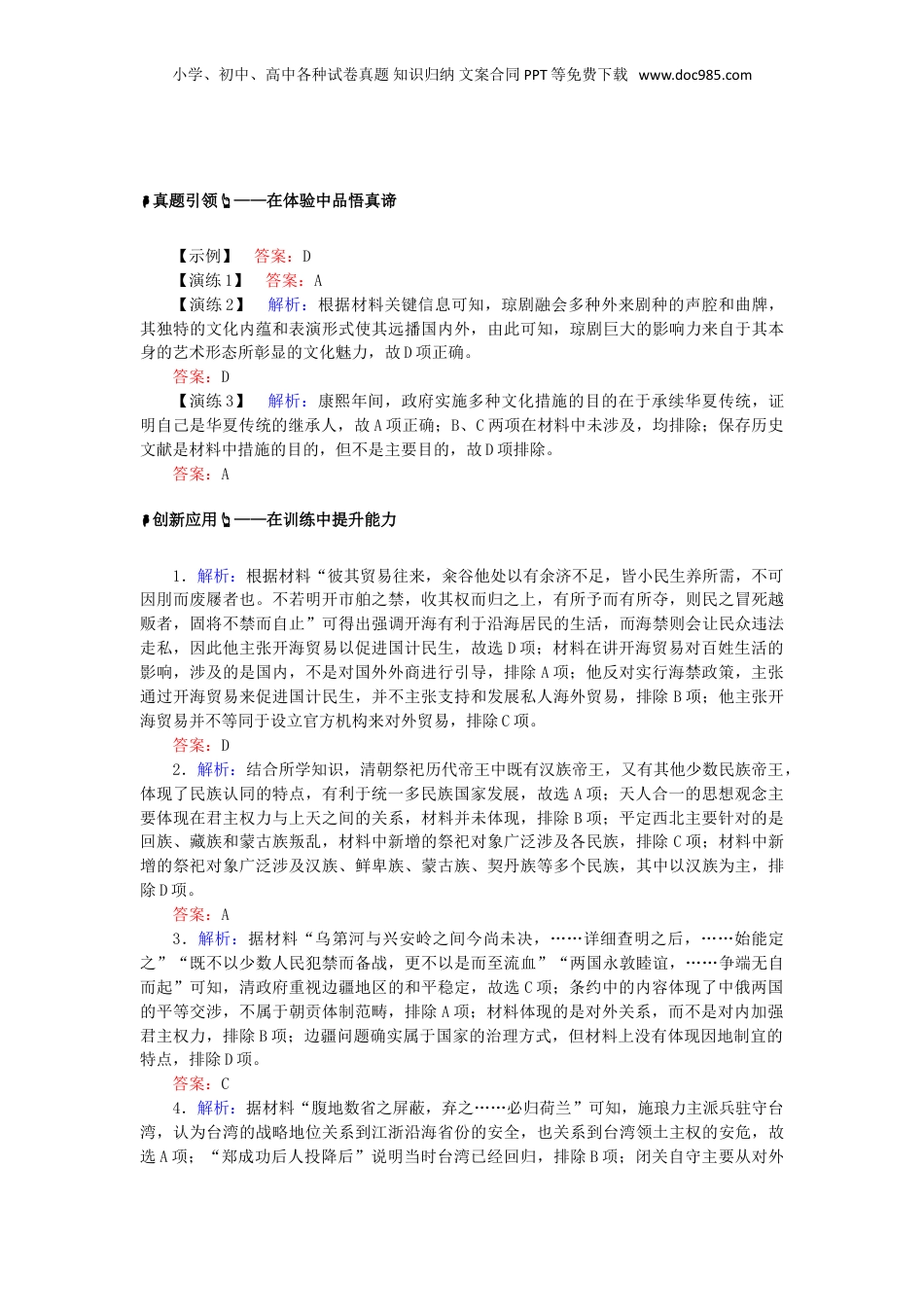 小学、初中、高中各种试卷真题知识归纳文案合同PPT等免费下载www.doc985.com第11讲明清时期统一多民族国家的发展和版图的奠定真题引领——在体验中品悟真谛【示例】[2023·湖南卷]永乐年间,明成祖应朝鲜使臣请赐,赐予朝鲜“五经”“四书”等经籍;又应日本使臣请赐,将皇后徐氏所制《劝善书》《内训》赐予日本。对此解读合理的是()A.儒家学说在明初有新发展B.书籍向外流通渠道不畅通C.请求赐书是为了吸收中国先进思想D.朝日两国借助明王朝强化政权权威[解题流程][答案]【演练1】命题点:明朝中后期的海上贸易交往[2024·九省联考广西卷,5]明中后期,“大抵日本所须,皆产自中国……如饶之瓷器,湖之线棉,漳之纱绢,松之棉布,尤为彼国所重”。闽人“闻日本可市……即以财货往市之,得获大利而归”,吴越之民“往则载货扬航以市海为名,归则镕金附身”。上述现象的出现()A.有利于海外白银的大量流入B.动摇了小农经济的统治地位C.有利于商业航海技术的提升D.体现了重商主义思想的传播【演练2】命题点:明代的文化交流[2023·海南卷]琼剧源于明代传入的“军戏”。它以中板为主,融会了多种外来剧种的声腔和曲牌,到20世纪30年代才有现名。有戏谚云:“生脚儒雅且潇洒,旦脚文静又婉娇。彩旦辣,花生刁,书僮天真梅香飘。”独特的文化内蕴和表演形式使其远播粤、桂等地以及东南亚一些地区。这一历程主要反映()A.故土情结助推文化传承B.人口迁徙促进文化交流C.商路畅通带动文化传播D.艺术形态彰显文化魅力【演练3】命题点:清代为维护统一多民族国家采取的文化政策[2022·全国甲卷]康熙年间,多次令各地举荐山林隐逸,又令官员推举博学鸿儒,吸收学行兼优之士。开设明史馆,召集文人编纂明史,还进行多部儒经传注的修纂,编成《康熙字典》。上述措施的主要目的是()A.承续华夏传统B.倡导疑古辨伪小学、初中、高中各种试卷真题知识归纳文案合同PPT等免费下载www.doc985.comC.弘扬程朱理学D.保存历史文献创新应用——在训练中提升能力1.[2024·福建三明高三联考]明朝福建巡抚许孚远认为,“彼其贸易往来,籴谷他处以有余济不足,皆小民生养所需,不可因刖而废屦者也。不若明开市舶之禁,收其权而归之上,有所予而有所夺,则民之冒死越贩者,固将不禁而自止”。由此可知,他主张()A.合理引导来华外商的行为B.支持和发展私人海外贸易C.设官方机构管理对外贸易D.开海贸易以促进国计民生2.[2024·江苏南通一模]顺治二年,清朝祭祀历代帝王增入明太祖、辽太祖、金太祖、金世宗、元太祖。乾隆四年,更议历代帝王庙祀典,增祀两晋、元魏、前后五代各帝王。这一做法()A.利于统一多民族国家认同B.崇尚天人合一的思想观念C.出于平定西北的现实需要D.强调清朝承辽金元为正统3.[2024·重庆一中月考]1689年,经康熙帝筹划,派出以大学士索额图为首的代表团,赴尼布楚(今俄国涅尔琴斯克),签订了中俄第一个界约《中俄尼布楚议界条约》,以下是条约中的部分内容。据此可知清朝()一以流入黑龙江之绰尔纳河,附近之格尔必齐河为两国之界。……乌第河与兴安岭之间今尚未决,须待使臣各归本国,详细查明之后,……始能定之。二若数十人越境相聚,或持械捕猎,或杀人劫掠,……依罪处以死刑。既不以少数人民犯禁而备战,更不以是而至流血。六两国永敦睦谊,自来边境一切争执永予废除,倘各严守约章,争端无自而起。A.朝贡体制向近代转型B.君主专制程度逐步加强C.重视边疆的和平稳定D.国家治理方式因地制宜4.[2024·广东佛山顺德区一模]郑成功后人投降后,水师提督施琅认为台湾是江、浙、闽、粤“腹地数省之屏蔽,弃之……必归荷兰”,故奏请康熙帝派兵一万分守台湾、澎湖施琅的上述主张在当时有助于()A.捍卫东南海疆安全B.加快统一台湾进程C.强化闭关自守政策D.驱逐荷兰殖民势力小学、初中、高中各种试卷真题知识归纳文案合同PPT等免费下载www.doc985.com真题引领——在体验中品悟真谛【示例】答案:D【演练1】答案:A【演练2】解析:根据材料关键信息可知,琼剧融会多种外来剧种的声腔和曲牌,其独特的文化内蕴和表演形式使其远播国内外,由此可知,琼剧巨大...