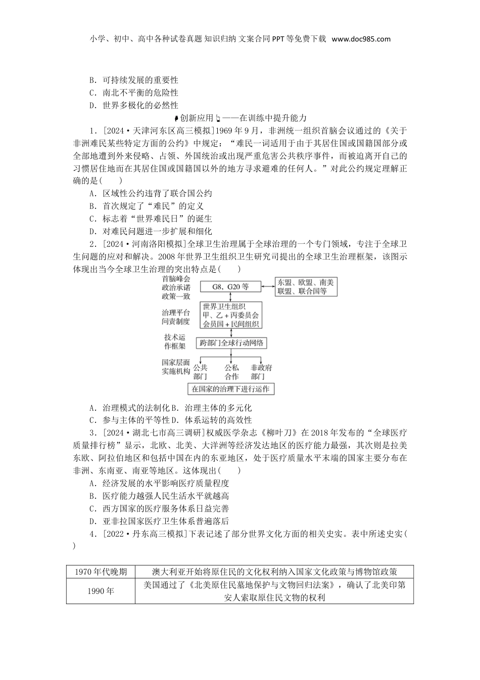 小学、初中、高中各种试卷真题知识归纳文案合同PPT等免费下载www.doc985.com第42讲世界现代社会生活的进步与文化交流保护真题引领——在体验中品悟真谛【示例】[2021·湖北卷]1960年,尼日利亚作家阿契贝发表小说《动荡》。小说主人公奥比在伦敦街头遇到可以用本部族语言交流的尼日利亚人时感到高兴,为与不同部族的尼日利亚人只能用宗主国语言英语交流而感到羞耻。作者通过该情节表达了对于()A.民族文化认同的忧虑B.殖民经济霸权的批判C.国家日渐开放的欣慰D.大国政治对抗的不满[解题流程][答案]【演练1】命题点:辩证看待20世纪以来科技的发展[2024·九省联考黑龙江、吉林卷,16]20世纪以来,科技迅猛发展提升了民众生活质量。但有学者提出,基因密码破译工程将导致生命的安全感消失;电子传媒的发达会导致世界各民族青少年文化品味趋同,破坏人类文化生态平衡。该观点反映了科技发展()A.缘于提升生活质量的需求B.引发了深刻的社会变革C.需要协调好与人文的关系D.推动社会进入信息时代【演练2】命题点:世界食物生产与粮食安全[2022·天津卷]有学者指出,1950~1985年,世界人口增长了1.9倍,世界谷物产量增长了2.8倍;但能源消耗量增长了3.7倍,全球粮食作物的种植面积自1981年后逐年下降。由此可见()A.经济全球化的迫切性小学、初中、高中各种试卷真题知识归纳文案合同PPT等免费下载www.doc985.comB.可持续发展的重要性C.南北不平衡的危险性D.世界多极化的必然性创新应用——在训练中提升能力1.[2024·天津河东区高三模拟]1969年9月,非洲统一组织首脑会议通过的《关于非洲难民某些特定方面的公约》中规定:“难民一词适用于由于其居住国或国籍国部分或全部地遭到外来侵略、占领、外国统治或出现严重危害公共秩序事件,而被迫离开自己的习惯居住地而在其居住国或国籍国以外的地方寻求避难的任何人。”对此公约规定理解正确的是()A.区域性公约违背了联合国公约B.首次规定了“难民”的定义C.标志着“世界难民日”的诞生D.对难民问题进一步扩展和细化2.[2024·河南洛阳模拟]全球卫生治理属于全球治理的一个专门领域,专注于全球卫生问题的应对和解决。2008年世界卫生组织卫生研究司提出的全球卫生治理框架,该图示体现出当今全球卫生治理的突出特点是()A.治理模式的法制化B.治理主体的多元化C.参与主体的平等性D.体系运转的高效性3.[2024·湖北七市高三调研]权威医学杂志《柳叶刀》在2018年发布的“全球医疗质量排行榜”显示,北欧、北美、大洋洲等经济发达地区的医疗能力最强,其次则是拉美东欧、阿拉伯地区和包括中国在内的东亚地区,处于医疗质量水平末端的国家主要分布在非洲、东南亚、南亚等地区。这体现出()A.经济发展的水平影响医疗质量程度B.医疗能力越强人民生活水平就越高C.西方国家的医疗服务体系日益完善D.亚非拉国家医疗卫生体系普遍落后4.[2022·丹东高三模拟]下表记述了部分世界文化方面的相关史实。表中所述史实()1970年代晚期澳大利亚开始将原住民的文化权利纳入国家文化政策与博物馆政策1990年美国通过了《北美原住民墓地保护与文物回归法案》,确认了北美印第安人索取原住民文物的权利小学、初中、高中各种试卷真题知识归纳文案合同PPT等免费下载www.doc985.com1995年联合国教科文组织提出了“现代国际法归还文物的原则”,即任何因战争原因而被抢夺或丢失的文物都应归还,没有任何时间限制A.提升了典藏文物的合法性B.体现出文物保护的公平性C.使社会群体权益得到重视D.可推动文化的传承与保护真题引领——在体验中品悟真谛【示例】答案:A【演练1】解析:据材料“但有学者提出……导致生命的安全感消失……破坏人类文化生态平衡”并结合所学可得出,科技发展虽提高了民众生活质量,但也给人类文化带来了风险,故科技发展需要协调好与人文的关系,C项正确;材料体现科技发展的双重影响,不是研究原因,排除A项;题干强调既改变了民众生活质量,又给文化带来了不利影响,没有社会变革,排除B项;科技推动社会进入信息时代只是强调积极影响,概括不全面,排除D项。故选C项。答案:C【演练2】解析:根据材料可知,195...