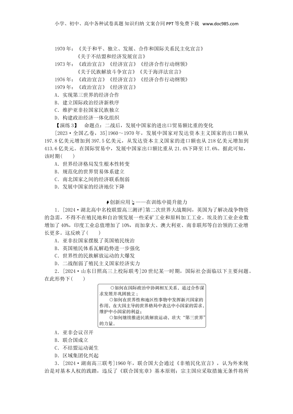小学、初中、高中各种试卷真题知识归纳文案合同PPT等免费下载www.doc985.com第40讲世界殖民体系的瓦解与新兴国家的发展真题引领——在体验中品悟真谛【示例】[2023·山东卷,14]1961年,加纳领导人克瓦米·恩克鲁玛在其著作中指出,非洲许多地区在文化、语言和思想上确实存在着很大差异,但“我们都是非洲人,这是基本的事实……语言、文化和政治体制不同所带来的困难并不是不能战胜的”。他力图()A.实现非洲各国的独立B.建立非洲国家的联合C.保持非洲地区文化的多元性D.解决非洲内部发展的不平衡[解题流程][答案]【演练1】命题点:冷战意识对美国种族问题的影响[2022·全国甲卷,35]1951年,美国黑人团体民权大会向联合国发起请愿活动,指控美国政府对黑人犯有种族灭绝罪行。美国政府指责请愿活动是共产主义的宣传,并寻找支持政府的黑人来驳斥这些指控。这反映出当时()A.美苏两极对峙格局的正式形成B.民权大会的指控缺乏事实依据C.美国对待种族问题的态度受冷战意识影响D.美国政府对国内的种族平等问题漠不关心【演练2】命题点:不结盟运动的发展[2021·新高考山东卷,15]下图是20世纪70年代历次不结盟国家和政府首脑会议发表的主要文件。它们反映出不结盟运动发展的目标是()小学、初中、高中各种试卷真题知识归纳文案合同PPT等免费下载www.doc985.com1970年:《关于和平、独立、发展、合作和国际关系民主化宣言》《关于不结盟和经济发展宣言》1973年:《政治宣言》《经济宣言》《经济合作行动纲领》《关于民族解放斗争宣言》《关于海洋法宣言》1976年:《政治宣言》《经济宣言》《经济合作行动纲领》1979年:《政治宣言》《经济宣言》A.实现第三世界的经济合作B.建立国际政治经济新秩序C.维护亚非拉国家民族独立D.构建政治经济一体化组织【演练3】命题点:二战后,发展中国家的进出口贸易额比重的变化[2023·全国乙卷,35]1960~1970年,发展中国家对发达资本主义国家的出口额从197.8亿美元增加到397.5亿美元,从发达资本主义国家的进口额也从218亿美元增加到413.6亿美元。在国际贸易中,发展中国家出口额比重从21.4%下降至17.6%。据此可知,该时期()A.世界经济格局发生根本性转变B.规范化的世界贸易体系建立C.南北国家之间的经济联系削弱D.发展中国家的经济地位下降创新应用——在训练中提升能力1.[2024·湖北高中名校联盟高三测评]第二次世界大战期间,英国为了解决战争物资的急需,不得不在殖民地和自治领发展一些采矿工业和原料加工工业。埃及的工业企业数增加了40%,印度工业总值增加了10%,而加拿大、澳大利亚、南非联邦等自治领的工业增长更多。这反映了()A.亚非拉国家摆脱了英国殖民统治B.英国殖民体系瓦解趋势进一步强化C.世界性的民族解放运动的大爆发D.二战削弱了殖民主义国家经济实力2.[2024·山东日照高三上校际联考]20世纪某一时期,国际社会面临以下主要问题。在此形势下()A.亚非会议召开B.联合国成立C.不结盟运动诞生D.区域集团化兴起3.[2024·湖南高三联考]1960年,联合国大会通过《非殖民化宣言》,认为外来统治是对基本人权的践踏,违反了《联合国宪章》基本原则;宗主国应采取措施无条件将所小学、初中、高中各种试卷真题知识归纳文案合同PPT等免费下载www.doc985.com有权力移交给托管地和非自治领土的人民,使之能完全根据自己的意愿建立自己的民族国家。由此可见,20世纪60年代初()A.世界殖民体系彻底崩溃B.发展中国家民族意识觉醒C.民族解放运动成就显著D.国际政治新秩序正式确立4.对外贸易是新加坡经济增长的火车头,外资企业在新加坡投资设厂,进口原料、半成品,利用当地劳动力,进行加工和装配,然后再出口到各国。1990年,新加坡国内生产总值为627亿新元,而对外贸易总额为2030亿新元,其中很大一部分是外资企业的进出口额。这说明()A.新兴国家崛起挑战国际经济旧秩序B.世界贸易组织提升贸易国际化水平C.新加坡利用外国资本进行产业升级D.经济全球化推动新兴民族国家发展真题引领——在体验中品悟真谛【示例】答案:B【演练1】解析:两极对峙格局正式形成于1955年,而材料中事件发生在1951年,A项...