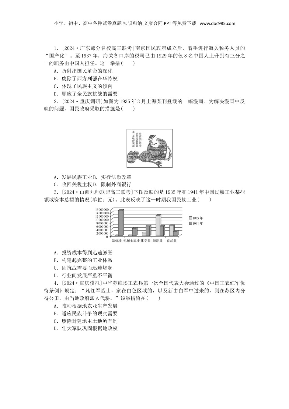小学、初中、高中各种试卷真题知识归纳文案合同PPT等免费下载www.doc985.com第17讲南京国民政府的统治和中国共产党开辟革命新道路真题引领——在体验中品悟真谛【示例】[2021·辽宁卷,7]1933年8月,毛泽东在一份报告中指出,中央苏区各地“忽视经济建设的重要性”“没有把经济建设这个任务宣传到广大群众中去”。他强调必须注意经济工作,要在苏区“普遍建设谷仓,建设备荒仓”“巩固金融,发展贸易”。此时强调经济工作意在()A.进行经济结构调整B.提高防灾抗灾能力C.推动工作重心转移D.为军事斗争做准备[解题流程][答案]【演练1】命题点:南京国民政府统治时期的社会生活[2024·九省联考黑龙江、吉林卷,8]下图为1931年《申报》刊登的某外国品牌汽车广告。这反映出当时()A.西方消费观念得到传播B.民族工商业受到了排挤C.民众生活水平普遍提高D.汽车成为主要交通工具【演练2】命题点:中国共产党探索革命道路的举措[2021·河北卷,9]下表为中共中央及相关组织颁发的部分文件。这些文件集中反映了中国共产党()小学、初中、高中各种试卷真题知识归纳文案合同PPT等免费下载www.doc985.com1935年1月《关于进遵义城的口号和八项注意通令》《关于争取少数民族的指示》《总政治部关于地方工作的指示信》1935年8月《中国苏维埃政府、中国共产党中央为抗日救国告全体同胞书》1935年11月《中央关于发展陕甘游击战争的决定》1936年7月《中央关于土地政策的指示》1936年11月《中央关于青年工作的决定》A.完成革命中心转移B.高度重视群众工作C.将武装斗争与土地革命相结合D.倡导革命统一战线【演练3】命题点:苏区的土地改革的歌谣[2021·福建卷,8]20世纪二三十年代,福建各苏区涌现出大量的民间歌谣并广为流传,如“山歌越唱音越高,二胡来和紫竹箫;苏区山歌像团火,唱得处处红旗飘”。此类歌谣的涌现()A.丰富了民间歌谣的艺术形式B.展现了民间艺术的地域特色C.发挥了土地革命动员的作用D.反映了苏区宣传的巨大成功【演练4】命题点:20世纪30年代中国民族工业的现状[2021·全国甲卷,30]1931~1934年中国钢铁业情况表单位:吨年份铁砂产量铁砂及生铁输出量钢铁消费量钢铁输入量19311840279831652804000557625193218392127584414040004306551933190346699252169400052567319342135031864107770000617726根据上表可知,当时()A.中国民族工业失去发展空间B.民族企业规模日益萎缩C.国民政府实业政策无甚成效D.中国工业基础薄弱落后【演练5】命题点:毛泽东强调革命的群众路线[2021·全国乙卷,29]1934年,毛泽东提出:“我们是革命战争的领导者、组织者,我们又是群众生活的领导者、组织者……在这里,工作方法的问题,就严重地摆在我们的面前。我们不但要提出任务,而且要解决完成任务的方法问题。”当时毛泽东强调改进工作方法意在()A.发动群众参加革命战争B.开辟中国革命的新道路C.建立广泛革命统一战线D.动员社会各界进行抗战创新应用——在训练中提升能力小学、初中、高中各种试卷真题知识归纳文案合同PPT等免费下载www.doc985.com1.[2024·广东部分名校高三联考]南京国民政府成立后,着手进行海关税务人员的“国产化”。至1937年,海关各口岸的税司已由1929年的仅8名中国人上升到有三分之一的职务由中国人担任。这一举措()A.折射出国民革命的深化B.废除了西方列强在华特权C.体现了民族主义的倾向D.顺应了全民族抗战的需要2.[2024·重庆调研]如图为1935年3月上海某刊登载的一幅漫画。为解决漫画中反映的问题,国民政府采取的措施是()A.发展民族工业B.实行法币改革C.收回关税主权D.限制外商银行3.[2024·山西九师联盟高三联考]下图反映的是1935年和1941年中国民族工业某些领域资本总额的情况(单位:元)。此表反映了这一时期我国民族工业()A.投资成本得到迅速膨胀B.构建起完整的工业体系C.因抗战需要而迅速崛起D.行业间发展严重不平衡4.[2024·重庆模拟]中华苏维埃工农兵第一次全国代表大会通过的《中国工农红军优待条例》规定:“凡红军战士,家在白色区域的,以及新由白军中过来的,则在苏区内分得公田,由当地政府派人代耕。”该举措旨在(...