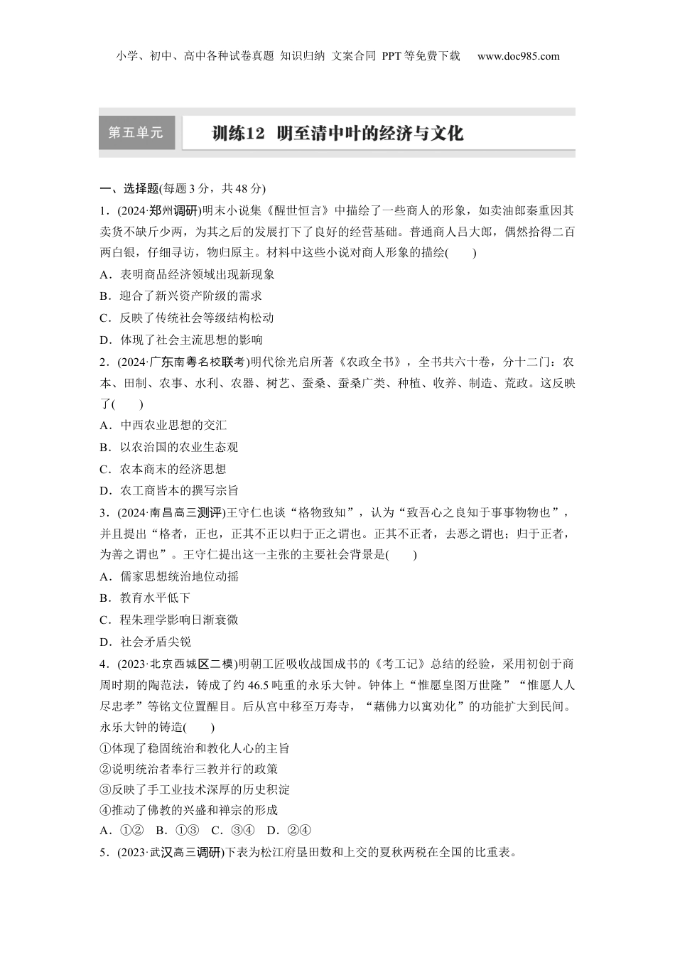 小学、初中、高中各种试卷真题知识归纳文案合同PPT等免费下载www.doc985.com一、选择题(每题3分,共48分)1.(2024·州郑调研)明末小说集《醒世恒言》中描绘了一些商人的形象,如卖油郎秦重因其卖货不缺斤少两,为其之后的发展打下了良好的经营基础。普通商人吕大郎,偶然拾得二百两白银,仔细寻访,物归原主。材料中这些小说对商人形象的描绘()A.表明商品经济领域出现新现象B.迎合了新兴资产阶级的需求C.反映了传统社会等级结构松动D.体现了社会主流思想的影响2.(2024·广南粤名校考东联)明代徐光启所著《农政全书》,全书共六十卷,分十二门:农本、田制、农事、水利、农器、树艺、蚕桑、蚕桑广类、种植、收养、制造、荒政。这反映了()A.中西农业思想的交汇B.以农治国的农业生态观C.农本商末的经济思想D.农工商皆本的撰写宗旨3.(2024·南昌高三测评)王守仁也谈“格物致知”,认为“致吾心之良知于事事物物也”,并且提出“格者,正也,正其不正以归于正之谓也。正其不正者,去恶之谓也;归于正者,为善之谓也”。王守仁提出这一主张的主要社会背景是()A.儒家思想统治地位动摇B.教育水平低下C.程朱理学影响日渐衰微D.社会矛盾尖锐4.(2023·北京西城二模区)明朝工匠吸收战国成书的《考工记》总结的经验,采用初创于商周时期的陶范法,铸成了约46.5吨重的永乐大钟。钟体上“惟愿皇图万世隆”“惟愿人人尽忠孝”等铭文位置醒目。后从宫中移至万寿寺,“藉佛力以寓劝化”的功能扩大到民间。永乐大钟的铸造()①体现了稳固统治和教化人心的主旨②说明统治者奉行三教并行的政策③反映了手工业技术深厚的历史积淀④推动了佛教的兴盛和禅宗的形成A.①②B.①③C.③④D.②④5.(2023·武高三汉调研)下表为松江府垦田数和上交的夏秋两税在全国的比重表。小学、初中、高中各种试卷真题知识归纳文案合同PPT等免费下载www.doc985.com年份垦田占全国百分比夏秋税粮占全国百分比洪武二十六年0.60%6.50%弘治九年0.76%6.23%万历六年0.61%6.24%由上表可知()A.区域经济结构的新变化B.江南地区社会矛盾尖锐C.江南地区赋税负担沉重D.赋税征收标准发生变化6.(2024·安徽皖盟考东联联)明清时期,地方市镇由宋代的草市逐渐演变为完整的商业市镇,而每个市镇都有一定范围的四乡村落作为相对固定的“乡脚”,形成城乡互补的商业格局。这从侧面反映了()A.城市职能格局的演变B.农产品的商品化趋势C.政府放松商业的控制D.市镇空间的相对独立7.清朝时期,中国扇商察觉到西方人的审美偏好,专门制造出了一种中西结合风格的扇子品种——外销扇,其制造基地设在广州十三行,制作工艺上追求极致的奢华繁复,深受欧洲人喜爱。这表明,清朝时期()A.官营手工业技艺领先民营B.政府积极支持对外贸易与交流C.区域间长途贩运贸易发达D.中国经济与世界市场联系紧密8.中国瓷器享誉古代世界。随着新航路开辟,明清时期出现纹章瓷,它是外销瓷的一个种类,是中国工匠按照西欧商人提供的纹饰图案(如图)专为当时西欧贵族烧制的特殊瓷器。据此可知()A.中国被迫卷入世界市场B.中国瓷在欧洲已经普及C.中外交流丰富瓷器品类D.西欧封建贵族沉迷享乐9.(2023·州三模苏)1592年利玛窦来华后,了解中国传统文化、中国人思维和行为方式,盛小学、初中、高中各种试卷真题知识归纳文案合同PPT等免费下载www.doc985.com赞孔子为“中国哲学家之中最有名”者,证明基督教与儒家有相通之处。利玛窦在南昌被称为“利举人”,在北京被称为“利进士”。这说明了()A.选官制度呈现开放特征B.儒家文化顺应时代发展C.入乡随俗助力西学东渐D.东西文化相互吸收借鉴10.(2024·洛高三考阳调研试)顾炎武编修《肇域志》,“先取一统志,后取各省府州县志,后取二十一史参互书之”,内容上遍涉边防、要塞、农田、水利、赋役、粮食、屯田、矿产、交通等与现实生活、百姓利益相关的问题,密切联系“天下利病,生民疾苦”。这表明顾炎武()A.改变了学术发展方向B.注重历史研究C.重建了儒家思想体系D.倡导经世致用11.(2024·浙江百校调研)李时珍在《本草纲目》中指出,世界的本原是气,宇宙万物皆由气所化生,强调“医者...