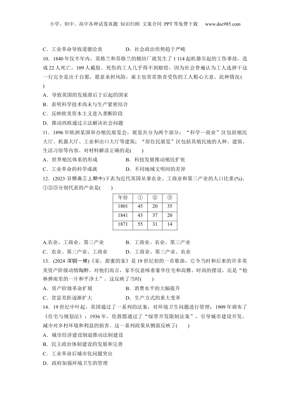 小学、初中、高中各种试卷真题知识归纳文案合同PPT等免费下载www.doc985.com一、选择题(每题3分,共48分)1.(2024·北京海淀高三上期末区)对下图所示现象解释正确的是()16世初和纪1800年洲部分家人口比例欧国纯农业(%)A.欧洲各国工业化发展程度不均衡B.圈地运动不利于英国农业的发展C.荷兰取得“海上马车夫”的地位D.海外殖民活动阻碍西班牙的发展2.(2023·广六校高三考东联)1701年,一位英国人在《东印度贸易观感》一文中写道:“当东印度贸易向我们提供比我们更为便宜的货物,它将迫使我们去发明加工工序和机器,使我们有可能以比较少的劳力和成本进行生产,从而把我们制成品的价格降下来。”以上史料()A.揭示了工业革命发生的根源B.证明印度生产技术先进C.丰富了工业革命研究的视角D.反映亚洲明显贸易优势3.有历史学家在考察19世纪欧洲运输革命与工业革命的关系时指出:“这种运输设施的开展,使先前未曾开发地区卷入世界经济活动内,更因其克服运输量、畜力、季节及移动速度等限制……工业革命成果得以扩大。”该历史学家所说的“运输革命”最有可能是()A.轮船的通航B.汽车的量产C.铁路的兴起D.运河的开通4.1854—1856年英出口易所占比例表国进贸份额原材料食品工业制造品出口贸易7%8%85%进口贸易61%33%6%该表可以反映此时英国()A.工业生产结构的失衡B.有强大的贸易竞争优势C.奉行自由贸易的政策D.有最广阔的海外殖民地5.19世纪后期,英国的银行家们更关注世界范围的投资,到一战前,英国投资几乎占全世小学、初中、高中各种试卷真题知识归纳文案合同PPT等免费下载www.doc985.com界总投资额的一半。1865-1914年的英国投资中,本土投资只占30%,其他70%的资金投在国外。这一状况()A.推动了英国的工业革命B.确立了英国的殖民霸权C.削弱了美德等竞争对手D.制约了英国的技术更新6.下图是1870年与1913年主要资本主义国家在世界贸易中的占比示意图,该图反映了()1870年1913年A.工业革命在全球的扩展B.世界殖民体系的衰落C.英法本土工业日益萎缩D.美英之间的矛盾加剧7.(2024·葫芦高三上期末岛)对下图所示信息,解读正确的是()美、德制造占世界制造量的业业总产份额(位:单%)A.机器制造业的发展标志着工业革命的开始B.工业革命推动了美、德工业经济迅速发展C.美、德两国成为工业革命的发源地和中心D.欧美国家开始从“蒸汽时代”迈入“电气时代”8.(2023·南大附中高三合华师综测试)这个时期(19世纪后半期)逐步出现了技术创新的制度化。更多的先进的工业企业不再满足于接受技术创新并利用它们,而是通过精心的有计划的试验来追寻这种技术创新……许多企业甚至都开始资助基础研究和应用研究。这一现象()A.促进了工业革命的兴起B.缓解了劳资矛盾C.反映科技与生产的结合D.反映了国家干预9.(2023·十堰高三调研)19世纪,英国的道德学家宣扬自律的重要性:无论多么严厉的法律都不可能使游手好闲的人变得勤勉自持,让大手大脚的人变得未雨绸缪,让醉鬼变得清醒如初。这样的改造只能通过个人的节俭和自律来完成。这反映了当时的英国()A.工人阶层遭受沉重压迫B.经济发展影响社会观念小学、初中、高中各种试卷真题知识归纳文案合同PPT等免费下载www.doc985.comC.工业革命导致道德沦丧D.社会政治形势趋于严峻10.1840年仅半年内,英格兰和苏格兰的棉纺厂就发生了1114起机器引起的工伤事故,造成22人死亡,109人截肢。死伤的工人几乎得不到赔偿,因为社会普遍认为工人选择干这一行完全是出于自愿,愿意承担风险,雇主也常常指责受伤的工人粗心大意。此种情况()A.导致英国的发展滞后于后起的国家B.表明科学技术尚未与生产紧密结合C.反映欧美资本主义进入垄断阶段D.推动西欧通过立法解决社会问题11.1896年欧洲某国举办殖民展览会,展览共分为两个部分:“科学—商业”区包括殖民大厅、机器大厅、工业和出口大厅等建筑;“原住民展览”区包括其殖民地的人种、建筑、生活习俗等内容。对材料解读正确的是()A.世界殖民体系的形成B.科技发展推动殖民扩张C.工业革命的科学成就D.不同地域文明间的差异12.(2023·日照高三上期中)下表为近代英国从事...