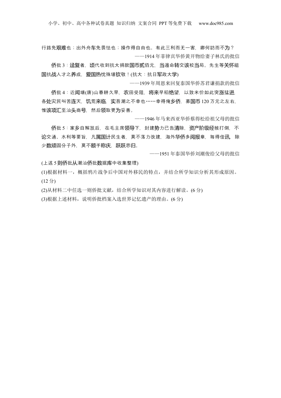 小学、初中、高中各种试卷真题知识归纳文案合同PPT等免费下载www.doc985.com一、选择题(每题3分,共21分)1.(2023·城月考运)19世纪后期,曾国藩在《奏派陈兰彬、容闳选拔幼童出洋习艺折》中专门提出:“诸幼童肄习西学,仍兼讲中学,课以孝经、五经及国朝律例等书,随资高下,循序渐进。”可见当时()A.留学目的是学习西方近代工业B.留学内容以中国传统文化为主C.留学过程注重中西文化的融合D.留学受到中体西用思想的影响2.(2022·衡水模拟)“铁路运输是美国工业化道路中的先行官,对加快太平洋铁路在1869年的通车做出无可替代的历史功绩的,正是远涉重洋沉默奉献的攻无不克的冲锋队和敢死队的外来中国农民工。”对此理解正确的是()A.铁路运输决定了美国工业化的发展B.华工对美国经济发展作出重要贡献C.太平洋铁路对美国经济发展贡献最大D.华工是美国经济发展的主力军3.(2024·一模毕节)17世纪初,原产于中国的茶叶由荷兰人带入欧洲。起初,饮茶的只限于来往东方的荷兰商人、水手和达官贵人。进入18世纪后,饮茶风在欧洲逐渐盛行,很多欧洲人尤其是荷兰人、英国人养成了饮茶的习惯。这可以用来论证()A.商品贸易促进文化传播B.物种交流冲击等级秩序C.文化在互鉴中实现融合D.人口流动影响社会习俗4.(2023·重二模庆)1909年,梁启超作《管子传》,指出亚当·斯密的经济学是以个人为本位,虽“益于人国者虽不少,而弊亦随之”,而“善言经济者,必合全国民而盈虚消长之……吾国有人焉于二千年前导其先河者,则管子也”。梁启超的这一看法()A.阐述了西学中源主张B.表达了对晚清新政的期望C.肯定了本土文化的价值D.发展了孙中山民生主义思想5.(2023·高三模绍兴拟)1928年,南京国民政府颁布了《故宫博物院组织法》及《故宫博物院理事会条例》,规定“故宫博物院隶属于国民政府,掌理故宫及所属各处之建筑、古物、图书、档案之保管、开放及传布之事宜”。院下设秘书处、总务处、古物馆、图书馆、文献小学、初中、高中各种试卷真题知识归纳文案合同PPT等免费下载www.doc985.com馆,至此,故宫博物院大局初定。这从侧面说明当时()A.政府注重对古籍和文化遗产的保护B.中国开始出现近代意义上的博物馆C.故宫博物院已成为国立中央博物院D.通过征集等方式极大丰富文物藏品6.(2022·月考黄冈)民国时期,巴黎的时新服饰三四个月后就会流行于上海。一首流行俚语说道:“人人都学上海样,学来学去不像样,等到学了三分像,上海又变新花样。”材料主要反映出当时()A.巴黎为世界服饰制作中心B.中国物质生活实现了西化C.上海是中外文化交流中心D.文化之间的相互影响7.1931年2月,共青团中央局通过了《团在苏区中的任务决议》,决定开展“共青团员的礼拜六”活动,每星期抽出一天,组织团员、少先队员无偿地帮助红军家属种田,为红军运军粮、挖战壕、送枪械,并创作了歌曲《共产青年团礼拜六》。该活动体现了()A.国民党“围剿”政策的失败B.根据地生产力大幅提高C.患难与共的长征革命精神D.通过劳动推动人的解放二、非选择题(共24分)8.(2023·重南中量庆开学质检测)(24分)侨批(闽南方言中称信为“批”)是海外华侨寄回家乡附带汇款的家书及回文。侨批盛行于19世纪中叶至20世纪70年代,目前整理约有16万件。2013年侨批档案入选联合国《世界记忆遗产》。阅读下列相关材料,回答问题。材料一自古以,粤等地就是海上易、外移民活的地。明期下南洋的来闽区贸对跃区清时华人以商生者居多。片后,西方本主力的入侵和掠,繁的、灾经谋鸦战争资义势夺国内频战乱荒,造成民流离失所,失者日增,海居民遂出海渡洋生。众业濒纷纷谋1860年《北京条》,允英美等在招募年工出。因募者要立契,以出后的工约签订许国华青壮劳国为应订约国抵押取出洋旅,人资为换费时称为“契工约华”,又叫“猪仔卖”。从19世纪60年代至20世初,西方家在我南沿海招募纪国国东“契工约华”超过200万人,在南的橡、古东亚胶园巴的甘蔗、澳洲的金、美洲的中央太平洋路都有大量的契工。园矿铁约华劳动——摘编自刘平《下南洋:晚清海外移民的辛酸历程》材料二批侨1:本日,小宋自演至今,已捐助革命十万,又...