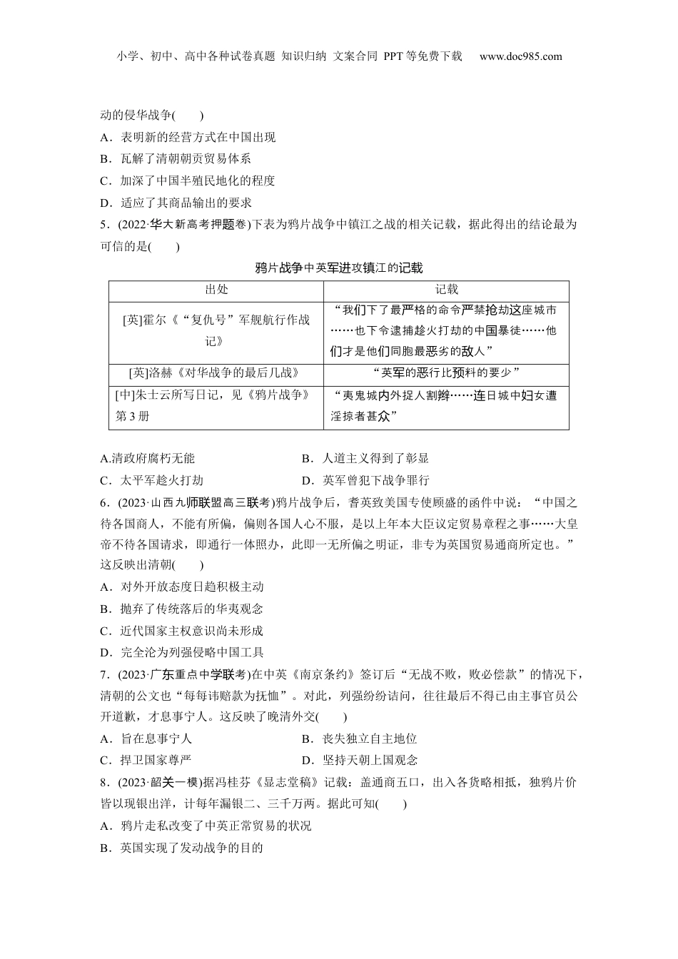 小学、初中、高中各种试卷真题知识归纳文案合同PPT等免费下载www.doc985.com一、选择题(每题3分,共48分)1.鸦片战争前,《泰晤士报》对华报道重点从“经济”和“法律”两个维度出发,将中国描绘成一个“残暴”“无法制”的异质经济体,而在此过程中,中国几乎处于“失语”的状态。这种报道()A.反映了中国的真实状况B.加剧了中英之间贸易摩擦C.助推了鸦片战争的爆发D.推动中国对外政策的转变2.(2023·河北高三考联)鸦片战争之前,林则徐在处置鸦片商贩时,一方面积极查询华特尔编著的《国际公约》;另一方面又依照中国的官僚习惯执法,将所有英国人视为一个集团,要求英商对鸦片贸易集体负责,而不论对个人公平与否。据此可知,当时()A.官员的近代法律意识亟须提高B.地方官僚政治十分腐败C.宗藩体制开始受到威胁和破坏D.国人缺乏对世界的了解3.(2023·九盟高三师联检测)下面为1786-1831年英国东印度公司对华转售棉花数量表(单位:担)。年份数量年份数量1786935721791323071796171554180156063180635477918112949921816463867182134514718263938431831443238据此可以推知()A.英国积极地拓展中国市场B.英国加强了对华经济侵略C.中国成为世界棉纺织中心地D.中国自然经济已逐渐解体4.(2023·河北调研)鸦片战争期间,英国商界多次要求英国政府“负起责任”保护其在华利益。战后,英国政府认为,通过不平等条约“可以用英国极不足道的牺牲来保证眼前巨大的利益和未来更会增大的利益”“可以便利纺织品输入中国各重要省份”。由此可见,英国发小学、初中、高中各种试卷真题知识归纳文案合同PPT等免费下载www.doc985.com动的侵华战争()A.表明新的经营方式在中国出现B.瓦解了清朝朝贡贸易体系C.加深了中国半殖民地化的程度D.适应了其商品输出的要求5.(2022·大新高考押卷华题)下表为鸦片战争中镇江之战的相关记载,据此得出的结论最为可信的是()片中英攻江的鸦战争军进镇记载出处记载[英]霍尔《“复仇号”军舰航行作战记》“我下了最格的命令禁劫座城市们严严抢这……也下令逮捕趁火打劫的中暴徒国……他才是他同胞最劣的人们们恶敌”[英]洛赫《对华战争的最后几战》“英的行比料的要少军恶预”[中]朱士云所写日记,见《鸦片战争》第3册“夷鬼城外捉人割内辫……日城中女遭连妇淫掠者甚众”A.清政府腐朽无能B.人道主义得到了彰显C.太平军趁火打劫D.英军曾犯下战争罪行6.(2023·山西九盟高三考师联联)鸦片战争后,耆英致美国专使顾盛的函件中说:“中国之待各国商人,不能有所偏,偏则各国人心不服,是以上年本大臣议定贸易章程之事……大皇帝不待各国请求,即通行一体照办,此即一无所偏之明证,非专为英国贸易通商所定也。”这反映出清朝()A.对外开放态度日趋积极主动B.抛弃了传统落后的华夷观念C.近代国家主权意识尚未形成D.完全沦为列强侵略中国工具7.(2023·广重点中考东学联)在中英《南京条约》签订后“无战不败,败必偿款”的情况下,清朝的公文也“每每讳赔款为抚恤”。对此,列强纷纷诘问,往往最后不得已由主事官员公开道歉,才息事宁人。这反映了晚清外交()A.旨在息事宁人B.丧失独立自主地位C.捍卫国家尊严D.坚持天朝上国观念8.(2023·韶一模关)据冯桂芬《显志堂稿》记载:盖通商五口,出入各货略相抵,独鸦片价皆以现银出洋,计每年漏银二、三千万两。据此可知()A.鸦片走私改变了中英正常贸易的状况B.英国实现了发动战争的目的小学、初中、高中各种试卷真题知识归纳文案合同PPT等免费下载www.doc985.comC.白银大量外流引发了欧洲“价格革命”D.加剧了中国银贵钱贱的局面9.(2023·大一模庆)下表所示为1844-1863年广州和上海到埠的外国船只数及吨数情况。据表可知,当时()年份船只数吨数广州上海广州上海18443064414209985841849331133142357525471855—437—15719118638673400300500964309A.中国对外贸易逆差扩大B.中国民族工业初步发展C.中国经济重心逐渐南移D.列强对华经济侵略加深10.(2023·沂高三上临质检)陆士谔在其《新上海》中写道:“‘文明’‘野蛮’四个字是绝对相反的。文明了,便不会野蛮;野蛮了,便不能文明。上海则...
