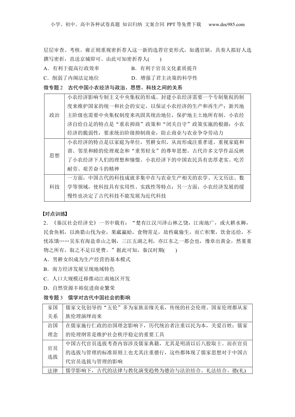 小学、初中、高中各种试卷真题知识归纳文案合同PPT等免费下载www.doc985.com阶段贯通6中国古代史微专题1全面认识专制主义中央集权制度原因(1)封建经济(小农经济)的长期存在是其经济原因(2)法家思想和儒家学说为其提供了理论基础(思想基础)(3)中国特殊的地理环境和气候条件是促成该制度形成和巩固的重要因素(地理原因)(4)统治者政策调整,维护国家统一、社会安定,保证生产发展的需要特点(1)皇权的至高无上和不可分割;皇帝从决策到行使立法、行政、司法等权力具有独断性和随意性(2)帝位终身制和皇位世袭制;从中央到地方的各级官吏一律由皇帝直接任免,不得世袭(3)皇权借助于神权,宣扬“君权神授”等理论;以文化专制巩固政治专制(4)中央和地方、君权和相权的矛盾伴随中央集权制度发展的始终(5)专制主义中央集权制度在明朝时进一步加强,清朝时发展到顶峰影响积极(1)政治:中央能够控制地方,有利于维护社会稳定、国家统一(2)经济:能有效地组织人力、物力和财力进行大规模的经济建设和生产活动(3)民族关系:在统一的社会环境下,各地经济、文化交流更加频繁,民族交融不断加强(4)对外关系:为抵抗侵略、维护主权提供强大的人力、物力和财力保障(5)文化:便利各民族之间文化交流,推动整个中华民族文化水平的提高消极(1)政治:君权集中易形成暴政统治,导致腐败现象的出现(2)经济:在明清时期,严重阻碍资本主义萌芽的产生和发展(3)文化:钳制了人们的思想,使知识分子脱离实际,阻碍科技创新和文化进步(4)对外:明清实行闭关政策,中国逐渐落后于世界发展潮流对点训练1.清代凡遇官员出现空缺,由吏部选拔、审核,内阁审议后奏报皇帝,候选官员还要经过小学、初中、高中各种试卷真题知识归纳文案合同PPT等免费下载www.doc985.com层层审查、考核。雍正则重视密折荐人这一新的选荐官吏形式,如遇官缺,具奏人拟好人选撰写密折,直送京城即可。由此可知密折荐人()A.有利于提高行政效率B.有利于官员文化素质提升C.削弱了内阁法定地位D.增强了君主决策的科学性微专题2古代中国小农经济与政治、思想、科技之间的关系政治小农经济影响专制主义中央集权的形成。封建小农经济需要一个专制集权的制度来维护国家的统一和社会的安定,以保证小农经济的生产和再生产;新兴地主阶级也需要中央集权制度来巩固其统治地位,保护地主土地所有制。小农经济自给自足的特点是“重农抑商”政策和“闭关自守”政策实施的根源;小农经济的脆弱性,要求统治阶级抑制商业,防止商业与农业争夺劳动力思想小农经济的特点是以家庭为单位,男耕女织,从而形成注重孝道、重视家庭和谐、邻里和睦的伦理观念和“重男轻女”的尊卑思想。古代许多文学作品反映了小农经济下人们的理想和憧憬。小农经济下的中国农民具有忠厚老实、吃苦耐劳、艰苦奋斗的精神科技一方面,中国古代的科技成就多集中在与农业生产相关的农学、天文历法、数学等领域,使科技具有实用性、实践性等特点;另一方面,小农经济发展的缓慢性也决定了古代科技不能发展为近代科技对点训练2.《秦汉社会经济史》一书中载有:“楚有江汉川泽山林之饶,江南地广,或火耕水耨,民食鱼稻,以渔猎山伐为业,果蓏蠃蛤,食物常足,故呰窳偷生,而亡积聚,饮食还给,不忧冻饿……吴东有海盐章山之铜,三江五湖之利,亦江东之一都会也,豫章出黄金,然堇堇物之所有,取之不足以更费。”据此可知,秦汉时期()A.男耕女织成为生产经营的基本模式B.南方经济发展呈现地域特色C.人口大规模迁移推动江南地区开发D.自然资源丰裕促进商业繁荣微专题3儒学对古代中国社会的影响家国关系儒家文化创导的“五伦”多为家族亲缘关系,传统的社会伦理、国家伦理都从家族伦理演绎而来治国理念在儒家施行仁政的治国理念影响下,历代统治者注重以民为本,关爱百姓;儒家的伦理纲常是维护社会秩序稳定的重要工具官员选拔中国古代官员选拔考查内容涉及儒家典籍,尤其是明清以后八股取士。而在官员的选拔与管理的标准原则上也尤其注重德行,这些都体现了儒家思想对于中国古代官员选拔与管理的影响法律儒学影响下,古代的法律与教化演变趋势为德治与法治结合、礼法结合、德(礼)小...