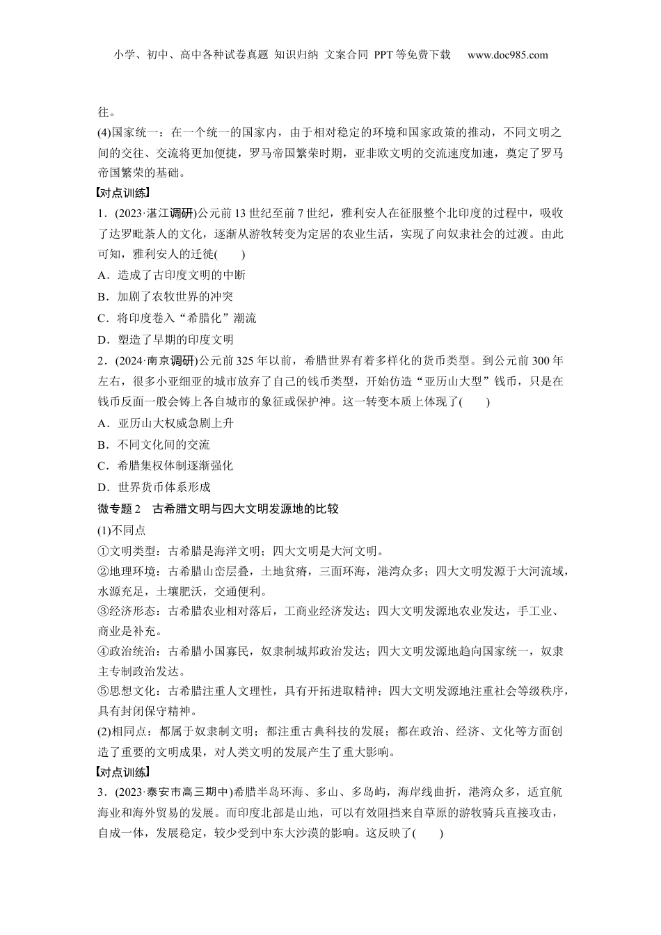 小学、初中、高中各种试卷真题知识归纳文案合同PPT等免费下载www.doc985.com阶段贯通14世界古代史微专题1世界各文明之间交流的主要途径(1)经贸往来:是世界各文明之间交流交往的基本形式,虽然没有扩张和战争引发的交流引人注目,但是,和平的经贸往来是最持久、最深刻的人类文明交往形式。(2)人口迁徙:使不同种族、文明的族群产生接触,从而形成文明之间的相互学习和交流,大大促进了世界文明的发展。世界古代史上,西亚地区的人口迁徙最为复杂,文明之间的交流也最为活跃。(3)军事征服:征服者的文明占据优势地位,往往能够大大加速文明的传播速度。亚历山大帝国扩张是一个典例,它大大促进了希腊文明的传播,是东西方文明一次大规模的交流和交小学、初中、高中各种试卷真题知识归纳文案合同PPT等免费下载www.doc985.com往。(4)国家统一:在一个统一的国家内,由于相对稳定的环境和国家政策的推动,不同文明之间的交往、交流将更加便捷,罗马帝国繁荣时期,亚非欧文明的交流速度加速,奠定了罗马帝国繁荣的基础。对点训练1.(2023·湛江调研)公元前13世纪至前7世纪,雅利安人在征服整个北印度的过程中,吸收了达罗毗荼人的文化,逐渐从游牧转变为定居的农业生活,实现了向奴隶社会的过渡。由此可知,雅利安人的迁徙()A.造成了古印度文明的中断B.加剧了农牧世界的冲突C.将印度卷入“希腊化”潮流D.塑造了早期的印度文明2.(2024·南京调研)公元前325年以前,希腊世界有着多样化的货币类型。到公元前300年左右,很多小亚细亚的城市放弃了自己的钱币类型,开始仿造“亚历山大型”钱币,只是在钱币反面一般会铸上各自城市的象征或保护神。这一转变本质上体现了()A.亚历山大权威急剧上升B.不同文化间的交流C.希腊集权体制逐渐强化D.世界货币体系形成微专题2古希腊文明与四大文明发源地的比较(1)不同点①文明类型:古希腊是海洋文明;四大文明是大河文明。②地理环境:古希腊山峦层叠,土地贫瘠,三面环海,港湾众多;四大文明发源于大河流域,水源充足,土壤肥沃,交通便利。③经济形态:古希腊农业相对落后,工商业经济发达;四大文明发源地农业发达,手工业、商业是补充。④政治统治:古希腊小国寡民,奴隶制城邦政治发达;四大文明发源地趋向国家统一,奴隶主专制政治发达。⑤思想文化:古希腊注重人文理性,具有开拓进取精神;四大文明发源地注重社会等级秩序,具有封闭保守精神。(2)相同点:都属于奴隶制文明;都注重古典科技的发展;都在政治、经济、文化等方面创造了重要的文明成果,对人类文明的发展产生了重大影响。对点训练3.(2023·泰安市高三期中)希腊半岛环海、多山、多岛屿,海岸线曲折,港湾众多,适宜航海业和海外贸易的发展。而印度北部是山地,可以有效阻挡来自草原的游牧骑兵直接攻击,自成一体,发展稳定,较少受到中东大沙漠的影响。这反映了()小学、初中、高中各种试卷真题知识归纳文案合同PPT等免费下载www.doc985.comA.农耕文明优于游牧文明B.古代文明各自独立发展C.地理环境影响文明发展D.历史传统影响古代社会“史料价值”类一、设问类型1.明上述材料究说对研……的史料价。值2.如何认识……史料的价。值3.确史事,明理由。证历实说4.了一步史事,可以收集些史料。为进论证历实还哪二、解题步骤1.,明确方向:明确型。审设问试题类2.提信息,精容。炼内(1)材料源:根据材料出和史料性来处质(是物是文字,是一手是二手实还还)判其史料型断类,分析其作用。并(2)材料容:根据提取的信息,不同的角度行分、和解,一般需要合代内从进类归纳读结时背景分析其作用。3.范用、答案。规语写三、注意事项(一)答题模板小学、初中、高中各种试卷真题知识归纳文案合同PPT等免费下载www.doc985.com(二)史料的分类与价值1.按照史料表现形式(1)文献史料①形式:以文字形式出现,如史书、档案、地方史志、笔记、文集、报刊等。②价值:内容丰富,数量巨大,为历史研究提供了重要的支撑。但受个人、政治、时代等因素影响,部分史料带有很大的主观性。(2)实物史料①形式:以实物的形式出现,如遗址、建筑、器物等。②价值:能较大程度地还原历史,可信度...
