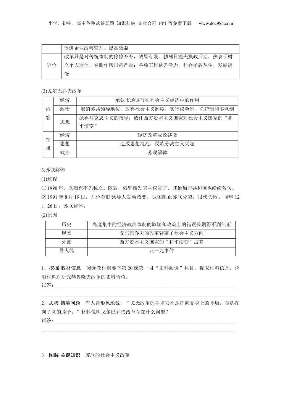 小学、初中、高中各种试卷真题知识归纳文案合同PPT等免费下载www.doc985.com第60讲社会主义国家的发展与变化课程标准了解第二次世界大战后社会主义国家的变化,认识其发展中的成就与问题。考情分析1.频率题型:该部分是高考低频考点,多以选择题的形式出现,主要考查苏联经济改革2.情境设计:多利用文字、图表、漫画等多种形式创设新情境,以经济现象为载体考查重要阶段特征,考查历史学科素养。如(2022·重庆卷,15)苏联对重工业的重视;(2022·河北卷,15)苏联科技的发展;(2022·海南卷,9)中国社会主义的发展3.核心考向:苏联的社会主义改革;中国社会主义的发展知识点一苏联的发展、改革与解体1.苏联的发展(1)成就:恢复和发展了国民经济;相继爆炸了原子弹和氢弹;人民的教育和生活水平也有了很大提高。(2)问题:苏联优先发展重工业的政策没有变化,农业、轻工业落后的局面没有改观。2.苏联改革(1)赫鲁晓夫改革内容政治平反冤假错案,强调集体领导,改革干部制度农业加大农业投入,实行农产品收购制工业改革工业管理体制思想1956年,在苏共二十大上作了《关于个人迷信及其后果》的秘密报告评价积极①经济:注入了某些市场经济成分,取得一些成效;推进了农业的发展,耕地面积和粮食产量有所增加②科技:1957年成功发射了世界上第一颗人造地球卫星③思想:打破了对斯大林的个人崇拜局限性①经济:没有突破计划经济体制,国民经济比例仍然严重失调②思想:没有对斯大林的功过作出全面科学的分析,造成严重的后遗症(2)勃列日涅夫改革内容在工业领域推行“新经济体制”改革,扩大企业自主权,利用奖金等经济杠杆小学、初中、高中各种试卷真题知识归纳文案合同PPT等免费下载www.doc985.com促进企业改善管理、提高效益评价改革只是对传统体制的修修补补,效果有限。勃列日涅夫执政后期,热衷于树立个人迷信,专断作风日趋严重;各项工作缺乏活力,社会矛盾丛生,发展缓慢(3)戈尔巴乔夫改革内容经济承认市场调节在社会主义经济中的作用政治取消苏共领导地位,放弃社会主义制度,实行议会制、总统制和多党制思想抛弃马克思主义的指导,放任西方资本主义国家对社会主义国家的“和平演变”结果经济经济改革成效甚微思想造成思想混乱,民族分离主义兴起政治苏联解体3.苏联解体(1)过程①1990年,立陶宛率先独立。随后,俄罗斯发表主权宣言,其他加盟共和国也纷纷效仿。②1991年8月19日,几位苏联领导人发动政变,试图阻止苏联分裂,很快失败。同年12月26日,苏联解体。(2)原因历史高度集中的经济政治体制的弊端和政策上的错误长期得不到纠正现实戈尔巴乔夫的改革背离了社会主义方向外部西方资本主义国家的“和平演变”战略导火线八一九事件1.挖掘·教材信息阅读教材纲要下第20课第一目“史料阅读”栏目,提取材料信息,说明材料对研究赫鲁晓夫改革的史料价值。试答:______________________________________________________________________________________________________________________________________________________2.思考·情境问题有人曾形象地说:“戈氏改革的手术刀不是挥向党身上的肿瘤,而是挥向了党的脖子。”材料说明戈尔巴乔夫改革存在什么问题?试答:______________________________________________________________________________________________________________________________________________________3.图解·关键知识苏联的社会主义改革小学、初中、高中各种试卷真题知识归纳文案合同PPT等免费下载www.doc985.com知识点二东欧剧变与中国社会主义的发展1.东欧的社会主义建设、改革与剧变(1)建设①背景:第二次世界大战胜利前后,东欧各国建立了一系列人民民主国家。②成就:东欧各国着手恢复遭到战争破坏的经济,提高了人民生活水平和教育水平。③问题:大多采取苏联模式,造成国民经济比例失调。(2)改革①原因:在20世五六十年代展程中,指令性和官僚化管理效率低下、纪经济发进计划运转不等越越突出。灵问题来(必选2·第9课)②表现南斯拉夫通过建立社会主义自治制度、权力下放等措施,促进了经济发展。但改革也导致地方主义抬头,民族问题尖锐,...