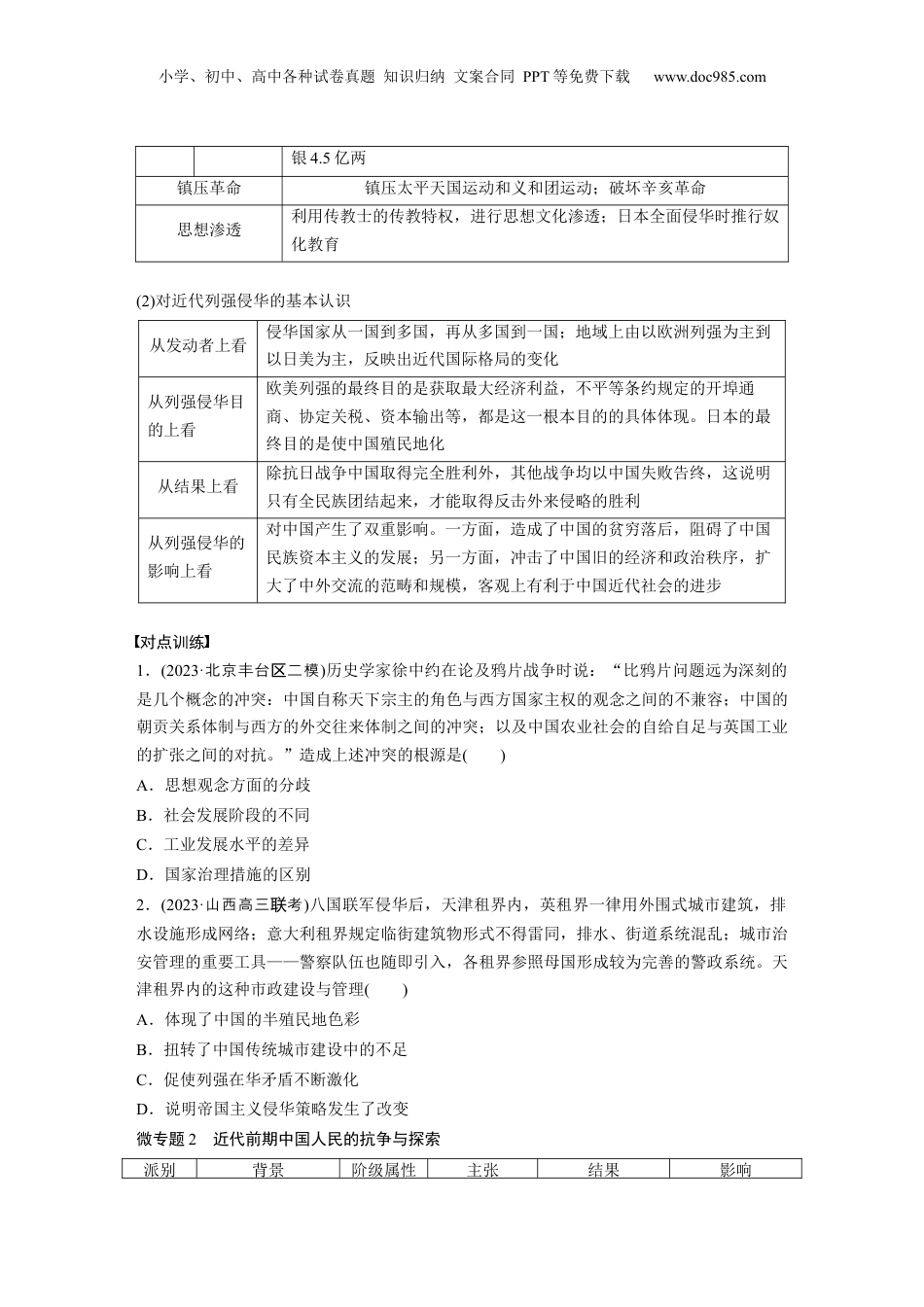 小学、初中、高中各种试卷真题知识归纳文案合同PPT等免费下载www.doc985.com阶段贯通7旧民主主义革命时期(1)微专题1近代史上列强对中国的侵略(1)列强主要侵略方式主要方式表现举例军事侵略近代西方列强主要发动五次大规模的侵华战争,即鸦片战争、第二次鸦片战争、甲午中日战争、八国联军侵华战争、日本全面侵华战争政治侵略割占土地《南京条约》:英国割占香港岛;《北京条约》:英国割占九龙司地方一区;《马关条约》:日本割占辽东半岛、台湾全岛及所有附属各岛屿、澎湖列岛等获取特权《南京条约》附件的“领事裁判权”的规定;《天津条约》规定外国公使进驻北京;《辛丑条约》规定的驻兵权等以华制华从瓜分中国到扶植代理人:慈禧太后、袁世凯等经济侵略开埠通商《南京条约》:广州、厦门、福州、宁波、上海五处;《天津条约》:南京、汉口等十处;《北京条约》:天津;《马关条约》:沙市、重庆、苏州、杭州四处获取特权《南京条约》:中英两国议定关税;《天津条约》:外国商船和军舰可以在长江各口岸自由航行;《马关条约》:允许日本在通商口岸开设工厂;列强攫取海关权、筑路权等战争赔款《南京条约》:向英国赔款2100万银元;《北京条约》赔款英法各800万两白银;《马关条约》赔款白银2亿两;《辛丑条约》赔款白小学、初中、高中各种试卷真题知识归纳文案合同PPT等免费下载www.doc985.com银4.5亿两镇压革命镇压太平天国运动和义和团运动;破坏辛亥革命思想渗透利用传教士的传教特权,进行思想文化渗透;日本全面侵华时推行奴化教育(2)对近代列强侵华的基本认识从发动者上看侵华国家从一国到多国,再从多国到一国;地域上由以欧洲列强为主到以日美为主,反映出近代国际格局的变化从列强侵华目的上看欧美列强的最终目的是获取最大经济利益,不平等条约规定的开埠通商、协定关税、资本输出等,都是这一根本目的的具体体现。日本的最终目的是使中国殖民地化从结果上看除抗日战争中国取得完全胜利外,其他战争均以中国失败告终,这说明只有全民族团结起来,才能取得反击外来侵略的胜利从列强侵华的影响上看对中国产生了双重影响。一方面,造成了中国的贫穷落后,阻碍了中国民族资本主义的发展;另一方面,冲击了中国旧的经济和政治秩序,扩大了中外交流的范畴和规模,客观上有利于中国近代社会的进步对点训练1.(2023·北京丰台二模区)历史学家徐中约在论及鸦片战争时说:“比鸦片问题远为深刻的是几个概念的冲突:中国自称天下宗主的角色与西方国家主权的观念之间的不兼容;中国的朝贡关系体制与西方的外交往来体制之间的冲突;以及中国农业社会的自给自足与英国工业的扩张之间的对抗。”造成上述冲突的根源是()A.思想观念方面的分歧B.社会发展阶段的不同C.工业发展水平的差异D.国家治理措施的区别2.(2023·山西高三考联)八国联军侵华后,天津租界内,英租界一律用外围式城市建筑,排水设施形成网络;意大利租界规定临街建筑物形式不得雷同,排水、街道系统混乱;城市治安管理的重要工具——警察队伍也随即引入,各租界参照母国形成较为完善的警政系统。天津租界内的这种市政建设与管理()A.体现了中国的半殖民地色彩B.扭转了中国传统城市建设中的不足C.促使列强在华矛盾不断激化D.说明帝国主义侵华策略发生了改变微专题2近代前期中国人民的抗争与探索派别背景阶级属性主张结果影响小学、初中、高中各种试卷真题知识归纳文案合同PPT等免费下载www.doc985.com抵抗派鸦片战争后,先进的中国人惊醒地主阶级师夷之长技以制夷未实践启迪近代中国人向西方寻求救国救民的真理太平天国鸦片战争后,人民负担加重,阶级矛盾、民族矛盾尖锐农民阶级有田同耕,平均分配;以法治国;平等外交等过于理想,与现实环境不符,未能实现沉重打击了中外反动势力,其主张影响后世洋务派太平天国运动和第二次鸦片战争,使清政府面临内忧外患地主阶级师夷长技以自强、求富创办了近代军事工业、民用企业和新式学堂,甲午战争的失败标志着其破产刺激了民族资本主义经济产生,一定程度上抵制了西方经济侵略,培养了一批近代科技人才维新派甲午战后,瓜分狂潮,民族危机空前严重资产阶级兴民权,...