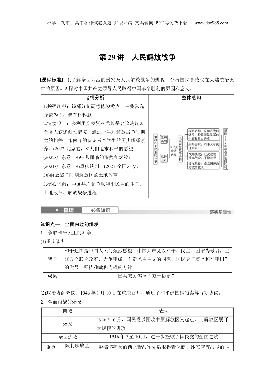小学、初中、高中各种试卷真题知识归纳文案合同PPT等免费下载www.doc985.com第29讲人民解放战争课程标准1.了解全面内战的爆发及人民解放战争的进程,分析国民党政权在大陆统治灭亡的原因。2.探讨中国共产党领导人民取得中国革命胜利的原因和意义。考情分析整体感知1.频率题型:该部分是高考低频考点,主要以选择题为主,偶有材料题2.情境设计:多利用文献资料尤其是会议决议或者名人叙述创设情境,通过学生对解放战争时期党的相关工作内容的认识考查学生的历史解释素养。(2022·北京卷,8)人们追求和平的愿望;(2022·广东卷,9)中共面临的形势和对策;(2021·广东卷,9)重庆谈判;(2021·全国乙卷,30)解放战争时期解放区的土地改革3.核心考向:中国共产党争取和平民主的斗争、土地改革、解放战争进程知识点一全面内战的爆发1.争取和平民主的斗争(1)重庆谈判背景和平建国是中国人民的强烈愿望;中国共产党以和平、民主、团结为号召,主张成立联合政府,力争建成一个新民主主义的国家;国民党打着“和平建国”的旗号,坚持独裁和内战的方针成果国共双方签署“双十协定”(2)政治协商会议:1946年1月10日在重庆召开,通过了和平建国纲领案等五项协议。2.全面内战的爆发阶段表现爆发1946年6月,国民党以围攻中原解放区为起点,向解放区展开大规模的进攻全面进攻1946年7至10月,进一步挫败了国民党的全面进攻重点陕北解放区彭德怀率领的西北野战军先后取得青化砭、沙家店等战役的胜小学、初中、高中各种试卷真题知识归纳文案合同PPT等免费下载www.doc985.com进攻利山东解放区陈毅、粟裕指挥华东野战军取得孟良崮战役的胜利3.国民党政权的统治危机措施影响滥发纸币造成国统区严重的通货膨胀,物价飞涨巧取豪夺导致国统区人民生活水平不断下降《中华民国宪法》暴露了国民党坚持独裁和内战的真面目1.图解·关键知识抗战胜利后的中国时局2.阐释·核心概念第二条战线指解放期在中共党的一政策成功用和影下,民党治广大战争时国产统战线运响国统区爱国学生、工人、市民及其他人民群广泛加的,以反民党政的、裁、政阶层众参对国权内战独卖国策主要容的民主。相于中共党的人民武装反民党的事斗为内爱国运动对国产领导对国军队军而言,是第二。争战线这条战线3.思考·情境问题下是君武先生在抗日后作的一幅漫,名《磨好刀再》。图华战争画为杀这幅画讽刺了当时的什么现象?知识点二新民主主义革命的胜利1.解放区的土地改革(1)内容:1947年夏,中共中央制定《中国土地法大纲》,在各解放区废除封建性及半封建性剥削制度。(2)意义:亿万农民在政治上、经济上获得了解放,他们积极支援解放战争,成为解放战争取得胜利的重要保证。2.解放区的人民政权在解放区设内容政委或人民政府,各自管若干省及以下行政位设军员会辖级单小学、初中、高中各种试卷真题知识归纳文案合同PPT等免费下载www.doc985.com置行政区(必选1·第3课)意义固新的人民政,新中的政建奠定了基巩兴权为国权设坚实础(选必1·第3课)民族区域自治制度1947年,蒙古地成立蒙古自治内区内区(必选1·第13课)发行人民币北人民政府于华1948年12月1日在河北石家庄成立中人民行,国银开始一行人民统发币(必选1·第15课)3.解放战争胜利表现军事胜利战略进攻1947年6月,刘邓大军千里跃进大别山战略决战1948年9月至1949年1月,发动辽沈、淮海、平津三大战役渡江战役1949年4月,解放南京,推翻国民政府统治西柏坡会议(中共七届二中全会)内容党的工作重心必须由乡村转移到城市;提出革命胜利后党在各方面的基本政策;保持党的优良作风意义解决了中国由新民主主义革命向社会主义革命转变的重大问题北平和谈1949年4月,中共代表团和国民党南京政府代表团在北平举行和平谈判,但谈判最终破裂根本原因中国共产党能够始终顺应时代发展的潮流,代表了中国最广大人民的根本利益,得到了广大民众的支持意义是马克思主义普遍原理与中国革命具体实践相结合的胜利,是毛泽东思想的胜利,从根本上改变了中国社会的发展方向,是20世纪人类历史上最具影响的伟大事件之一1.思考·情境问题解放区的土地改革1947年夏,中共中央工作委在河北平山西柏坡召全土...