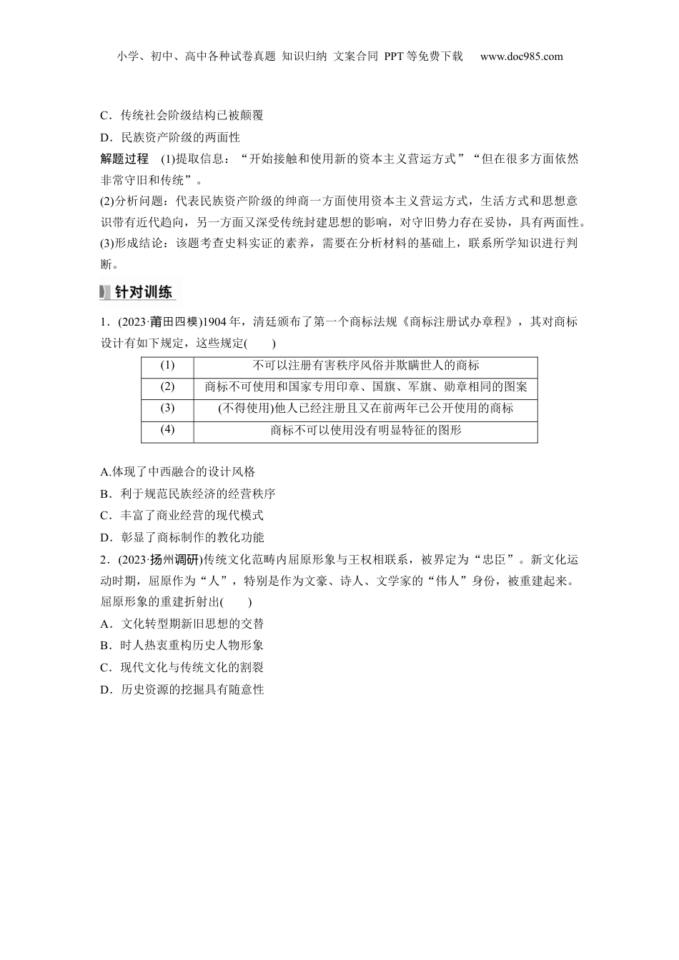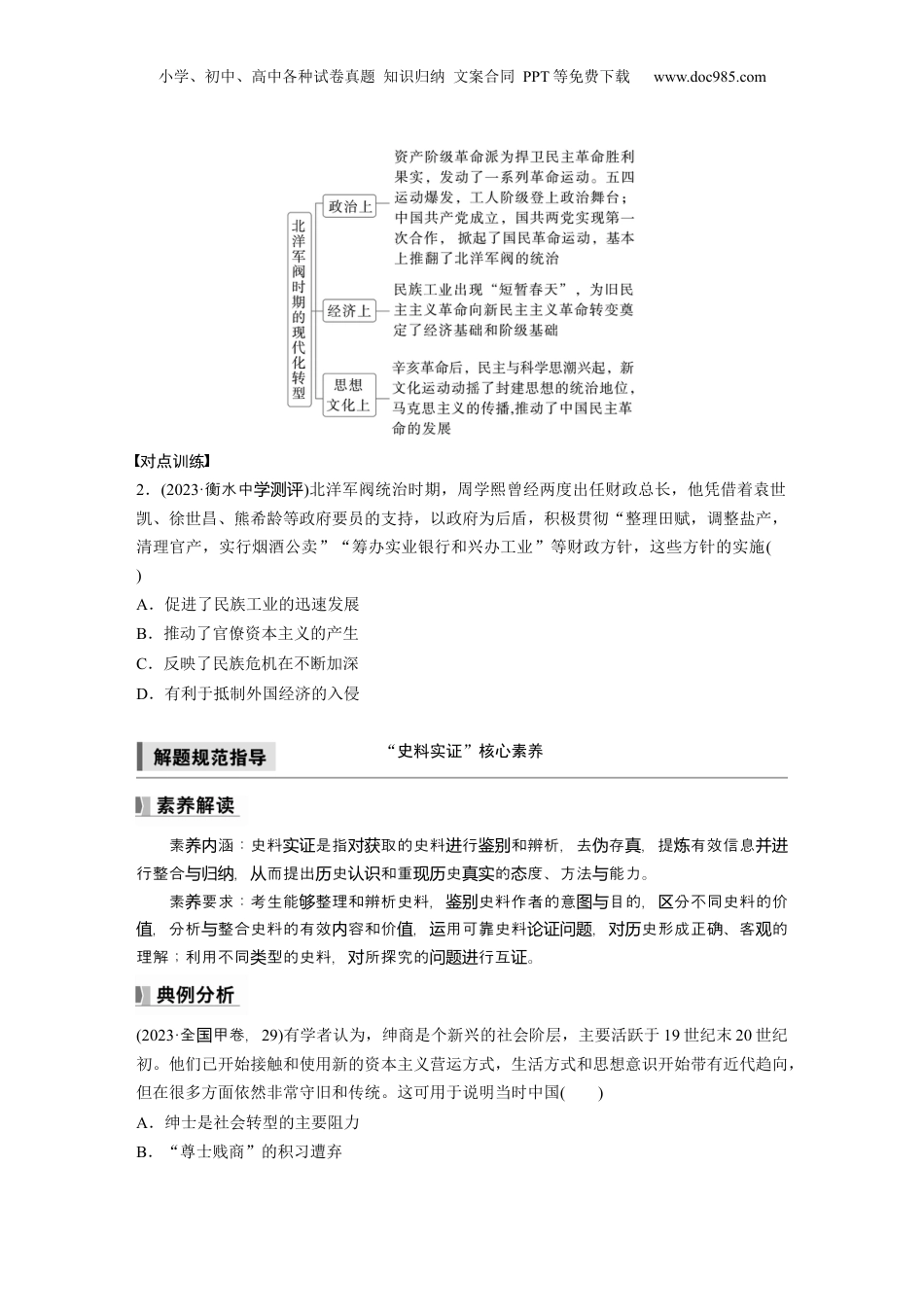 小学、初中、高中各种试卷真题知识归纳文案合同PPT等免费下载www.doc985.com阶段贯通8旧民主主义革命时期(2)微专题1历史理解——从不同史观理解辛亥革命的意义革命史观拉开了中国完全意义上的近代民族民主革命的序幕现代化史观辛亥革命促进了中国政治、经济、思想文化的现代化世界史观辛亥革命是世界资产阶级革命的组成部分,推动了世界资产阶级革命的发展文明史观结束了帝制,建立了共和国,民主共和观念深入人心,是政治精神文明的重大成果社会史观剪辫易服、废除跪拜礼等移风易俗使国民面貌焕然一新对点训练1.(2023·三模资阳)中华民国北京政府废除历代帝王祭祀,北京政府的总统们也没有用国家经费祭祀其列祖列宗。而南京国民政府的历代帝王陵寝祭祀作为“民族扫墓节”的主要内容,是在异族入侵的时代背景下所做的特殊文化宣传。这集中表明近代()A.民主政治因异族入侵而中断B.长期军阀割据导致国家财政拮据C.家国同构宗法社会逐步解体D.帝王祭祀是抵御侵略的主要手段微专题2历史解释——北洋军阀时期的现代化转型小学、初中、高中各种试卷真题知识归纳文案合同PPT等免费下载www.doc985.com对点训练2.(2023·衡水中学测评)北洋军阀统治时期,周学熙曾经两度出任财政总长,他凭借着袁世凯、徐世昌、熊希龄等政府要员的支持,以政府为后盾,积极贯彻“整理田赋,调整盐产,清理官产,实行烟酒公卖”“筹办实业银行和兴办工业”等财政方针,这些方针的实施()A.促进了民族工业的迅速发展B.推动了官僚资本主义的产生C.反映了民族危机在不断加深D.有利于抵制外国经济的入侵“史料实证”核心素养素涵:史料是指取的史料行和辨析,去存,提有效信息养内实证对获进鉴别伪真炼并进行整合,而提出史和重史的度、方法能力。与归纳从历认识现历真实态与素要求:考生能整理和辨析史料,史料作者的意目的,分不同史料的价养够鉴别图与区,分析整合史料的有效容和价,用可靠史料,史形成正确、客的值与内值运论证问题对历观理解;利用不同型的史料,所探究的行互。类对问题进证(2023·全甲卷,国29)有学者认为,绅商是个新兴的社会阶层,主要活跃于19世纪末20世纪初。他们已开始接触和使用新的资本主义营运方式,生活方式和思想意识开始带有近代趋向,但在很多方面依然非常守旧和传统。这可用于说明当时中国()A.绅士是社会转型的主要阻力B.“尊士贱商”的积习遭弃小学、初中、高中各种试卷真题知识归纳文案合同PPT等免费下载www.doc985.comC.传统社会阶级结构已被颠覆D.民族资产阶级的两面性解题过程(1)提取信息:“开始接触和使用新的资本主义营运方式”“但在很多方面依然非常守旧和传统”。(2)分析问题:代表民族资产阶级的绅商一方面使用资本主义营运方式,生活方式和思想意识带有近代趋向,另一方面又深受传统封建思想的影响,对守旧势力存在妥协,具有两面性。(3)形成结论:该题考查史料实证的素养,需要在分析材料的基础上,联系所学知识进行判断。1.(2023·田四模莆)1904年,清廷颁布了第一个商标法规《商标注册试办章程》,其对商标设计有如下规定,这些规定()(1)不可以注册有害秩序风俗并欺瞒世人的商标(2)商标不可使用和国家专用印章、国旗、军旗、勋章相同的图案(3)(不得使用)他人已经注册且又在前两年已公开使用的商标(4)商标不可以使用没有明显特征的图形A.体现了中西融合的设计风格B.利于规范民族经济的经营秩序C.丰富了商业经营的现代模式D.彰显了商标制作的教化功能2.(2023·州扬调研)传统文化范畴内屈原形象与王权相联系,被界定为“忠臣”。新文化运动时期,屈原作为“人”,特别是作为文豪、诗人、文学家的“伟人”身份,被重建起来。屈原形象的重建折射出()A.文化转型期新旧思想的交替B.时人热衷重构历史人物形象C.现代文化与传统文化的割裂D.历史资源的挖掘具有随意性