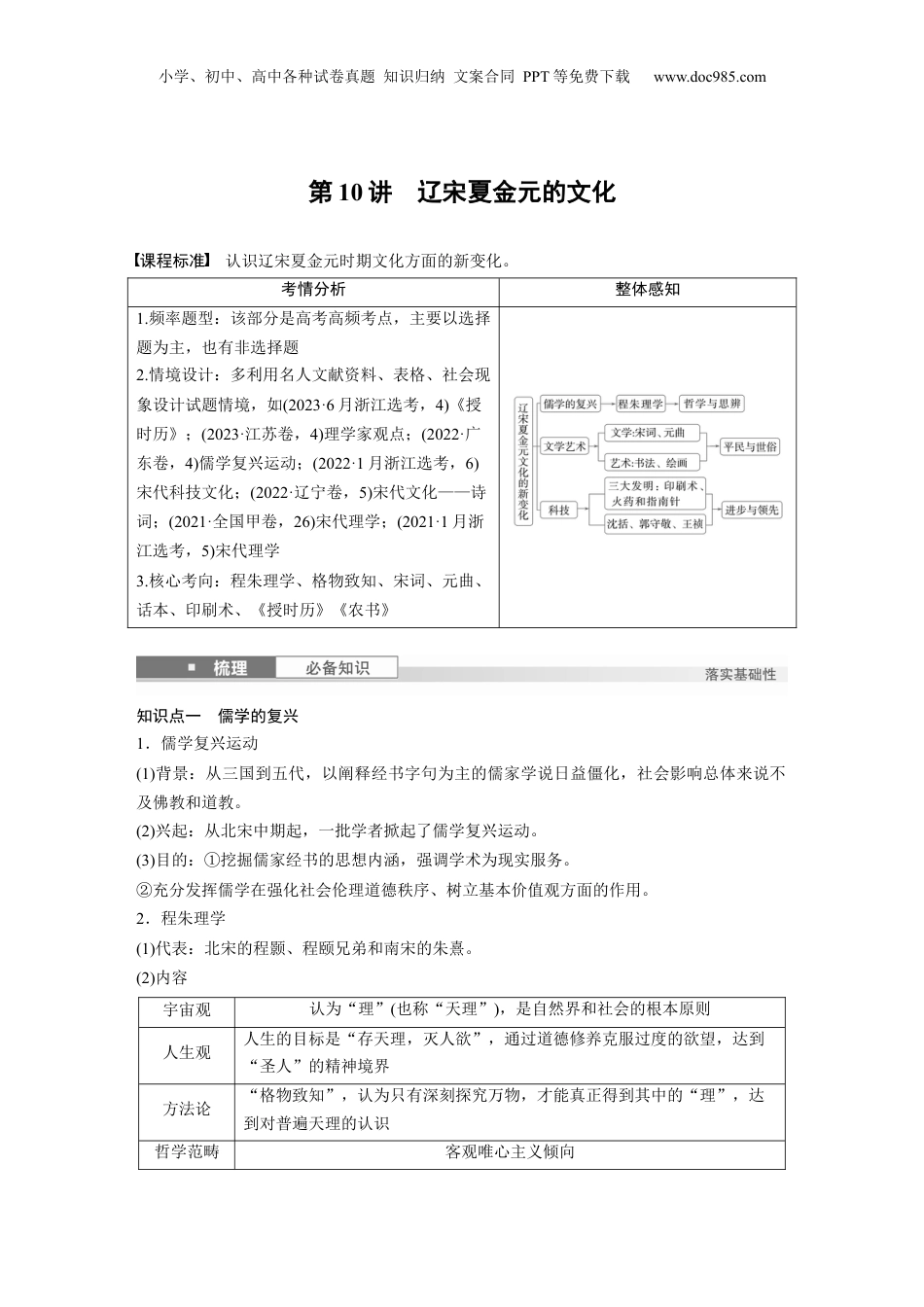 小学、初中、高中各种试卷真题知识归纳文案合同PPT等免费下载www.doc985.com第10讲辽宋夏金元的文化课程标准认识辽宋夏金元时期文化方面的新变化。考情分析整体感知1.频率题型:该部分是高考高频考点,主要以选择题为主,也有非选择题2.情境设计:多利用名人文献资料、表格、社会现象设计试题情境,如(2023·6月浙江选考,4)《授时历》;(2023·江苏卷,4)理学家观点;(2022·广东卷,4)儒学复兴运动;(2022·1月浙江选考,6)宋代科技文化;(2022·辽宁卷,5)宋代文化——诗词;(2021·全国甲卷,26)宋代理学;(2021·1月浙江选考,5)宋代理学3.核心考向:程朱理学、格物致知、宋词、元曲、话本、印刷术、《授时历》《农书》知识点一儒学的复兴1.儒学复兴运动(1)背景:从三国到五代,以阐释经书字句为主的儒家学说日益僵化,社会影响总体来说不及佛教和道教。(2)兴起:从北宋中期起,一批学者掀起了儒学复兴运动。(3)目的:①挖掘儒家经书的思想内涵,强调学术为现实服务。②充分发挥儒学在强化社会伦理道德秩序、树立基本价值观方面的作用。2.程朱理学(1)代表:北宋的程颢、程颐兄弟和南宋的朱熹。(2)内容宇宙观认为“理”(也称“天理”),是自然界和社会的根本原则人生观人生的目标是“存天理,灭人欲”,通过道德修养克服过度的欲望,达到“圣人”的精神境界方法论“格物致知”,认为只有深刻探究万物,才能真正得到其中的“理”,达到对普遍天理的认识哲学范畴客观唯心主义倾向小学、初中、高中各种试卷真题知识归纳文案合同PPT等免费下载www.doc985.com(3)地位:①“四书”成为先于“五经”的儒学基础读物。②从南宋后期起,程朱理学受到官方尊崇,在历史上产生了深远影响。1.图解·关键知识程朱理学的内涵2.思考·情境问题白鹿洞院位于江西山五老峰下,朱熹在此、,成理播的中心。书庐讲学辩论为学传你如何理解白鹿洞书院的历史价值?试答:________________________________________________________________________答案价值:它对中国古代文化的保存和传播发挥了重要的作用,使儒家经典得以传承。有利于普及大众教育,提高民众素质。知识点二文学艺术和科技1.文学艺术宋词背景①两宋商品经济发展,市民阶层兴起;②两宋城市生活丰富多彩,娱乐场所需要大量的歌词代表豪放派的苏轼、辛弃疾;婉约派的柳永、李清照特点句子长短不等,用来配乐歌唱,根据乐谱分为不同的词牌,各有固定格式元曲散曲比词更灵活、更通俗的长短句配乐诗歌体裁,更加适合市井演唱的需要杂剧特点演员将成套的散曲连缀在一起歌唱,辅以音乐、舞蹈、表演、道白,安排不同的角色,来表达一个完整的故事情节地位元杂剧标志着中国古代戏曲艺术的成熟代表关汉卿、王实甫话本早期的白话小说书画原因商品经济发展和程朱理学影响特点书法追求个性,不拘法度。山水画注重意境和笔墨情趣2.科技成就(1)四大发明①成就:北宋工匠毕昇发明了活字印刷术;火药在宋朝被大量制造并用于军事;指南针在宋朝广泛应用于航海。②外传:8世以后,造逐入中、西及洲,促了洲的育、政治及商纪纸术渐传亚亚欧进欧教业等活的展;火在动发药13世阿拉伯人入洲,推了洲火武器的展,士纪经传欧动欧药发骑阶小学、初中、高中各种试卷真题知识归纳文案合同PPT等免费下载www.doc985.com日衰落;指南的使用,促了洋航行,推了大航海代的到。层渐针进远动时来(必选3·第2课)(2)海洋探索:宋元期,造船工和航海技有了重大步,海船重量、抗沉性能明时艺术进载显提高,磁、用航海和天文定位技广泛用。罗盘实图术应(必选2·第12课)(3)其他:沈括所著《梦溪笔谈》记载和总结了当时的许多科技成果;郭守敬编定的《授时历》测定的数据在当时世界上处于领先地位;王祯编撰的《农书》集北方和南方的农业技术于一体,其中关于农业工具的记载尤为丰富。1.阐释·核心概念市民文学封建社后期,着工商城市的起,适城市居民需要而生的一世俗文,又会随业兴为应产种学称城市文。容大多描市民的社生活和悲离合的故事,反映市民的思想和愿望为学内写会欢阶层。2.图解·关键知识中国不同文学体裁的特点3.思考·情境问题元朝前期人胡祗演表演功力:危...