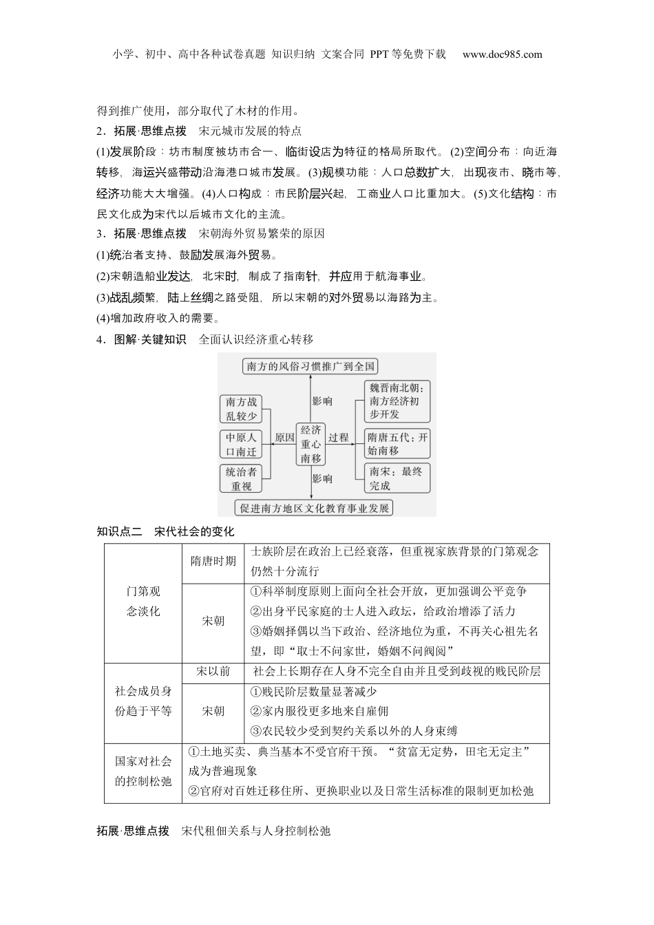 小学、初中、高中各种试卷真题知识归纳文案合同PPT等免费下载www.doc985.com第9讲辽宋夏金元的经济与社会课程标准认识辽宋夏金元时期经济与社会等方面的新变化。考情分析整体感知1.频率题型:该部分是高考高频考点,选择题和非选择题兼顾2.情境设计:多利用文献资料、表格、地图、社会现象设计试题情境,注重考查经济发展与社会的新气象,如(2023·全国甲卷,26)北宋市民生活;(2023·全国乙卷,26)南宋刻书风气;(2023·辽宁卷,4)金人购茶;(2022·全国甲卷,26)宋代手工业;(2022·湖北卷,4)宋代门第观念的变化;(2022·山东卷,3)宋代纺织业;(2021·6月浙江选考,6)宋代海外贸易3.核心考向:两宋时期的农业、手工业和商业发展的新变化;经济重心的南移;两宋时期的社会变化知识点一经济的发展1.农业的发展耕作制度宋朝时,一年两熟的稻麦复种制在南方已经相当普及,有些地方还可以一年三熟,提高了粮食产量经济结构一些地区出现了固定种植某种经济作物的农户,对传统自然经济结构有一定突破棉花种植棉花在内地的种植始于宋朝,在元朝得到大力推广,南方植棉逐渐普遍,带动了棉纺织业的发展边疆开发在辽夏金元统治之下,边疆地区获得进一步开发,漠北、东北、西北、西南的农业都有显著进步2.手工业的发展部门概况地位或作用制瓷业(1)宋朝出现了以五大名窑为代表、风格各异宋元时期,瓷器大量出口海外,成为继丝绸之后中华文明小学、初中、高中各种试卷真题知识归纳文案合同PPT等免费下载www.doc985.com的瓷器,色彩多变,质感浑厚(2)元朝烧出了新型彩绘瓷器青花瓷和釉里红新的物质象征矿冶业煤的开采量很大,都城东京的居民普遍使用煤作燃料燃料的改进大大提高了金属冶炼的产量和质量印刷业宋元时期发展迅速有力地推动了文化的普及,进一步带动了造纸业的发展3.商业和城市的繁荣基层市场宋朝是中国古代商品经济发展的一个高峰,面向大众的基层市场蓬勃涌现边境贸易宋与辽夏金各政权之间的经济往来十分密切,官方设置榷场进行互市交易,民间贸易也相当活跃货币流通北宋钱币年铸造量最多时高出唐朝十多倍,开始出现纸币——交子;元朝在全国范围内将纸币作为主币发行海外贸易①外贸税收成为宋元两朝国库的重要财源②丝织品、瓷器等远销亚非许多国家和地区,输入中国的商品以香料、珠宝等为主③主要外贸港口有广州、泉州、明州等信贷和商业契约宋代交子、子等始使用,逐取代不少。唐宋以后,契会纸币开渐汇兑业务的用更加广泛。约应(必选2·第7课)城市的兴盛北宋东京、南宋临安、元朝的大都和杭州尤以繁华著称4.经济重心南移唐朝中期以来南方的经济实力增长迅速北宋在经济上对南方依赖明显,户口分布南多北少的格局已定型南宋长江下游和太湖流域一带,成为全国最重要的粮仓,谚语称“苏湖熟,天下足”元朝①南北经济差距继续扩大,全国大部分人口和税收集中在江南②对隋唐时期的大运河进行取直,大大缩短了航程③创造性地开辟了长途海运航线,主要任务是运输江南的粮食1.思考·情境问题《集》卷苏轼诗17:彭城无石炭记载旧(煤)。元丰元年十二月,始遣人于州之西南白土之北。以冶作兵,犀利常云访获镇铁胜……投泥水愈光明,玉流金精泼烁见悍。南山栗林可息,北山何?君作百刀,要万段!渐顽矿劳锻为铸炼斩长鲸为据此我们可以获取哪些历史信息?试答:________________________________________________________________________答案北宋已经使用煤作为冶铁燃料;北宋时期由煤冶炼出来的铁制兵器异常锋利;北宋煤小学、初中、高中各种试卷真题知识归纳文案合同PPT等免费下载www.doc985.com得到推广使用,部分取代了木材的作用。2.拓展·思维点拨宋元城市发展的特点(1)展段:坊市制度被坊市合一、街店特征的格局所取代。发阶临设为(2)空分布:向近海间移,海盛沿海港口城市展。转运兴带动发(3)模功能:人口大,出夜市、市等规总数扩现晓,功能大大增强。经济(4)人口成:市民起,工商人口比重加大。构阶层兴业(5)文化:市结构民文化成宋代以后城市文化的主流。为3.拓展·思维点拨宋朝海外贸易繁荣的原因(1)治者支持、鼓展海外易。统励发贸(2)宋朝造船,北宋,制成了指南,用于...