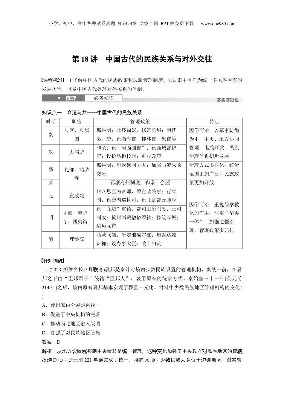 小学、初中、高中各种试卷真题知识归纳文案合同PPT等免费下载www.doc985.com第18讲中国古代的民族关系与对外交往课程标准1.了解中国古代的民族政策和边疆管理制度。2.认识中国作为统一多民族国家的发展历程,以及中国古代处理对外关系的体制。知识点一命运与共——中国古代的民族关系时期职官管理政策特点秦典客、典属国郡县制;北逐匈奴,修筑长城;南抚夷、越;设南海郡、桂林郡、象郡等因俗而治;以军事防御为主;中央、地方协同管理;屯戍开发;民族治理体系初步发展汉大鸿胪和亲;设“河西四郡”;设西域都护府;设护乌桓校尉;屯戍政策隋礼部、鸿胪寺郡县制;册封谯国夫人;加强与流求的交流治理方式多样化;统治范围更加广泛,民族政策更加开放唐羁縻府州制度;和亲;会盟元宣政院封八思巴为帝师,领宣政院事;行省制;设澎湖巡检司;设北庭都元帅府因俗而治;重视儒学教化的作用;注重“华夷一体”;加强边疆治理,管理政策多元化明礼部、鸿胪寺、四夷馆设“九边”重镇;都司卫所制度;土司制度;敕封西藏僧俗领袖;修筑长城;边境互市清理藩院满蒙联姻;平定准噶尔部;册封达赖、班禅;设办事大臣;改土归流针对训练1.(2023·湘豫名校9月考联)属邦是秦针对境内少数民族设置的管理机构,秦统一前,在属邦之下由“臣邦君长”统辖“臣邦人”,袭用原有的统治方式。秦始皇三十三年(公元前214年)之后,境内原有属邦基本实现了郡县一元化。材料中少数民族地区管理机构的变化()A.使国家由分裂走向统一B.促进了中央机构的完善C.推动西北地区融入版图D.加强了对民族地区管辖答案D解析地方置邦到中央置郡是一管理,化加强了中央政府民族地的管从设属统这种变对区辖,故选D;公元前项221年秦完成了一,排除统A;少民族大多位于疆地,其管项数边区对小学、初中、高中各种试卷真题知识归纳文案合同PPT等免费下载www.doc985.com理于地方的管理,中央机的完善无,排除属对与构关B;西北地始被入版是在项区开纳图西期,排除汉时C。项2.(2023·湖南郡中模长学拟)《InAsianFrontiersofChina》是一部围绕长城描述中国古代北方边地的著作。这部书传入国内后,书名被译为《中国的边疆》或《中国的亚洲内陆边疆》。对书名中的“中国”正确的理解是()A.地理概念:国家的中心城市B.政权概念:全国性统一政权C.民族概念:华夏主体的中华民族D.文明概念:农耕文明的主体区域答案D解析城是中古代耕文明和游牧文明的主要分界,翻的籍城作中的长国农线译书将长为国边疆,由此可知,里的这“中国”指的是耕文明的主体域,故应农区选D;材料表明项“描述中古代北方地国边”,非指中心城市,排除并A;元明期,全性一政的中项清时国统权范也包括了城外的部分地,因此,城作疆的分界史不符,排除国围长区长为边线与实B项;中民族包括城外各民族,排除华长内C。项知识点二世界大同——中国古代的对外交往时期阶段表现先秦广泛交流以中原为核心的华夏文明与域外有广泛的交往交流秦汉交往扩大汉朝打通陆海两个通道。97年,甘英出使大秦;东汉时期,倭国派使臣来朝隋唐交流活跃隋唐时期与西域商路畅通,与外国之间海路交流活跃隋朝裴矩驻张掖,掌管通商事务,常骏从南海郡出航到达赤土国唐朝与大食国接触,使包括造纸术在内的中国技术传入阿拉伯地区;日本向唐朝派遣唐使,将唐朝文化带到日本宋元继续发展宋朝因北方陆路交通阻隔,海路转趋发达,泉州成为重要的对外贸易港元朝通往欧洲的海陆通道都很畅通。13世纪,马可·波罗抵达中国,后来留下著名的《马可·波罗行纪》明清缓慢转型在对外关系上致力于维护朝贡体制和朝贡贸易体系,但民间贸易和走私贸易也屡禁不绝1689年,中俄就双方边界订立《尼布楚条约》18世纪,英国马戛尔尼使团来到中国,但清政府关上了对英交往的大门针对训练小学、初中、高中各种试卷真题知识归纳文案合同PPT等免费下载www.doc985.com1.(2023·河北4月适性应训练)某学者总结了唐代对外政策的基本特征及其主要表现,如下表所示。这表明唐代对外交往()基本特征主要表现友好往来、持续推进友好相处总是居于主流,即使在安史之乱时,中外交往也未完全停止量才使用海外人员灵活的...